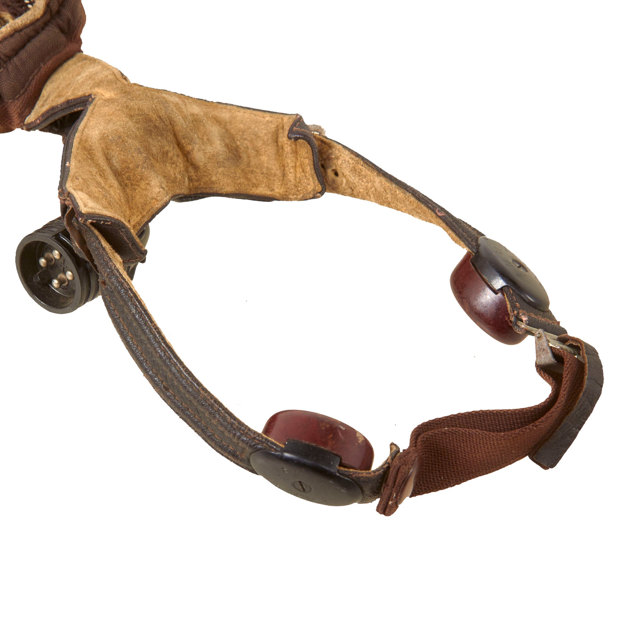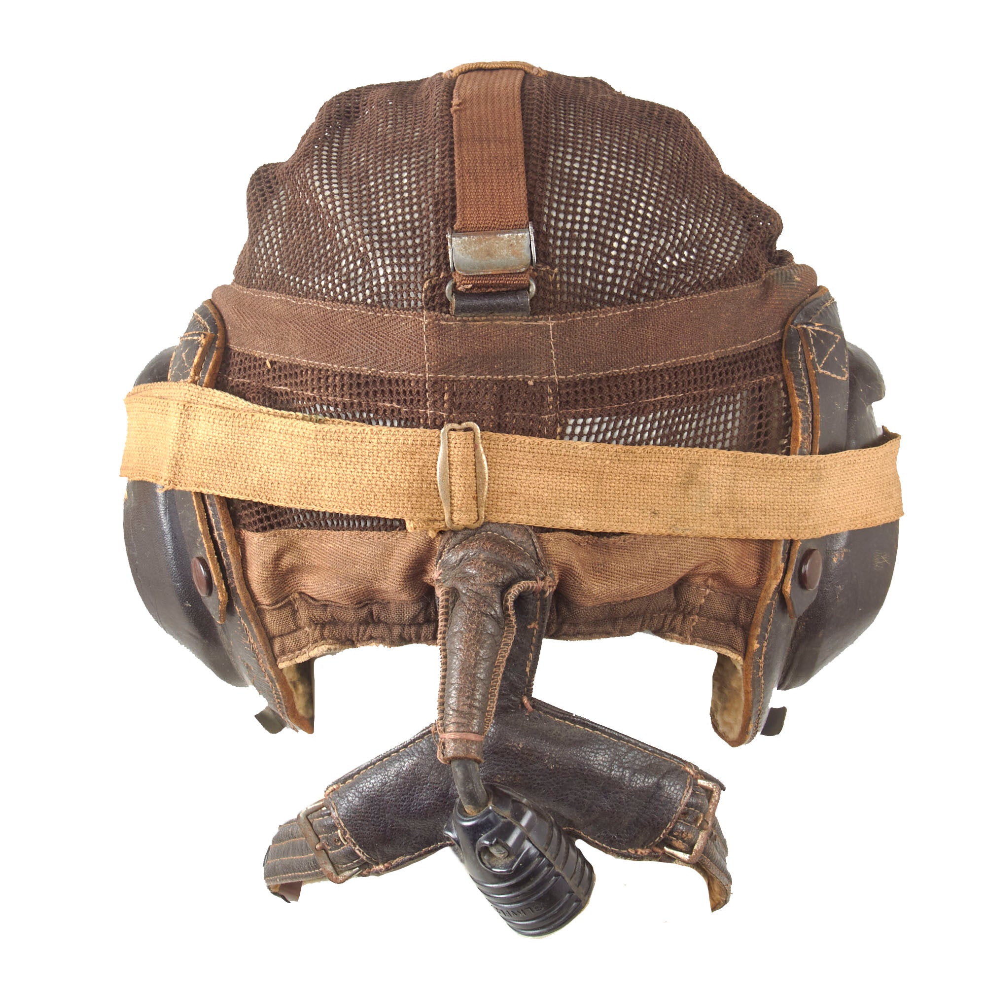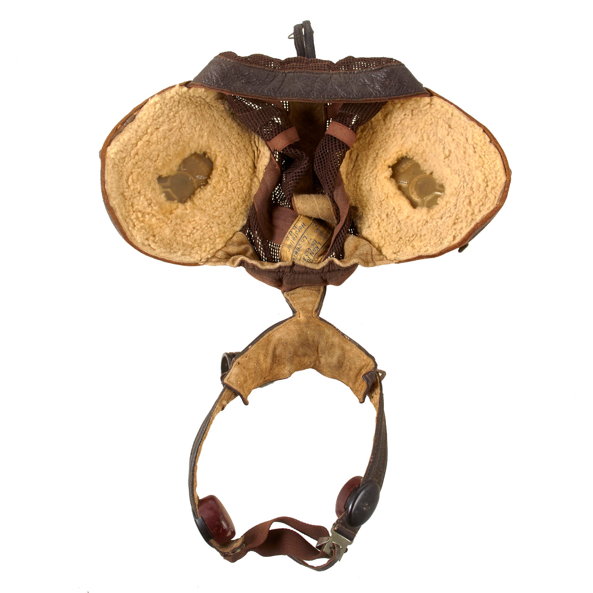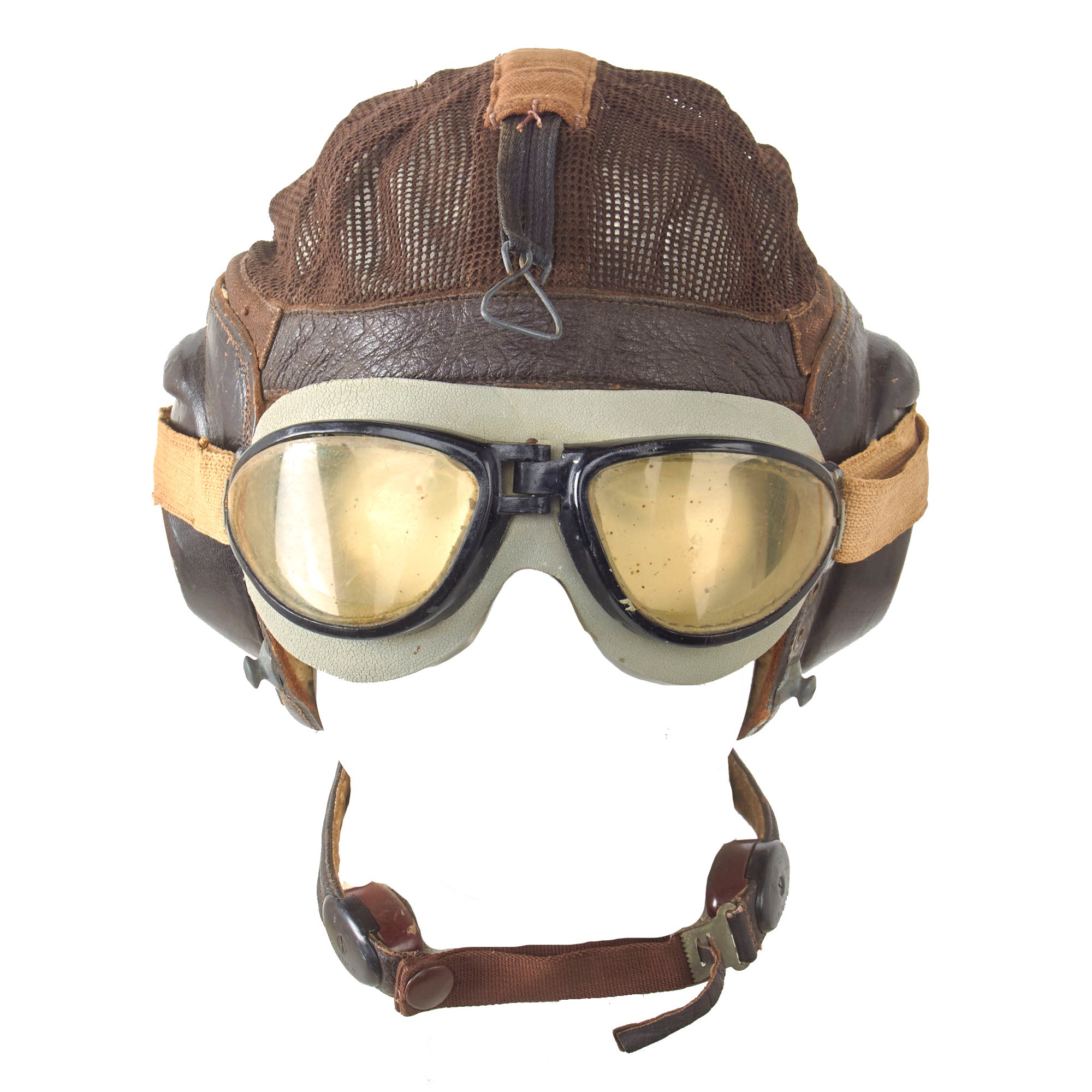 Original Item: Only One Available. The famous net-top helmet proved popular with Luftwaffe pilots as it was designed for comfort and without the restriction of a chinstrap. This classic mesh flying helmet which has become synonymous with Luftwaffe fighter pilots in WW2. This example has a manufacturers label coded hdc indicating it was produced by the firm of Luftfahrtgeraetewerk Hakenfelde GmbH, Berlin-Spandau. Overall condition is great with some minor tearing in the mesh. This example includes the original Avionics and a set of flight goggles.