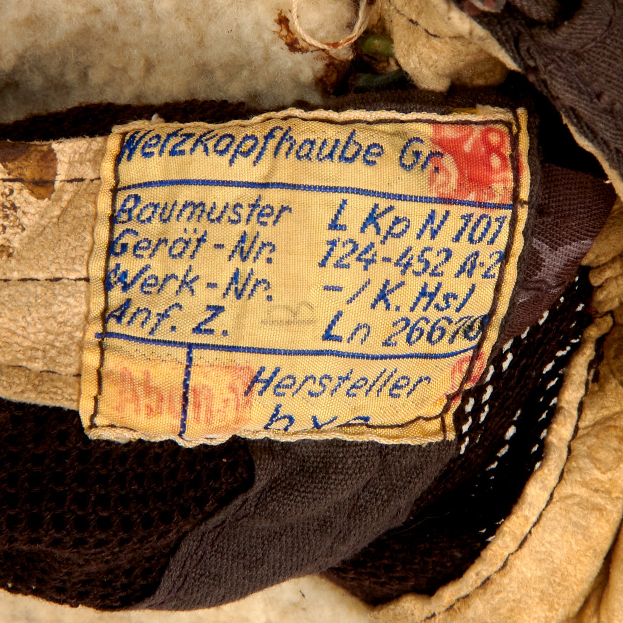 The maker code bxo is for Deutsche Telephonwerke & Kabelindustrie AG of Berlin, a manufacturer of telephone and radio equipment. The helmet is in great overall condition with very few holes in the netting, something we almost never see due to the fragility of the material! But the interior fur is disconnecting from its place. Some of the stitching along the edges of the helmet is also coming undone.