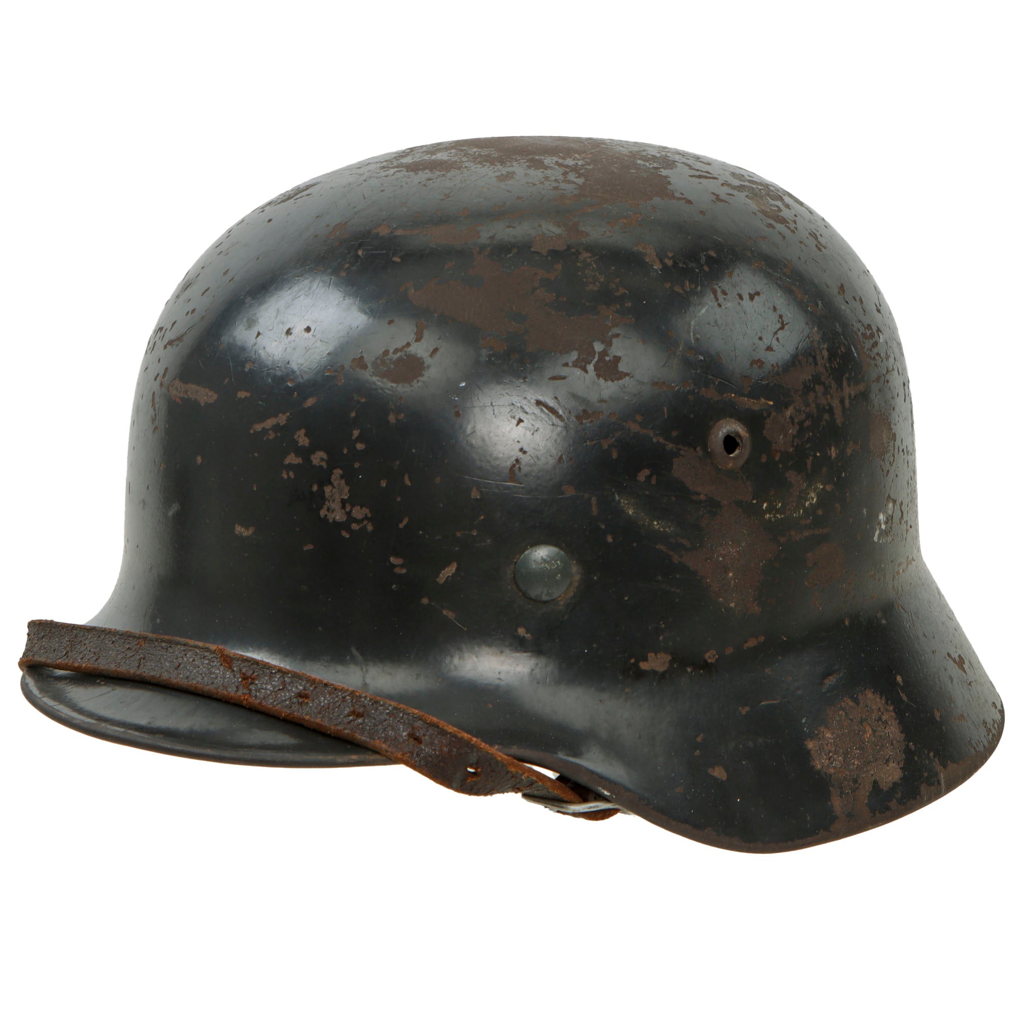 Original Item: Only One Available. This is a lovely honest service used all original example of a Model 1935 German WWII "Double Decal" helmet, with a "sanitized" Luftwaffe Eagle decal on the left side, and a "National Colors" decal on the right. The use of the second decal was discontinued in 1940, and in 1943 it was ordered that helmets with the national colors have them removed, so finding them is somewhat rare. During the post war period, the decal was partly removed, including all of the swas (hook cross) to "sanitize" it for the market.