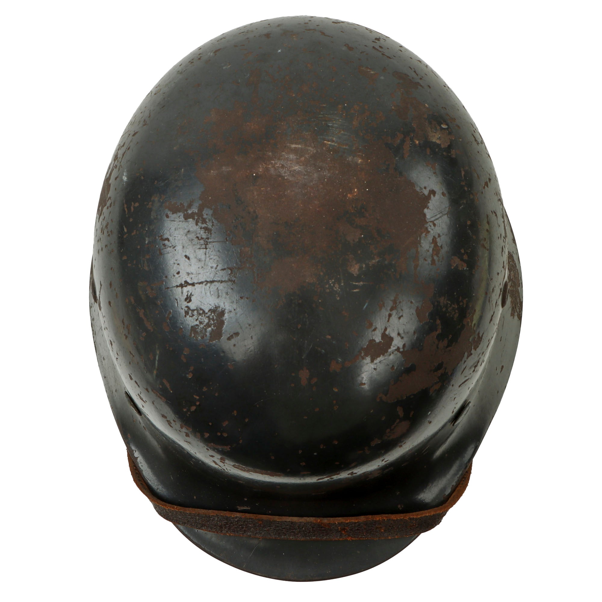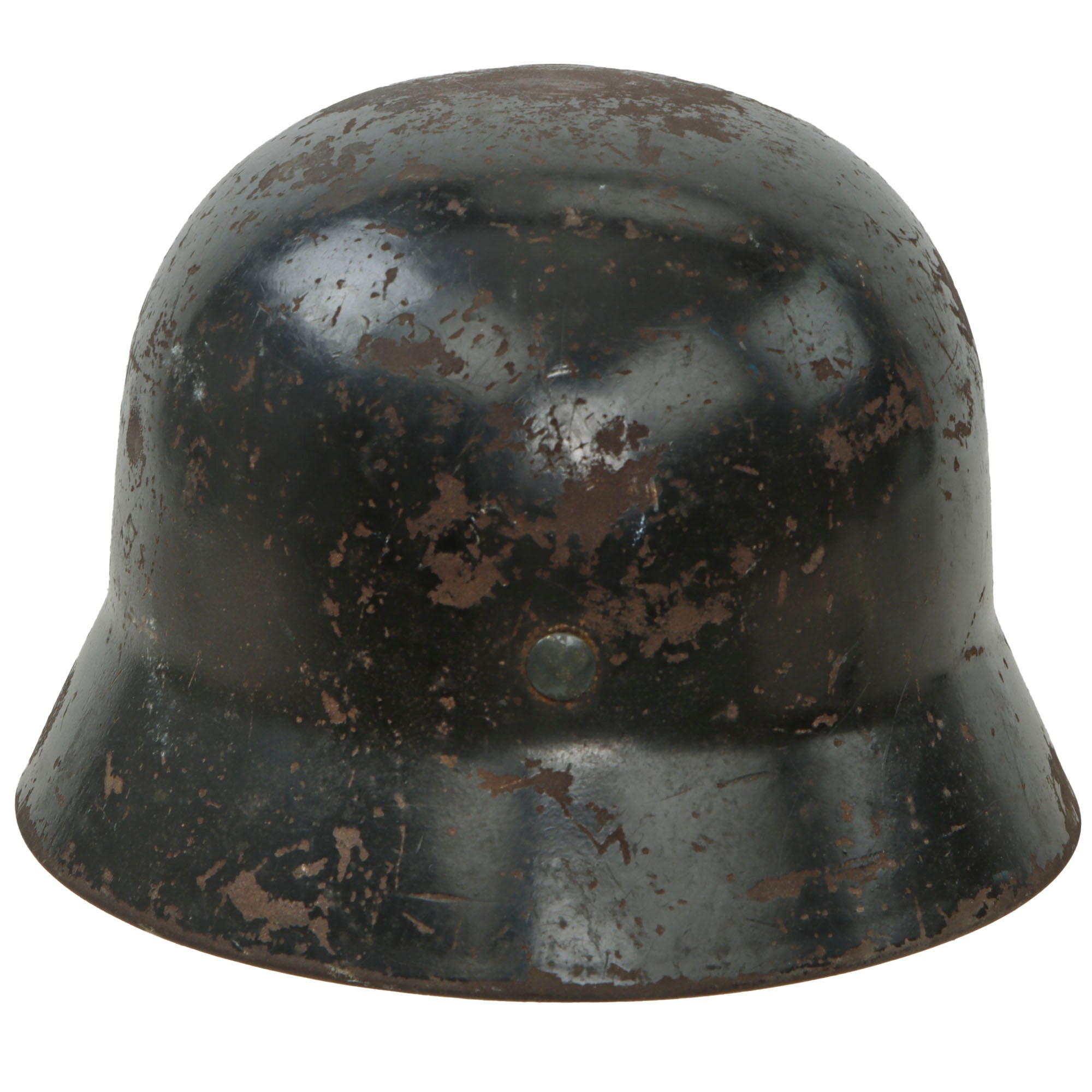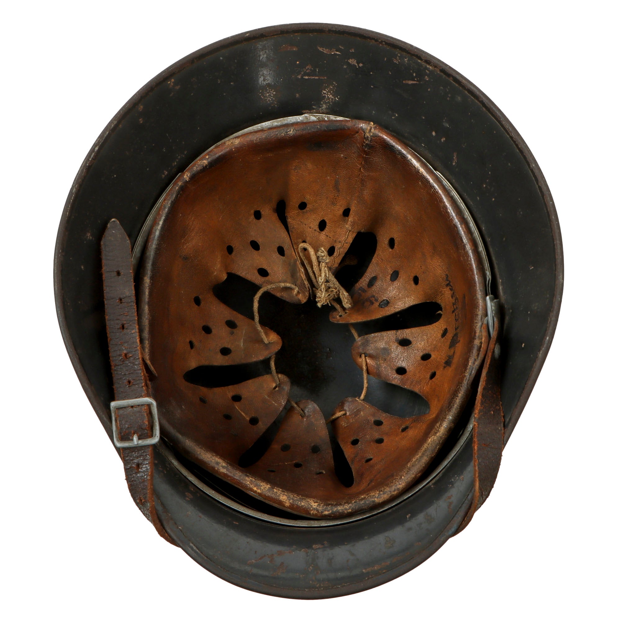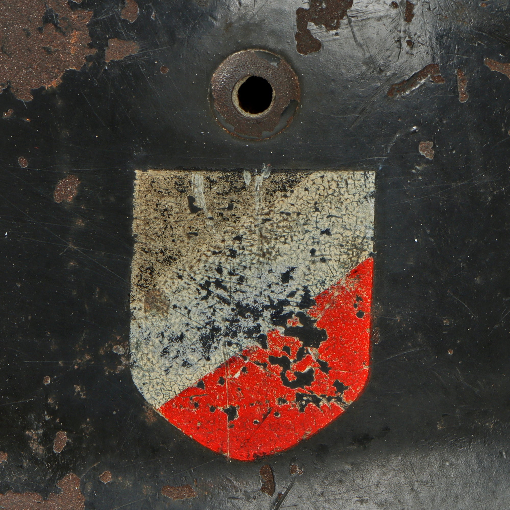 This stamped sheet steel construction helmet retains much of the original correct smooth semi-gloss blue-gray Luftwaffe fliegerblau (flyer's blue) used on early helmets, which would later become textured. It is still well retained on the sides and skirt of the helmet, while the crown area is missing much of the paint, which has allowed the steel shell to oxidize. The interior of the shell has the paint in much better shape, showing only light wear, though there are some areas inside the dome that are missing the paint. The sanitized Luftwaffe eagle decal is retained at less than 25%, while the national colors is much better, retained at about 60%, showing overall wear. This gives the helmet a fantastic aged look that is impossible to duplicate!