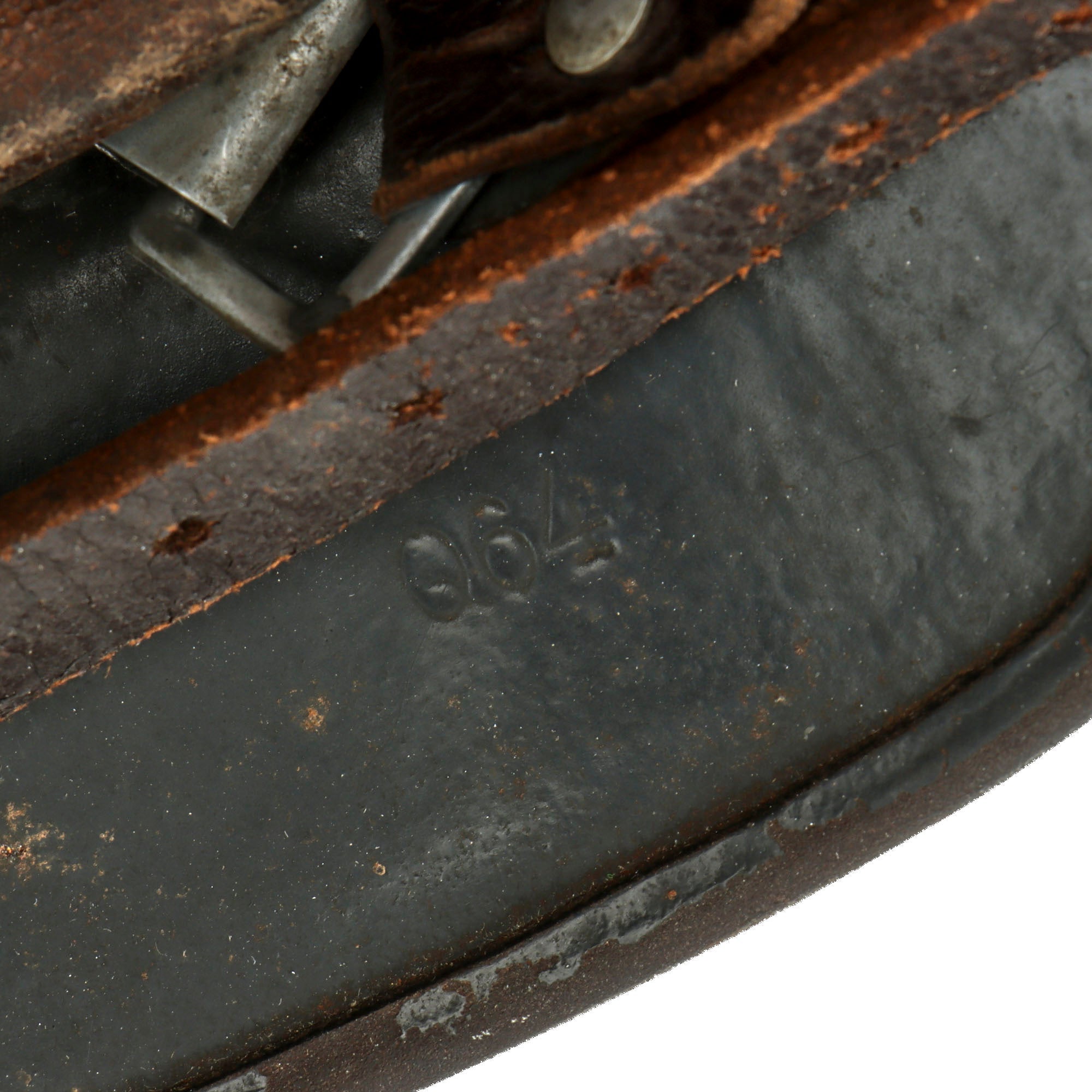 All three liner split pins are still intact, and retain a good deal of the original paint, which is a slightly lighter color than the shell, so these came from the manufacturer pre-painted. The interior of the helmet still has the original M31 leather liner, with all eight of the original "fingers" intact and the top securing tie still present, though the tie is damaged and re-tied. The leather has a lovely chestnut brown color from age and use, and it is still quite supple, with no tearing or other major damage. It looks to have the name W. Prestch written on the inner right side. The liner band is aluminum, with square aluminum chin strap loops attached to reinforced sides. This is the last pattern before the move to galvanized steel bands, as aluminum was scarce. The left exterior of the liner band is marked 64 n.A 56, indicating that it is a size 56 liner for a size 64 shell, and there is also 56 stamped directly on the leather. The right side displays the full manufacture information, as well as a date: