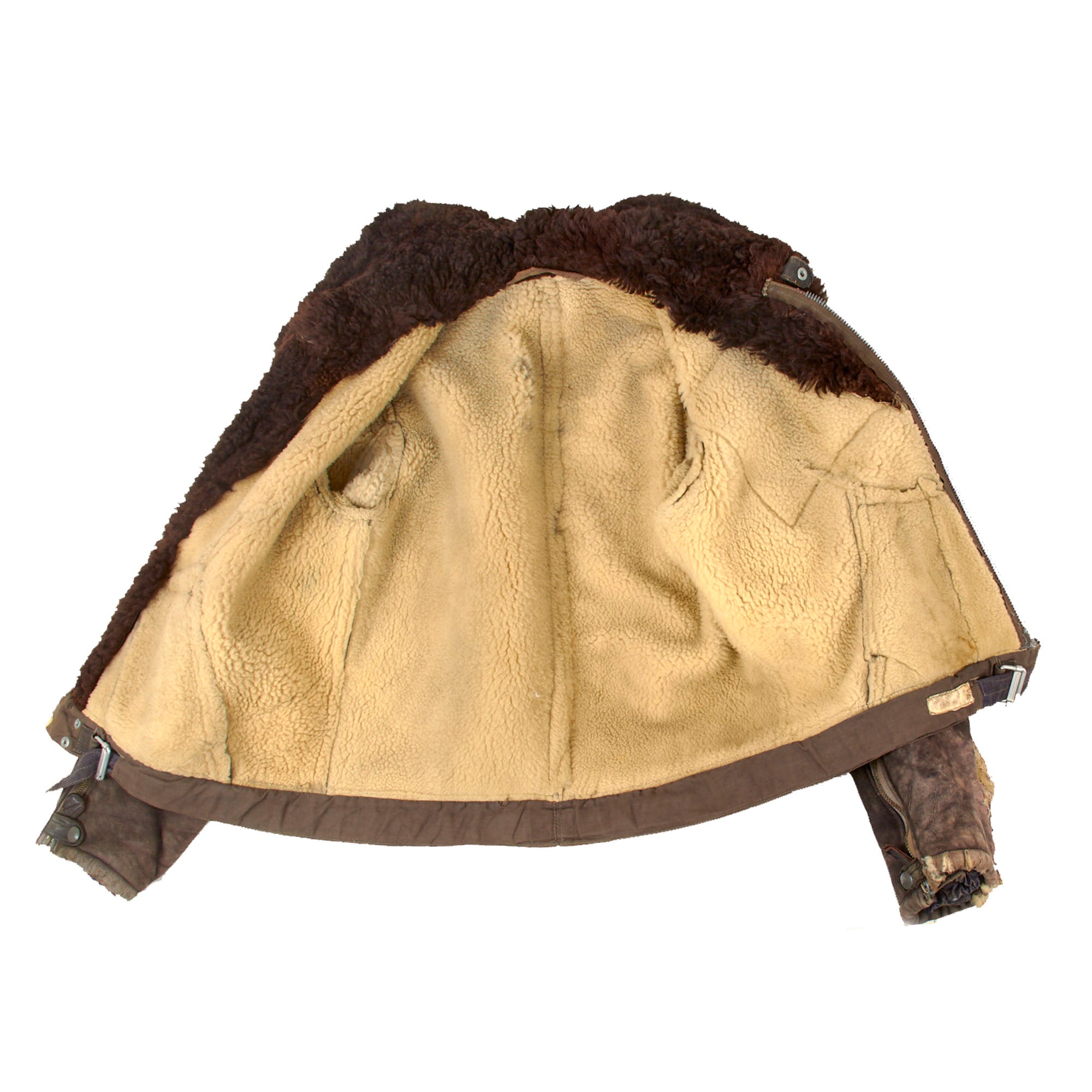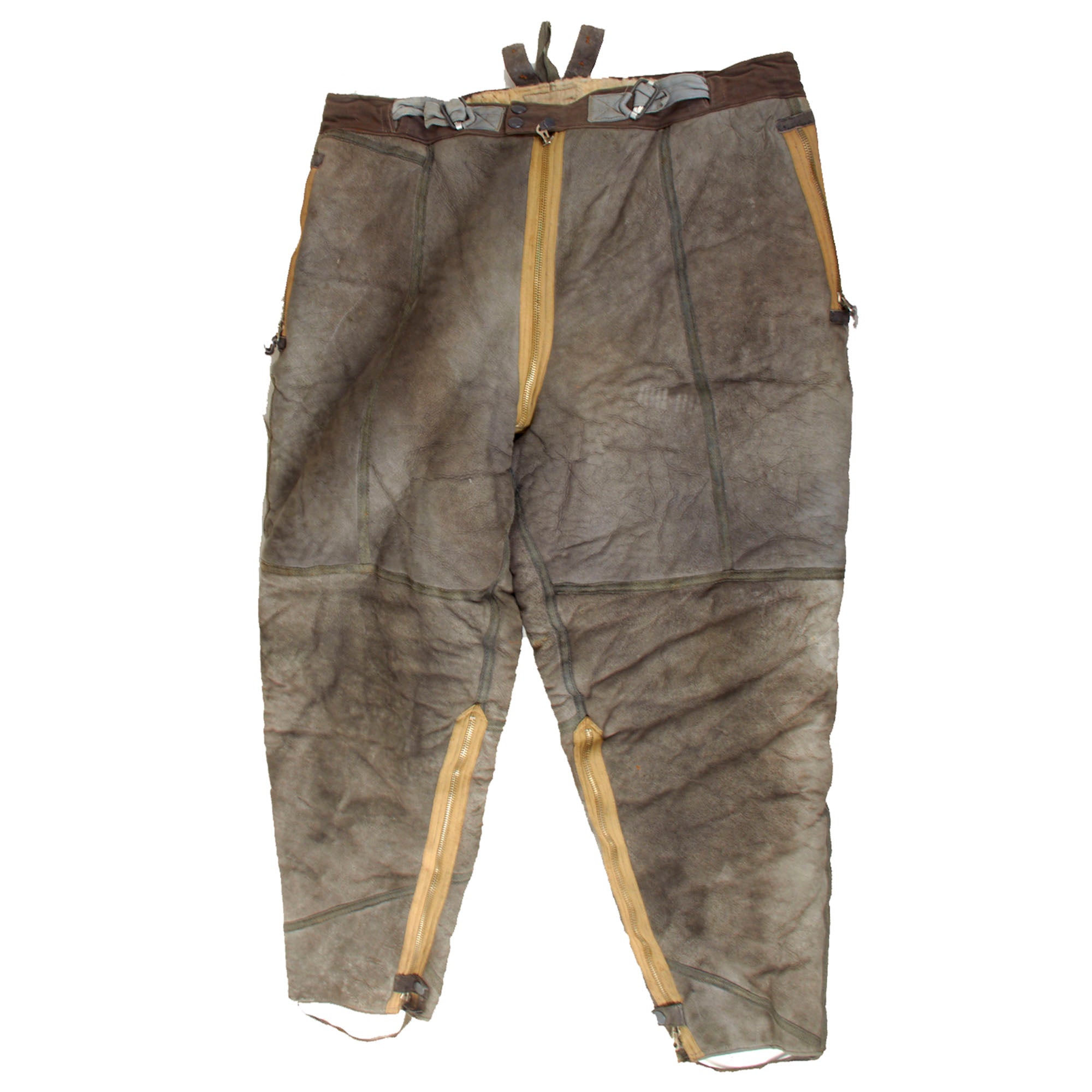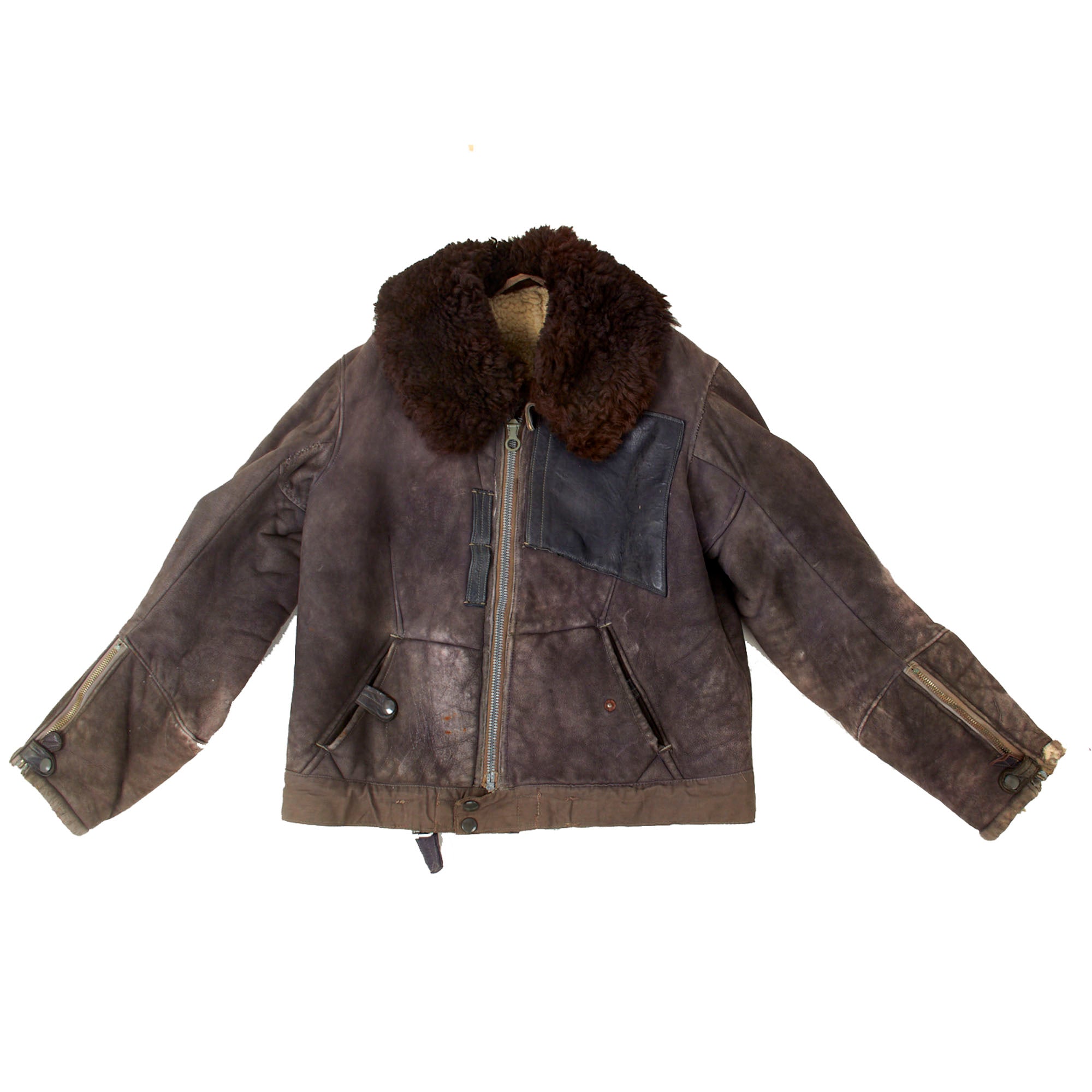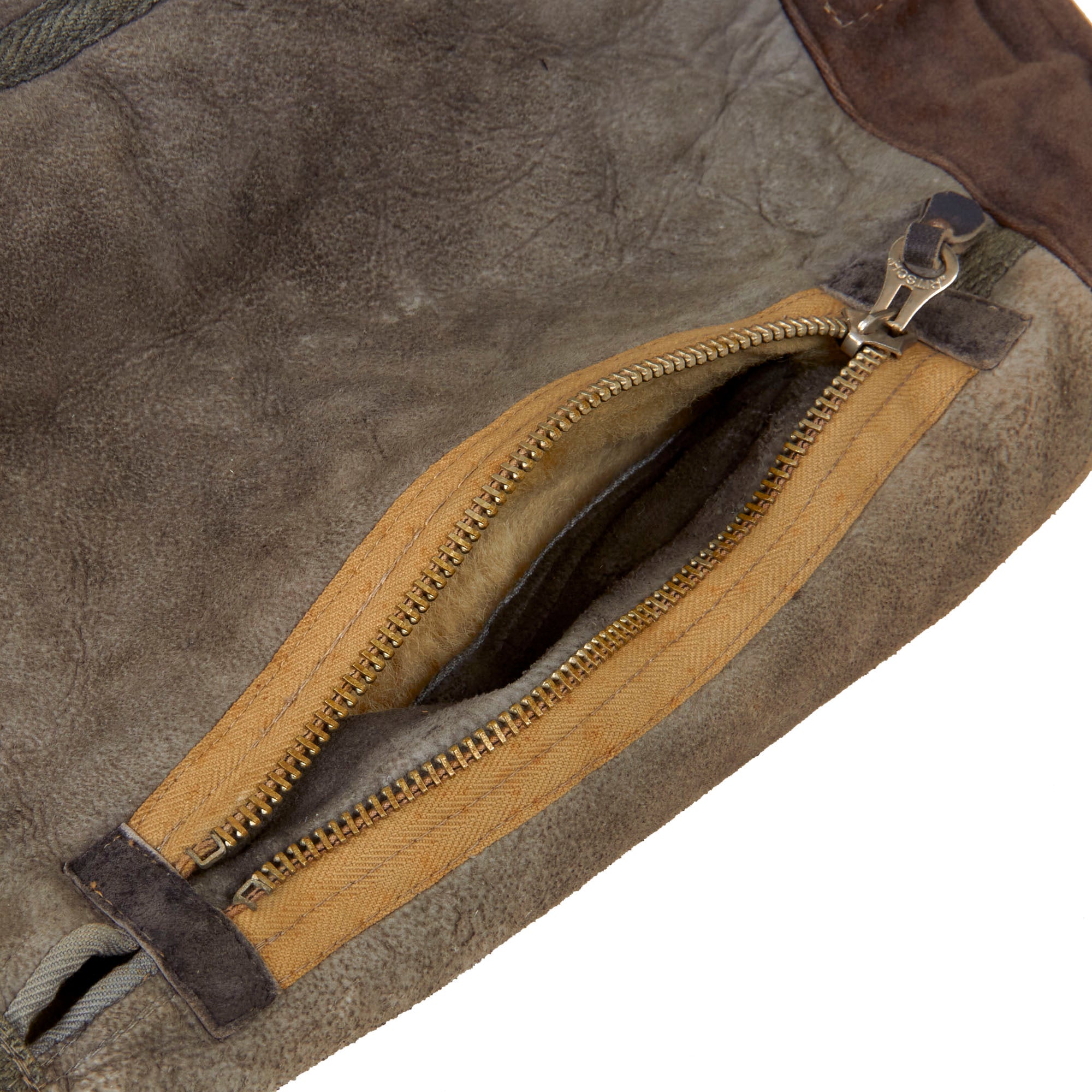 This lovely leather pilot's shearling flight jacket & trousers are in very good condition, showing signs of moderate use during the war, although there is some damage. The jacket is a very high quality, German made private purchase, non-regulation, multi-panel chocolate brown leather construction flight jacket, with a lovely shearling lay down collar. It is the standard waist length, and the leather is in very good condition, showing no tearing, holes, or other major wear. We checked inside and out, and there are two small tags along the waist which are now entirely washed out and unreadable. The left cuff does show heavy damage and wear-down of the material, but otherwise the leather has held up pretty well. Both front pockets retain their snaps. The front zipper is in good shape with a spring to keep the zipper tab in the down position for easy access.