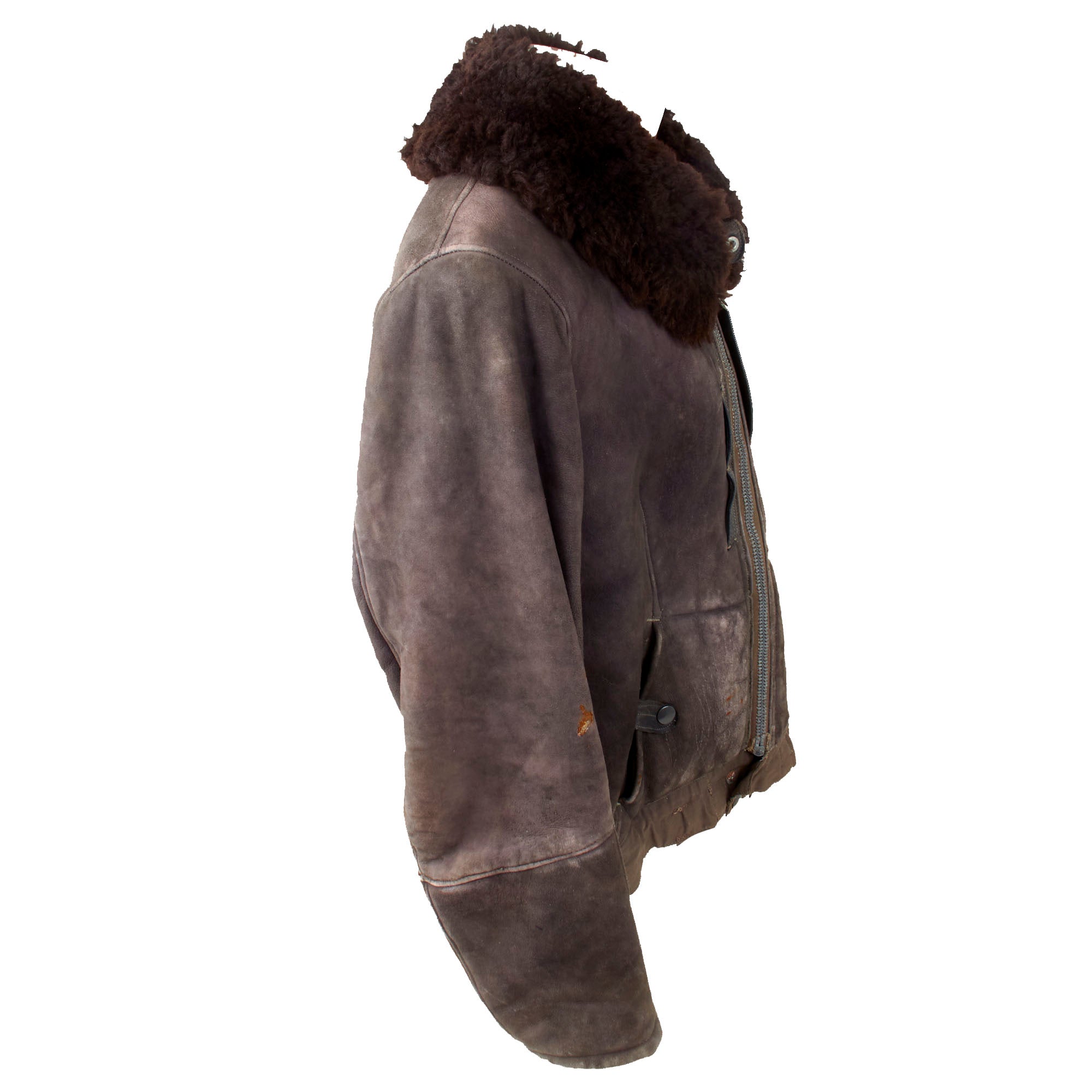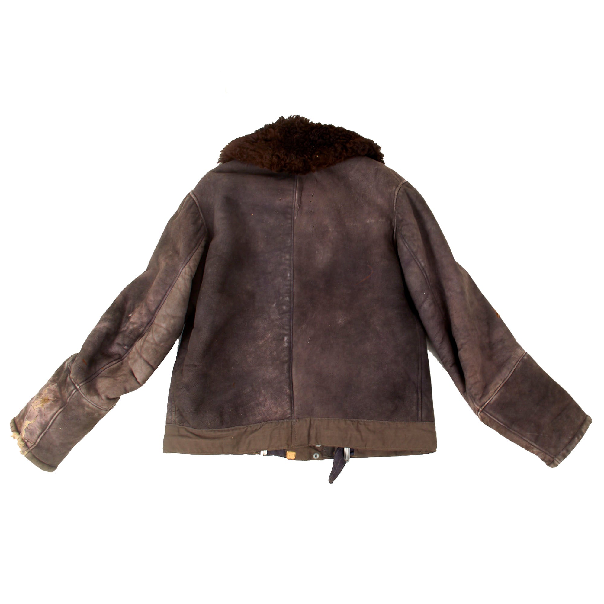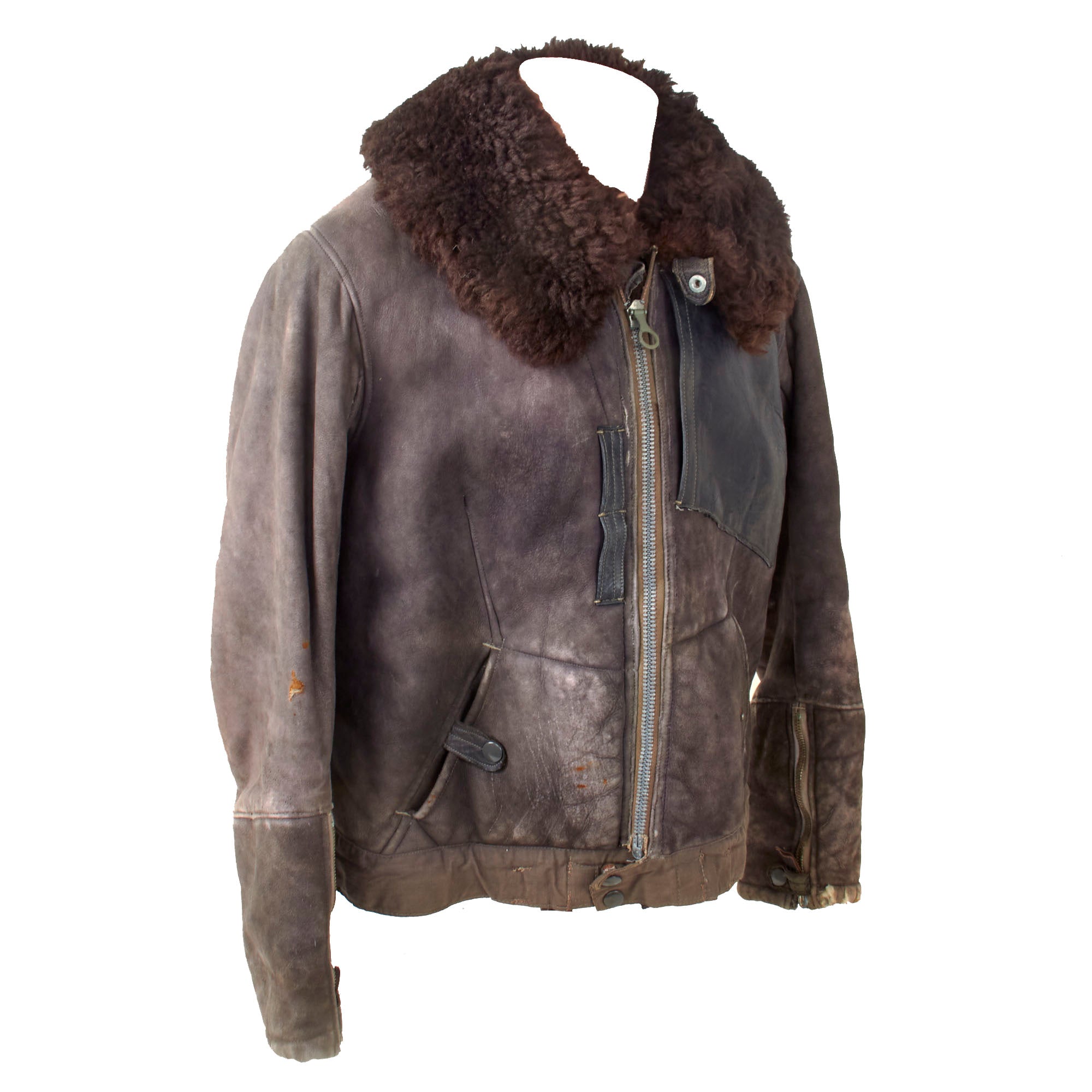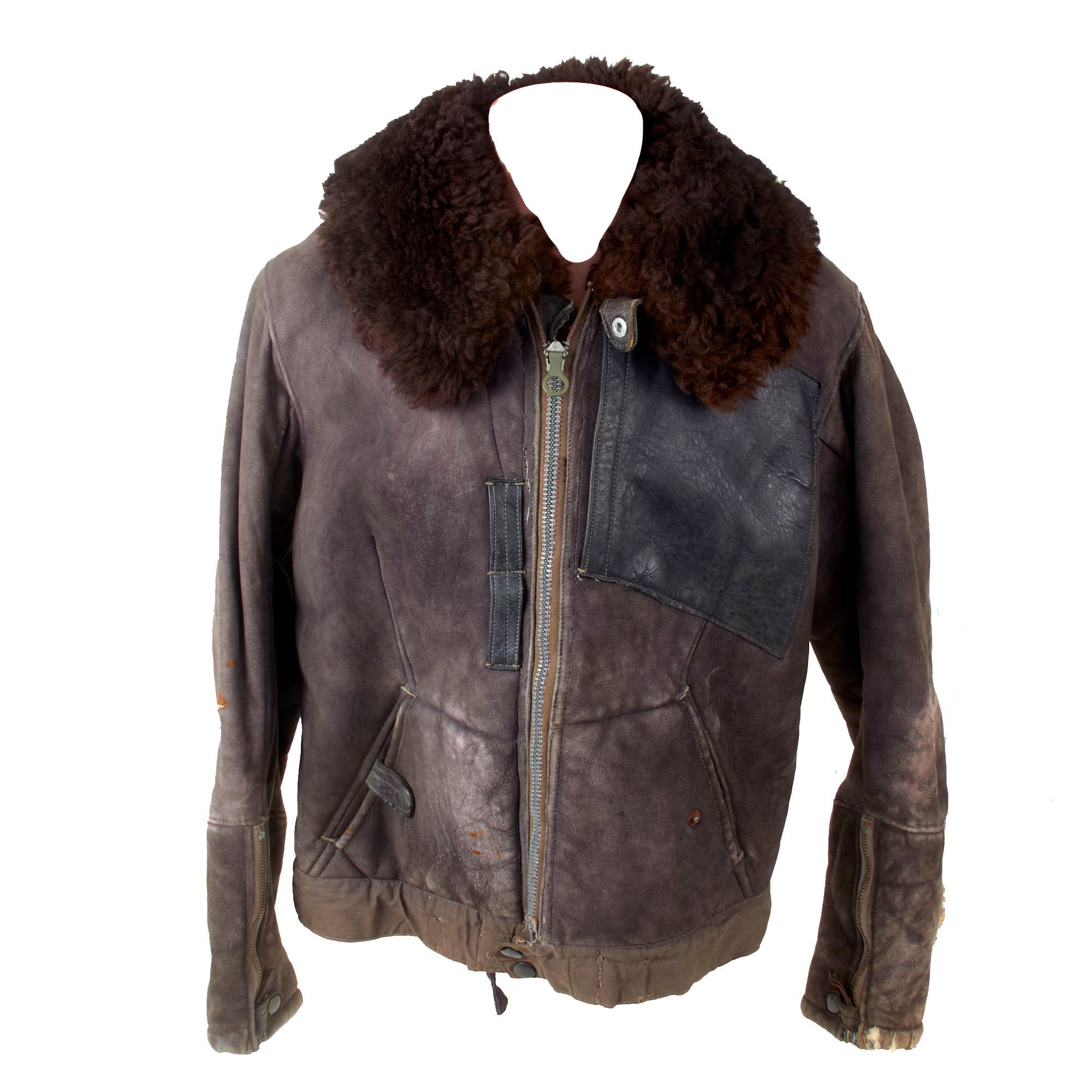 This lovely leather pilot's shearling flight jacket & trousers are in very good condition, showing signs of moderate use during the war, although there is some damage. The jacket is a very high quality, German made private purchase, non-regulation, multi-panel chocolate brown leather construction flight jacket, with a lovely shearling lay down collar. It is the standard waist length, and the leather is in very good condition, showing no tearing, holes, or other major wear. We checked inside and out, and there are two small tags along the waist which are now entirely washed out and unreadable. The left cuff does show heavy damage and wear-down of the material, but otherwise the leather has held up pretty well. Both front pockets retain their snaps. The front zipper is in good shape with a spring to keep the zipper tab in the down position for easy access.