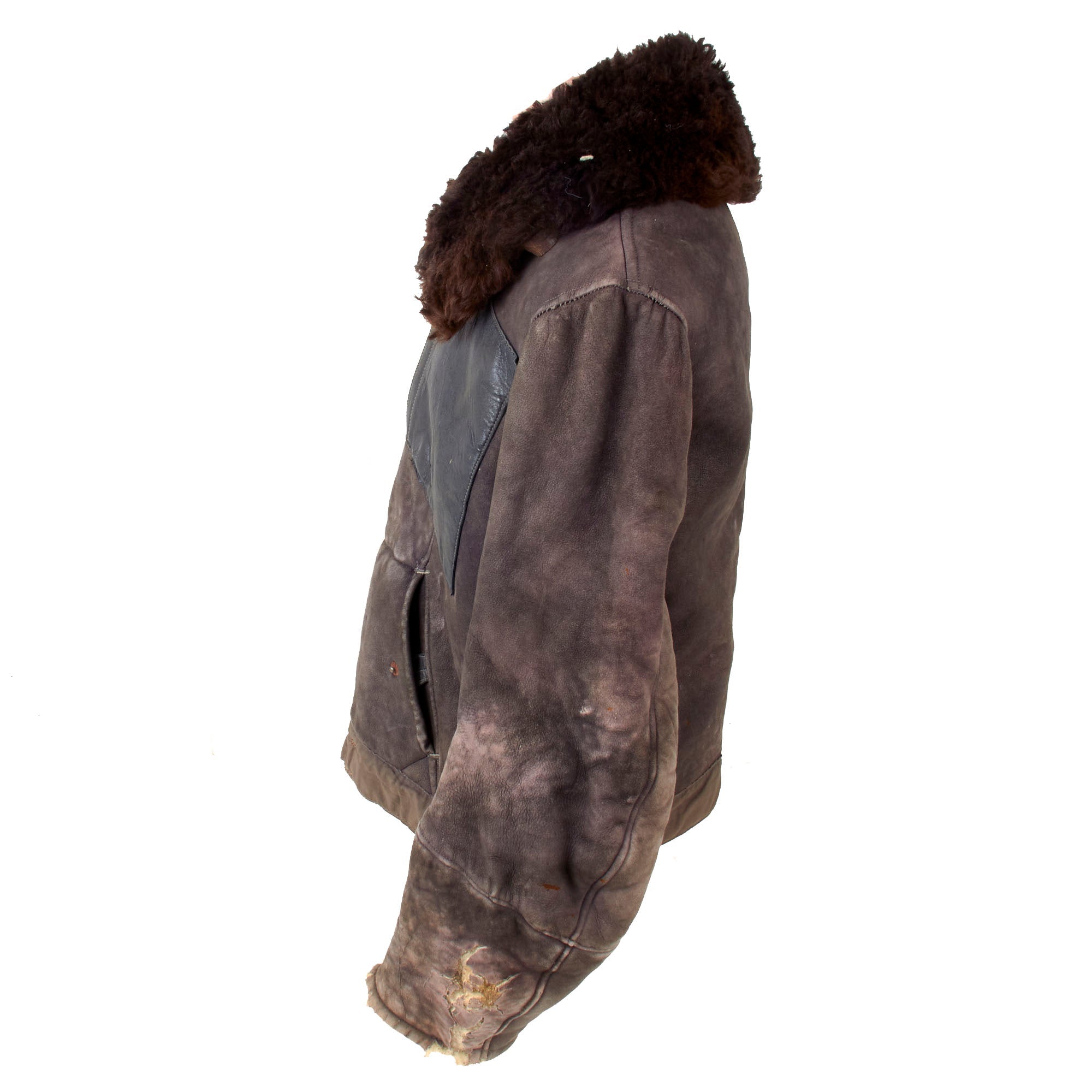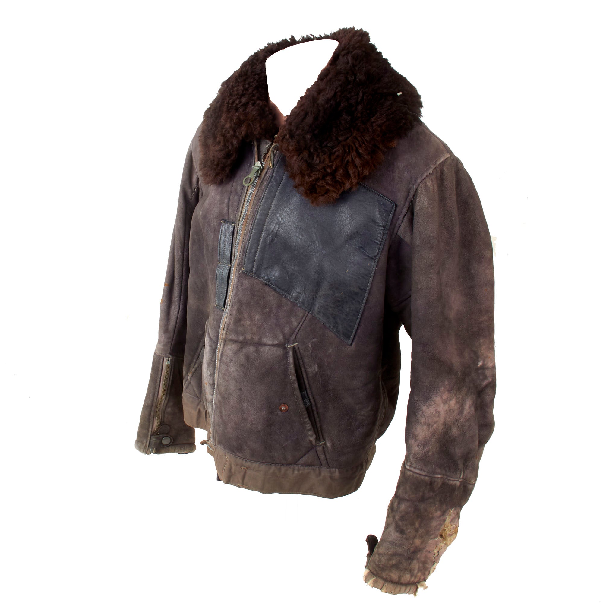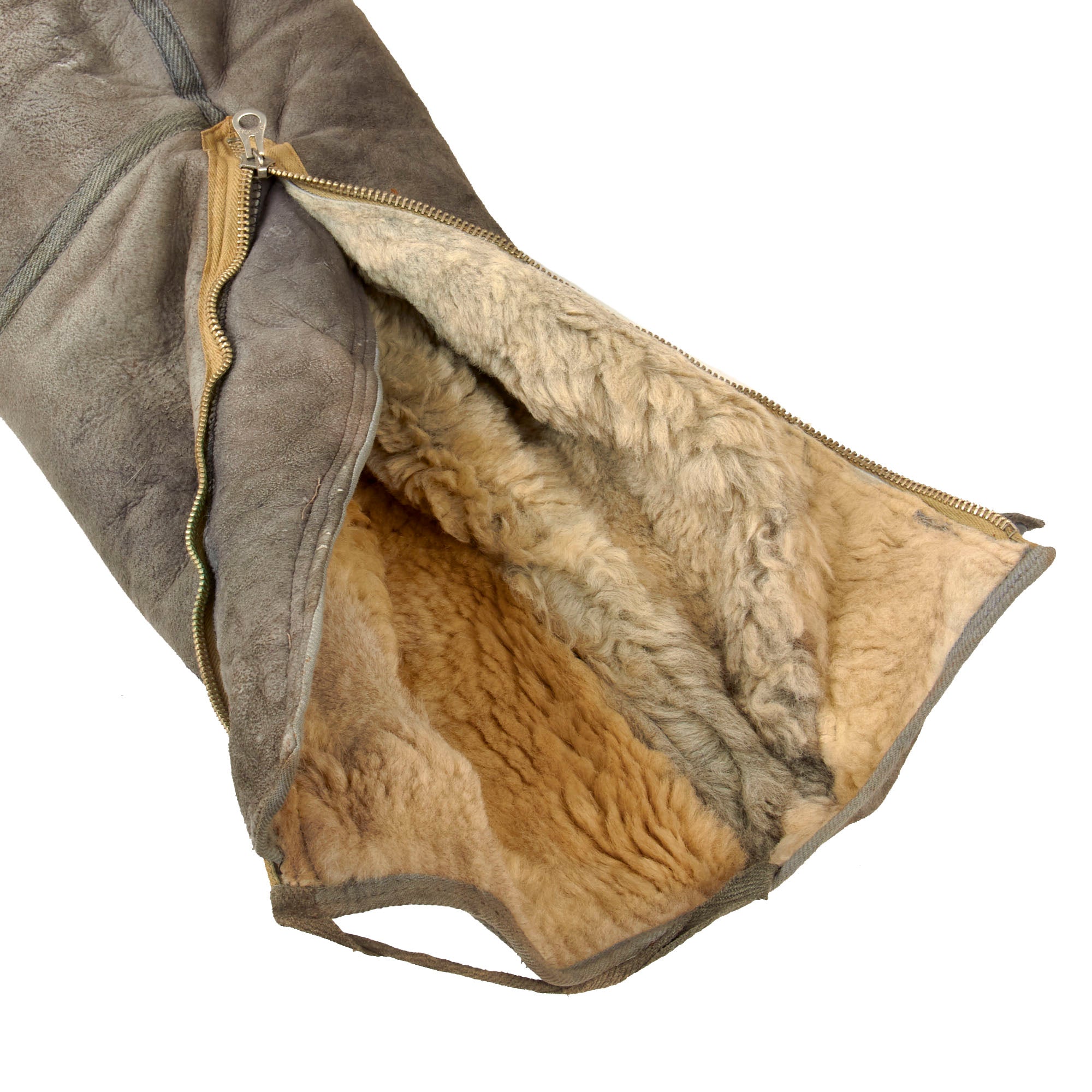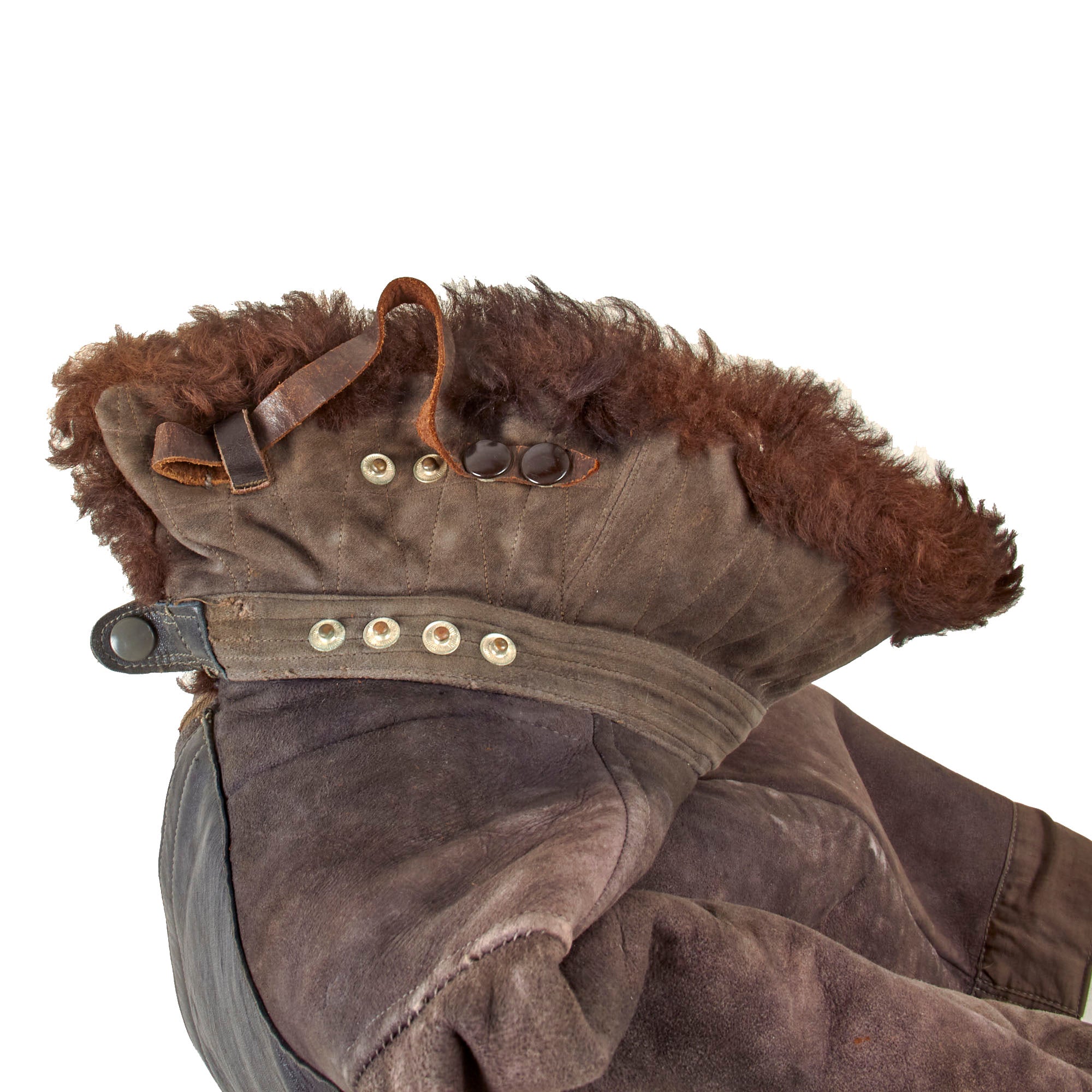 This lovely leather pilot's shearling flight jacket & trousers are in very good condition, showing signs of moderate use during the war, although there is some damage. The jacket is a very high quality, German made private purchase, non-regulation, multi-panel chocolate brown leather construction flight jacket, with a lovely shearling lay down collar. It is the standard waist length, and the leather is in very good condition, showing no tearing, holes, or other major wear. We checked inside and out, and there are two small tags along the waist which are now entirely washed out and unreadable. The left cuff does show heavy damage and wear-down of the material, but otherwise the leather has held up pretty well. Both front pockets retain their snaps. The front zipper is in good shape with a spring to keep the zipper tab in the down position for easy access.