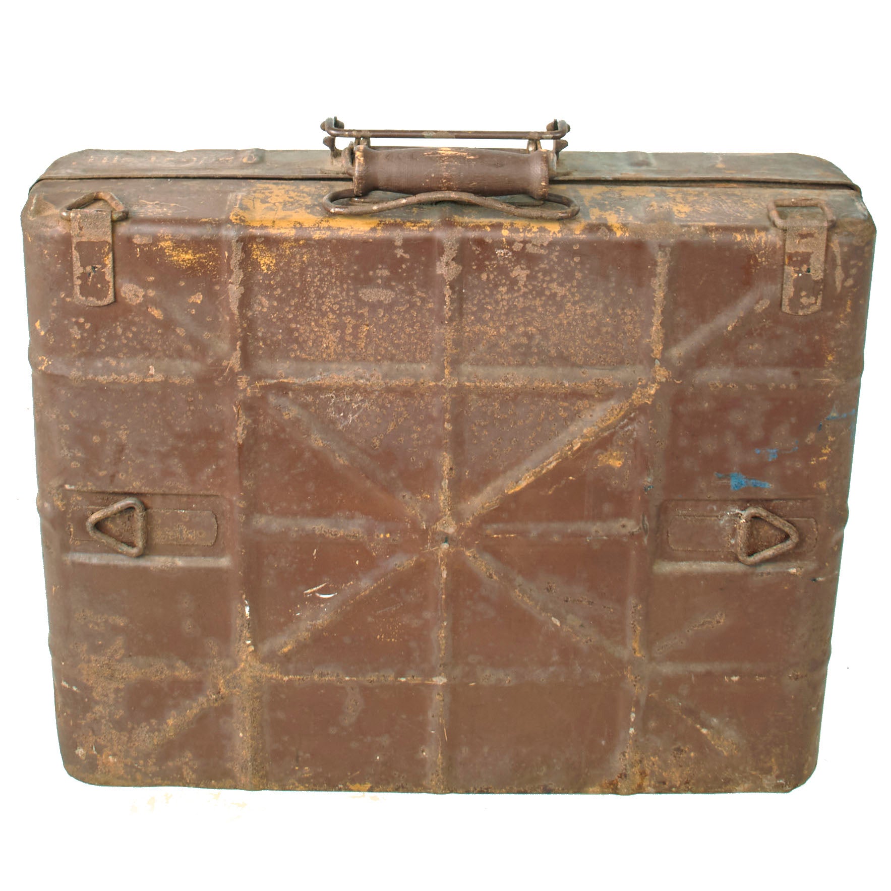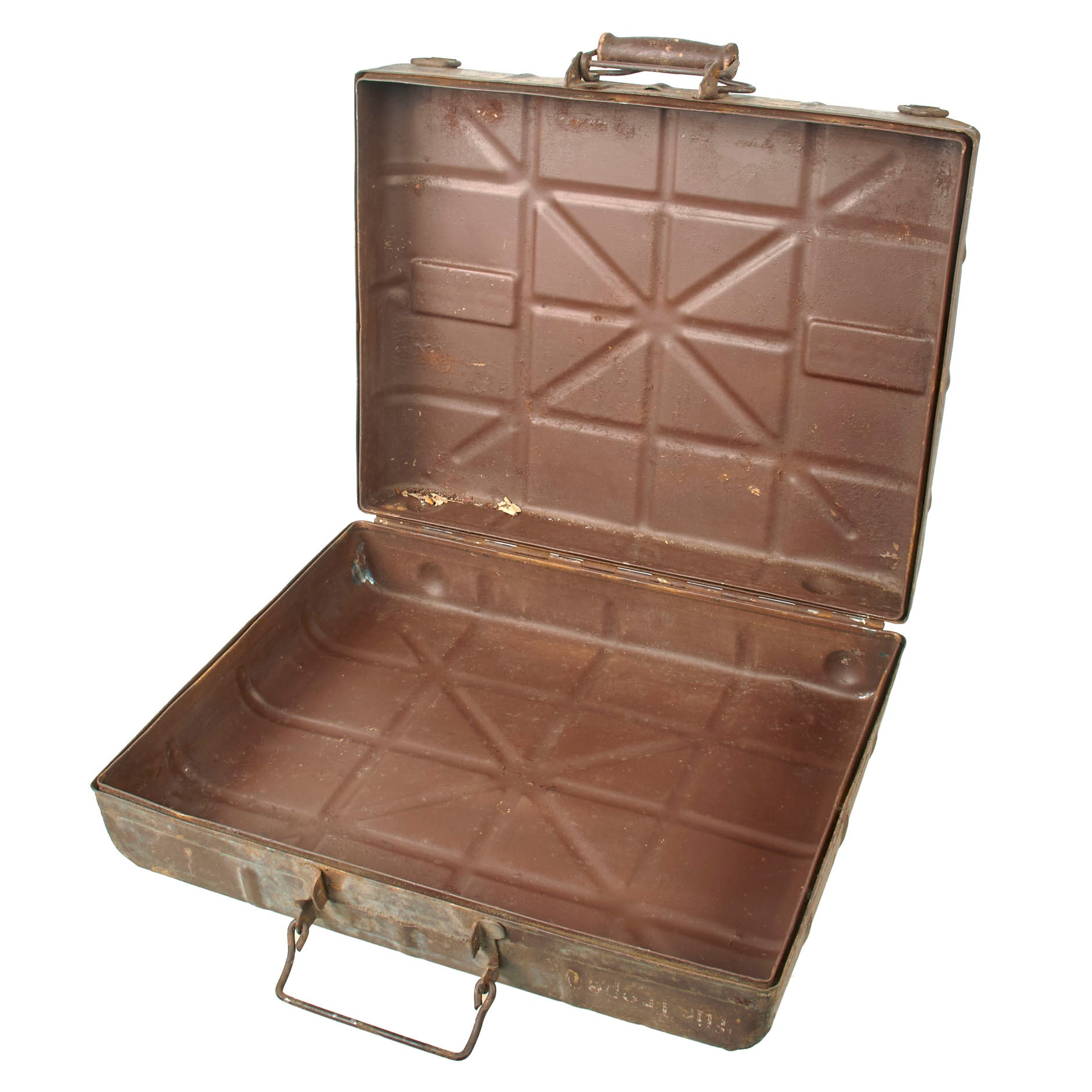 The case itself retains its original tan/red paint, with heavy wear. The interior has the same red finish, which is very well retained. There are no markings present and the original wood carry handle is still present. It measures approximately 19" x 15" x 5".