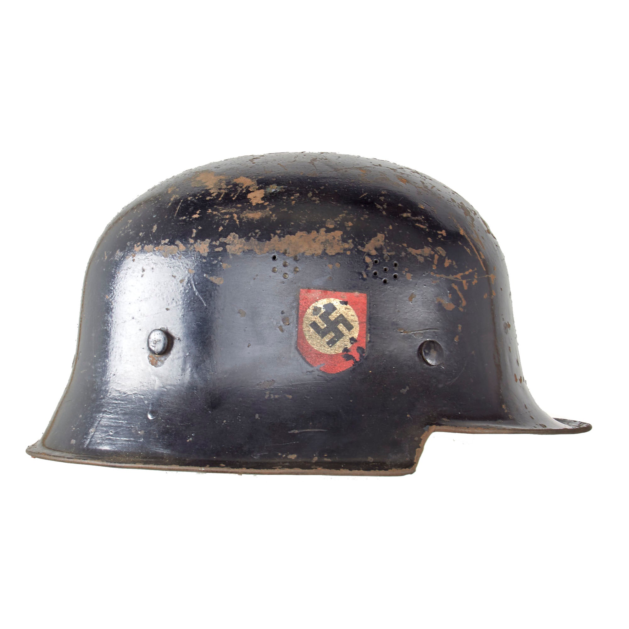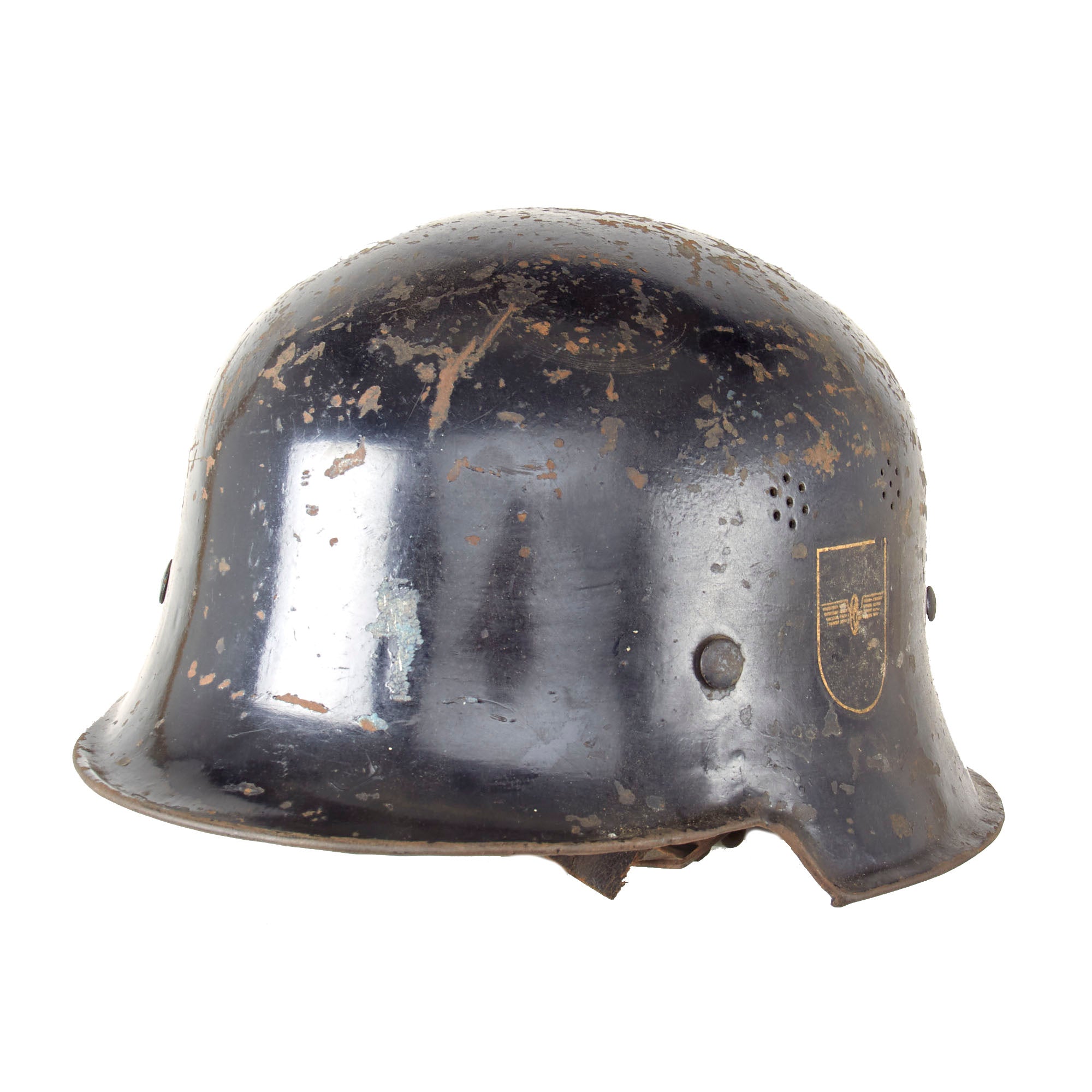 Original Item: Only One Available. This is a very nice, genuine steel construction M34 "Square Dip" Third Reich helmet, outfitted for German WW2 DRB Bahnschutzpolizei (Railway protection police) issue. These are pretty much identical to the Schutzpolizei issue except for the left side decal. This helmet still retains it's original "Double Decals", with the NSDAP swas shield on the right, and on the left instead of a Civic Police decal, it has a Bahnschutzpolizei decal, a black shield with a silver border, and the "Winged Wheel" logo of the DRB in the middle. Comes with a complete leather liner and top pad, however the chin strap is partly torn through by one of the buckles, and is in delicate condition. All four liner attachment pins are present, along with the cork spacer washers on the inside of the helmet. The helmet definitely looks to have seen a good amount of use during the war.