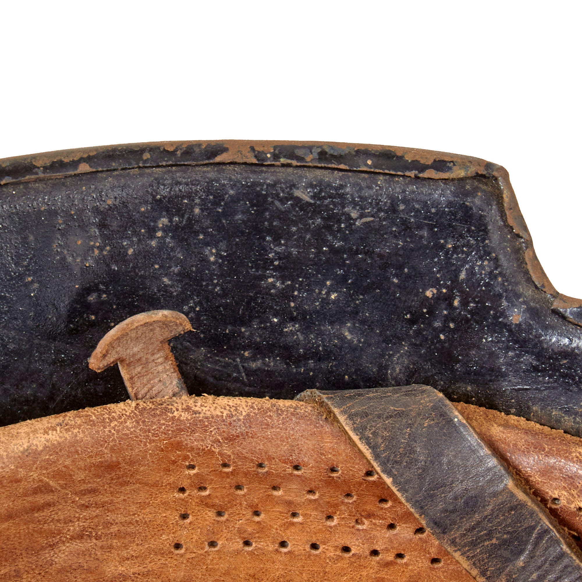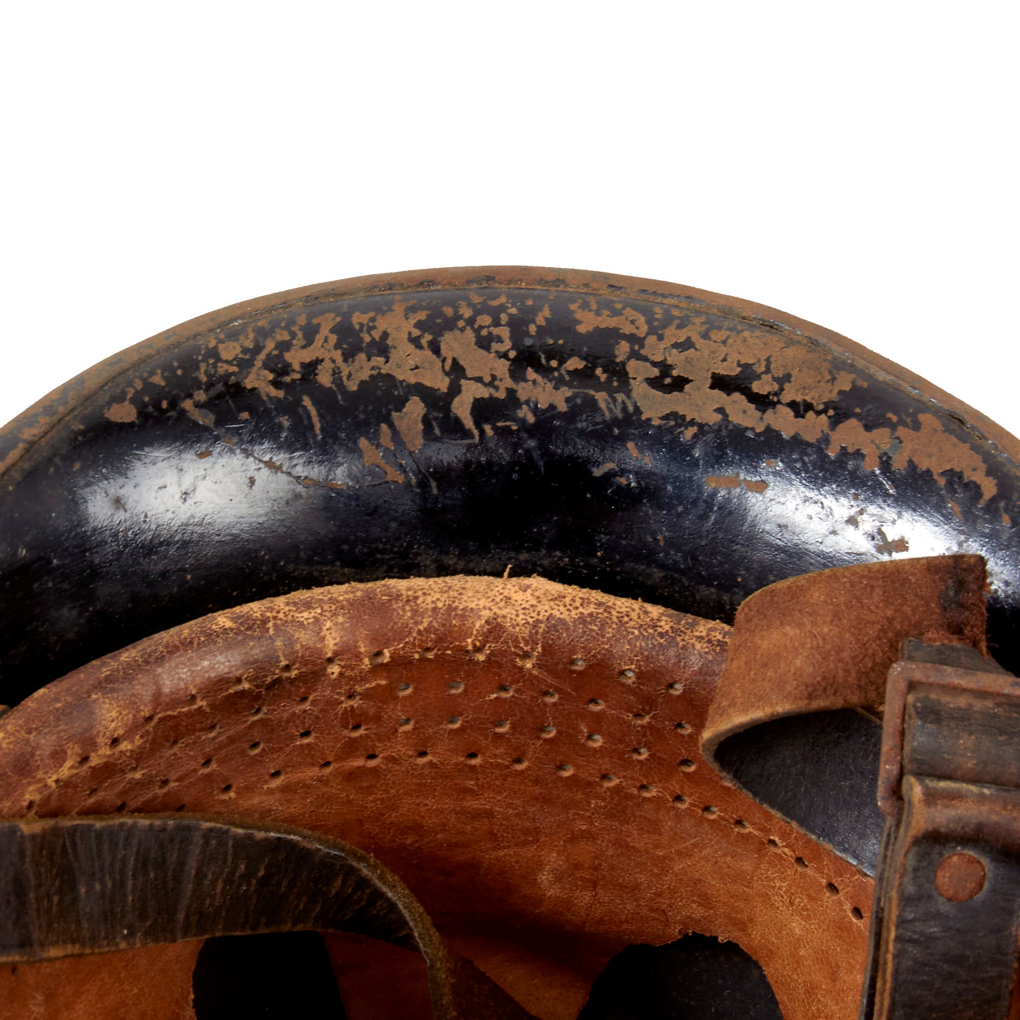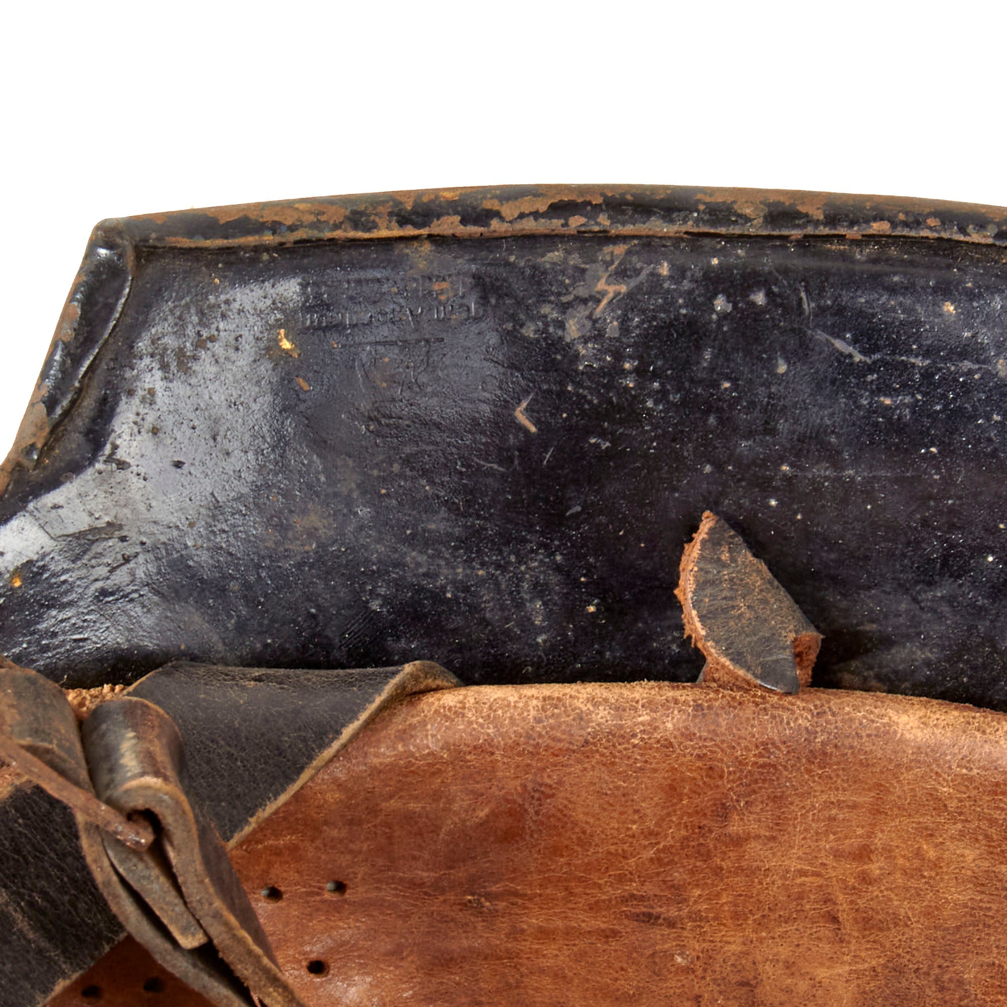 The exterior of this German helmet retains much of the original semigloss black paint on the exterior, with overall light wear resulting in missing paint chips and oxidation of the steel. Both decals are well retained, however they have yellowed quite a bit, giving them a fantastic aged look, and also have some areas chipped away. The interior has retained the black paint very well, showing some scattered oxidation, especially under the front brim, where there has been a good amount of chipping.