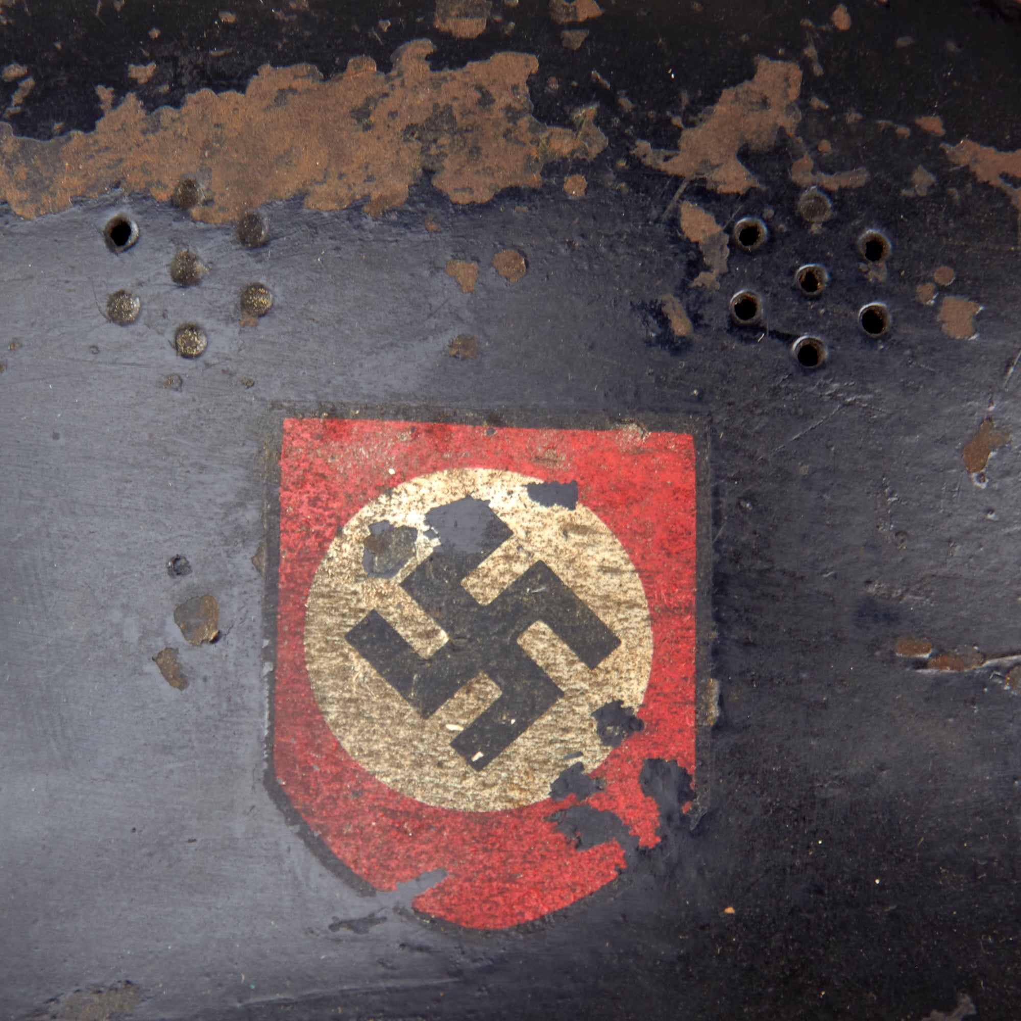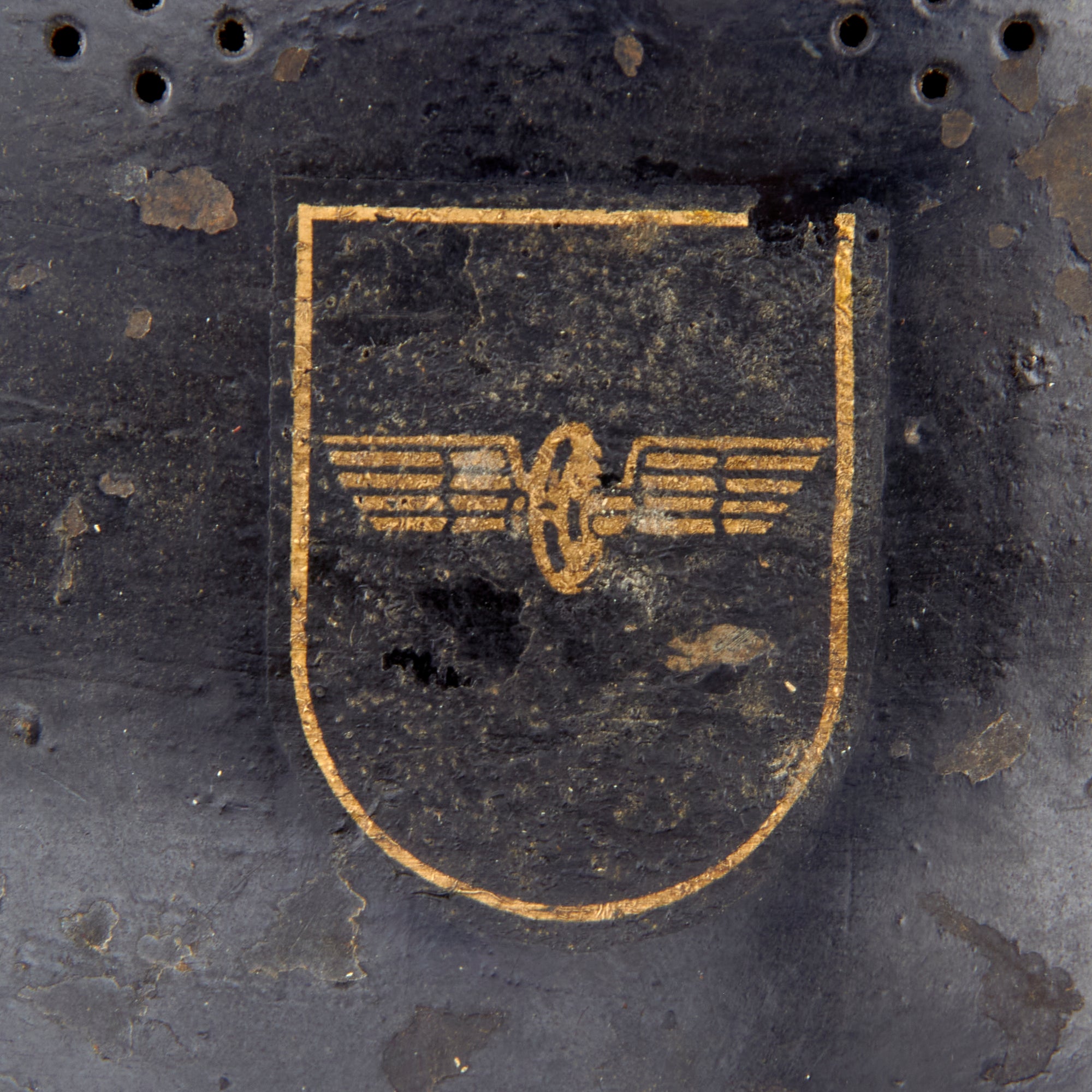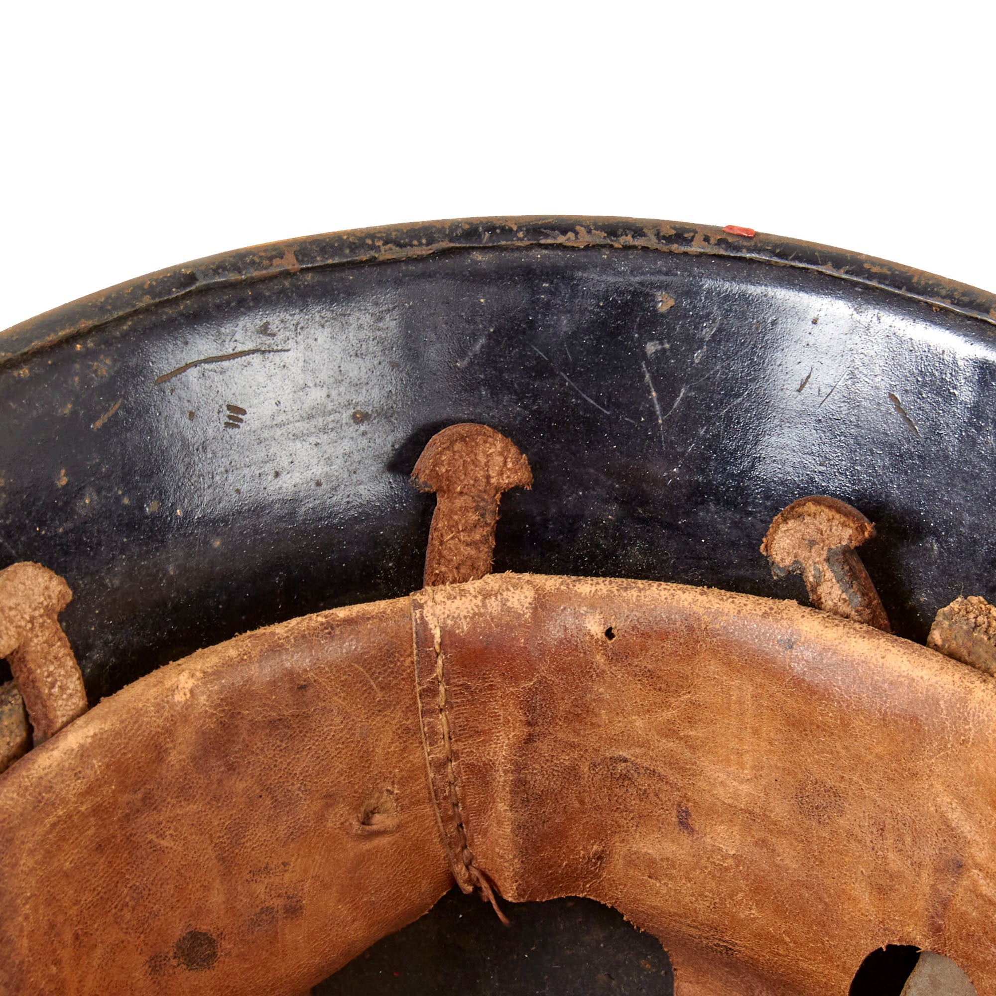 The exterior of this German helmet retains much of the original semigloss black paint on the exterior, with overall light wear resulting in missing paint chips and oxidation of the steel. Both decals are well retained, however they have yellowed quite a bit, giving them a fantastic aged look, and also have some areas chipped away. The interior has retained the black paint very well, showing some scattered oxidation, especially under the front brim, where there has been a good amount of chipping.