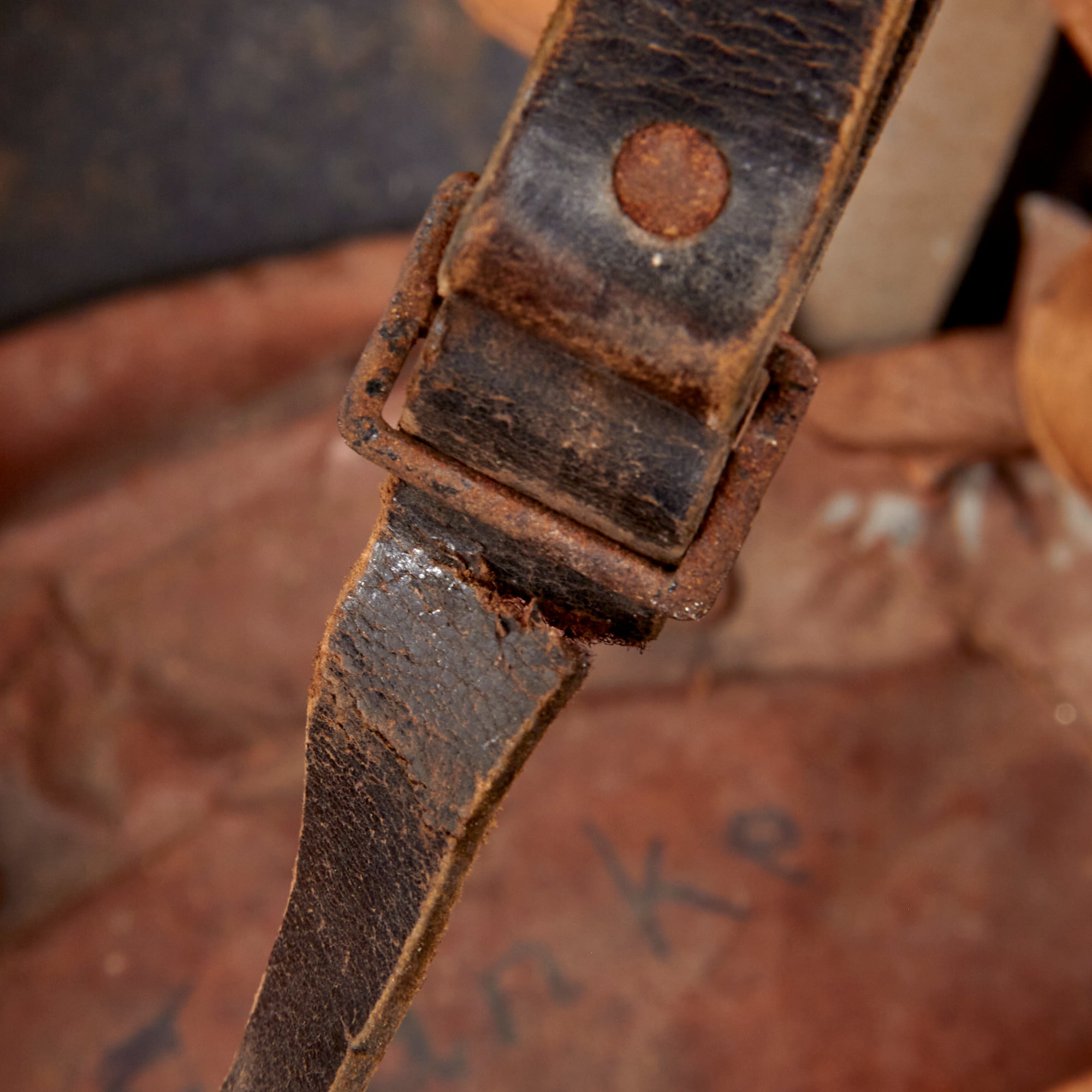 The leather liner is in good condition, with light wear and some deterioration along the front edge, but no tearing or other major damage. The top tie is however missing, and the liner is now a bit shrunken. All five of the tabs for attachment of a leather neck shield are still present. The top pad has the name Franke written on it. As mentioned previously, the chinstrap is partly torn through next to one of the buckles, and is in delicate condition.