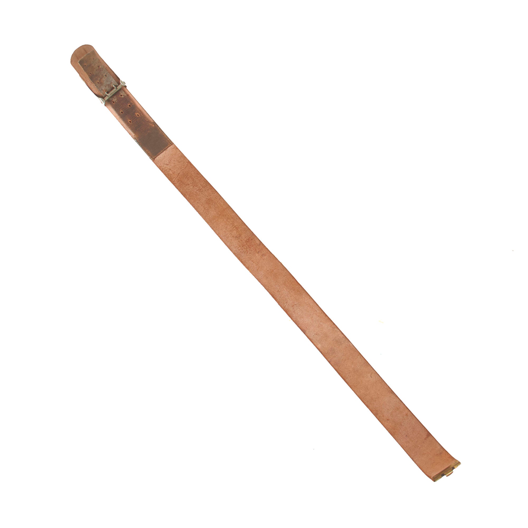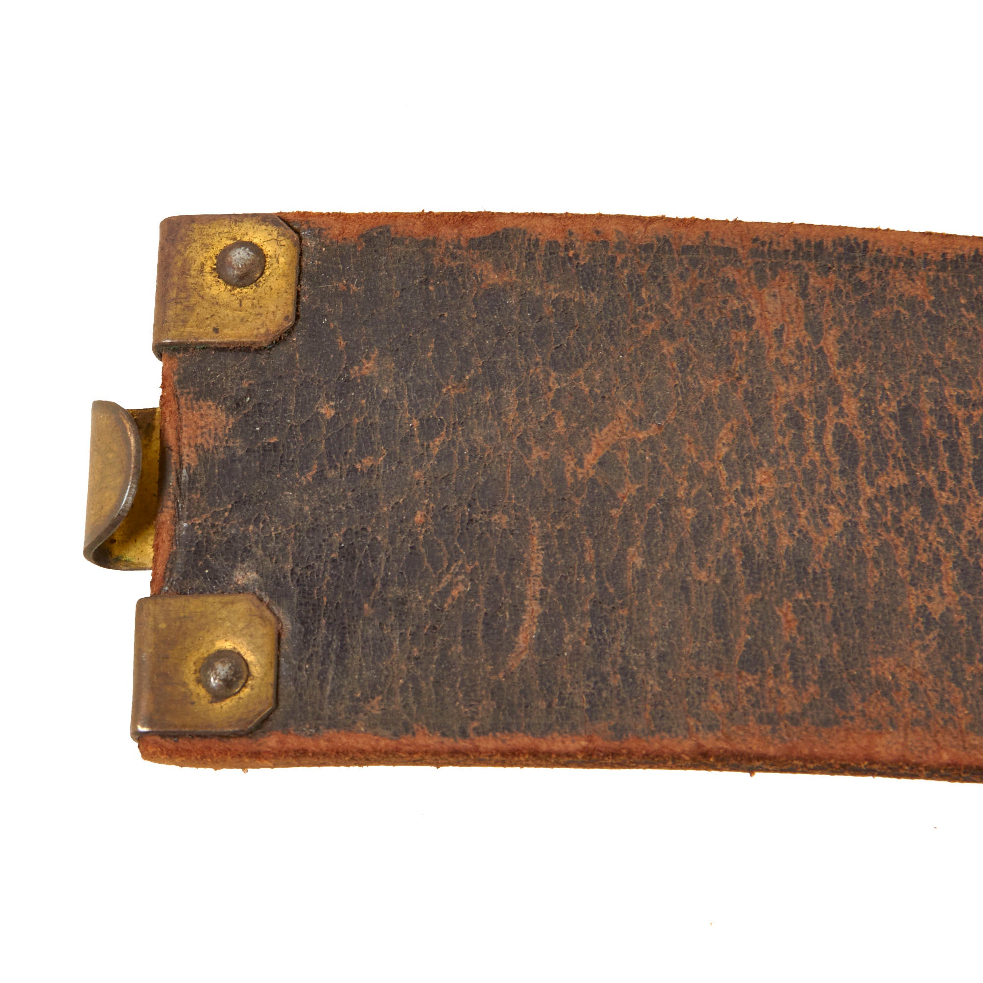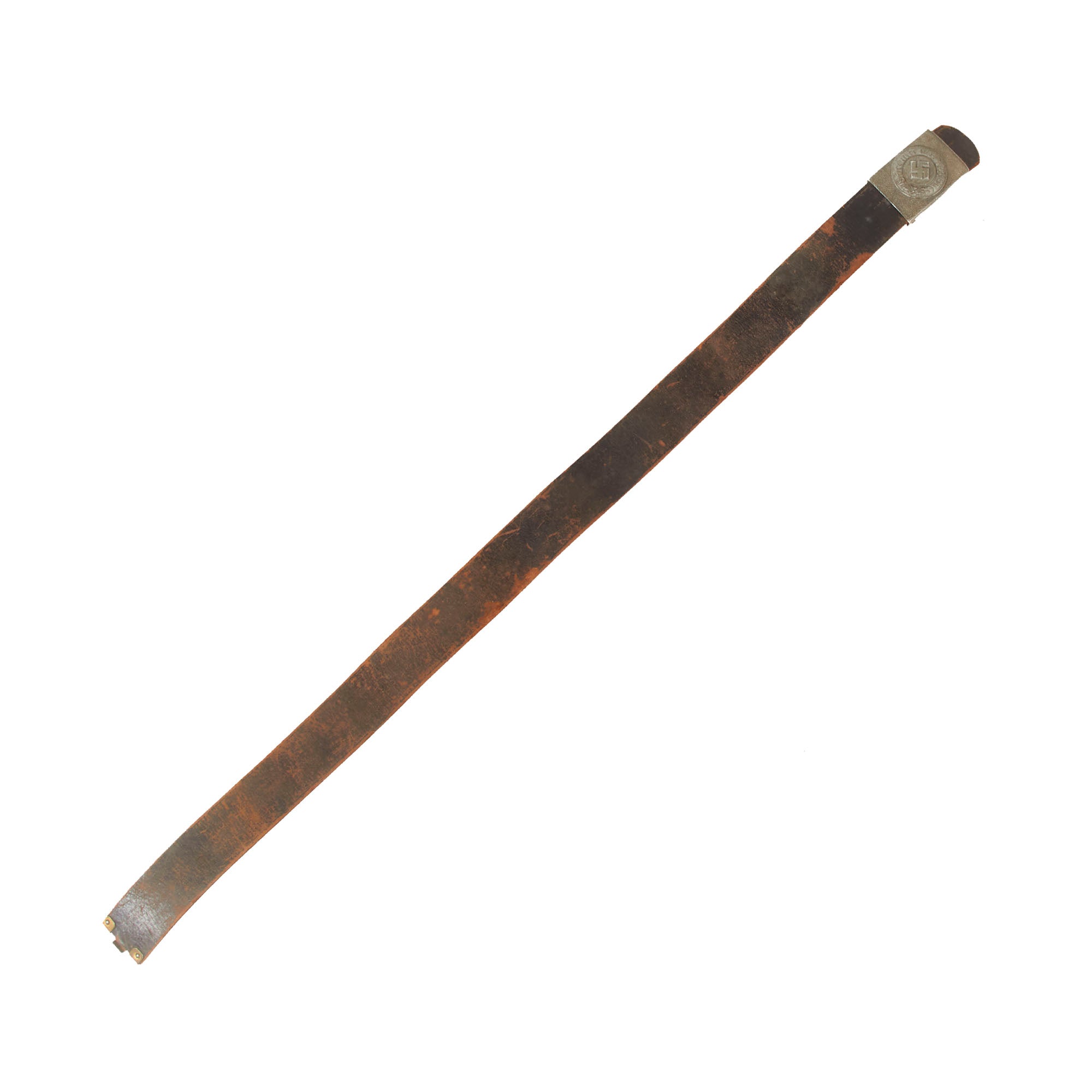 The belt itself measures about 35” clip to loop when fully extended, and does show wear from long service, with the black finish relatively well retained. The leather is solid, with no tears or major cracks, but definitely shows deterioration from age. It still retains the leather tab with a double row of 7 holes for size adjustment. The belt has no visible maker’s mark remaining. The black leather finish indicates it was for the metropolitan Schutzpolizei (Protection Police).