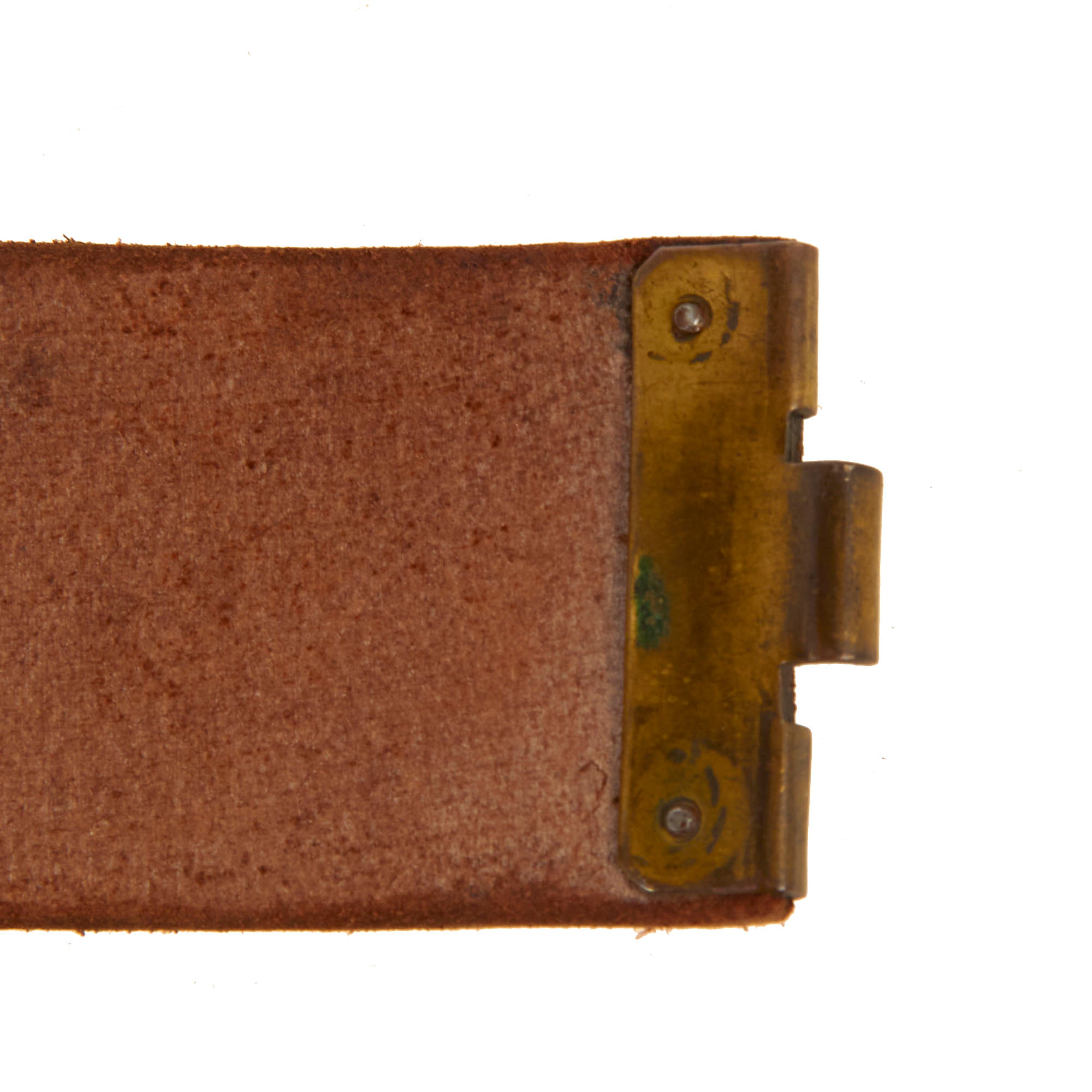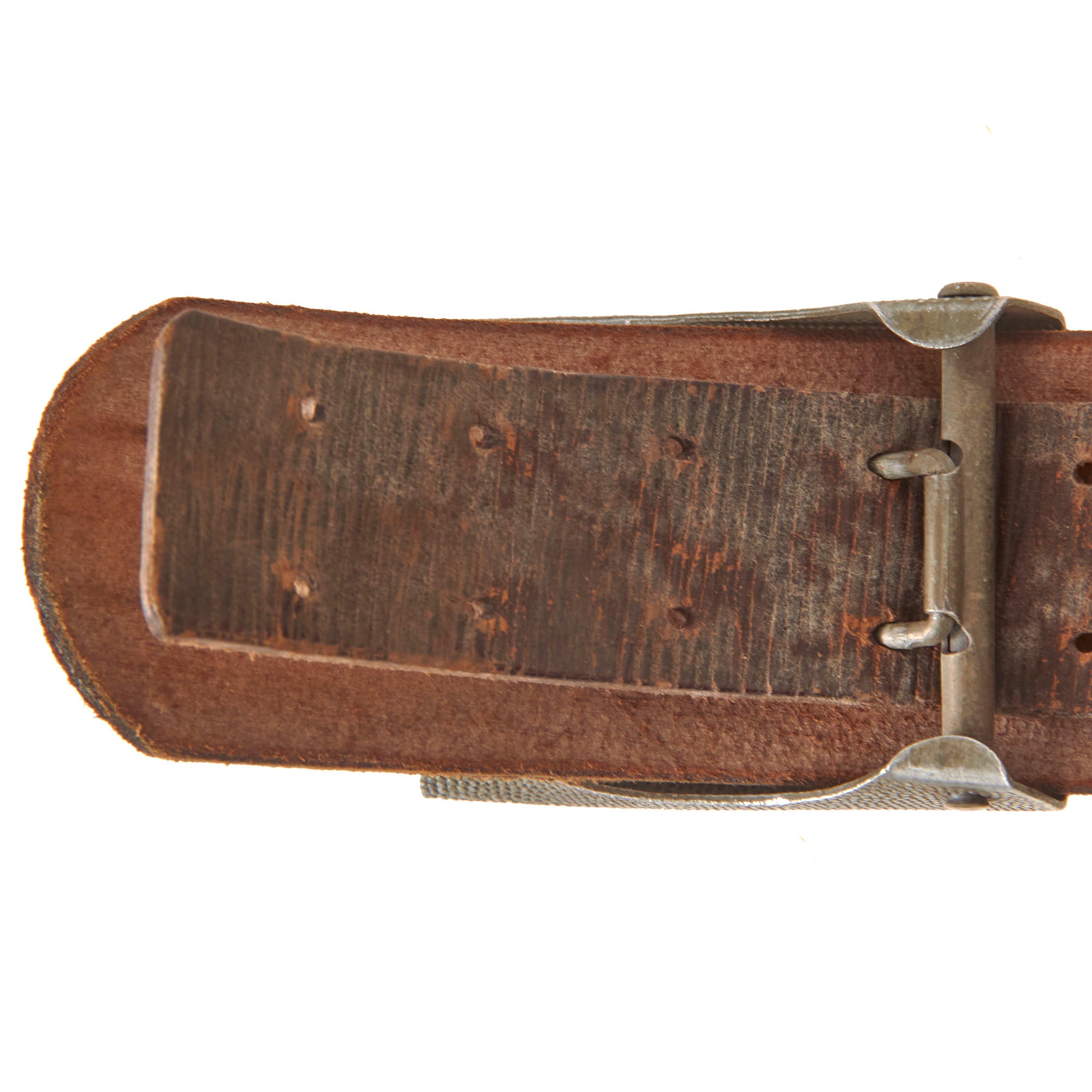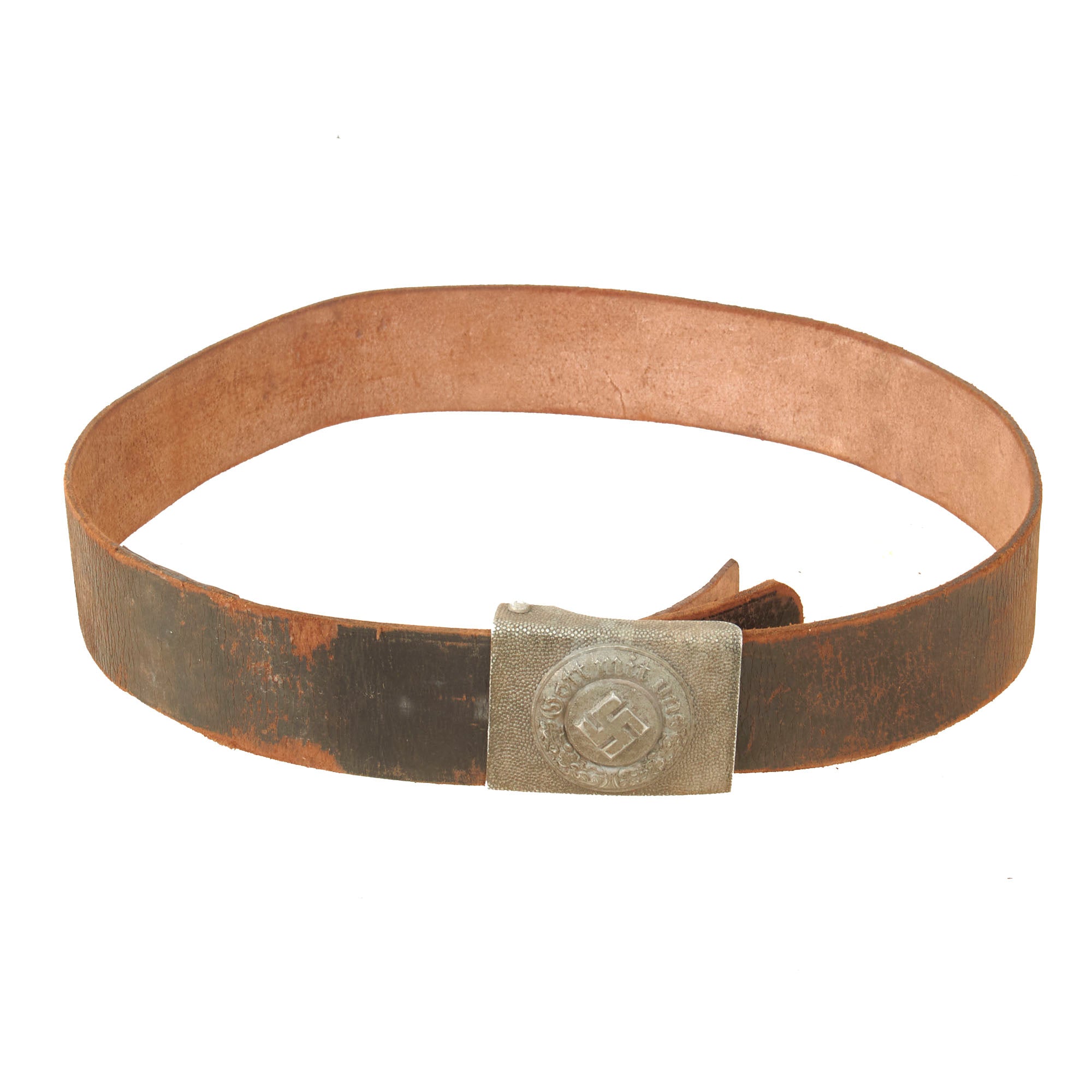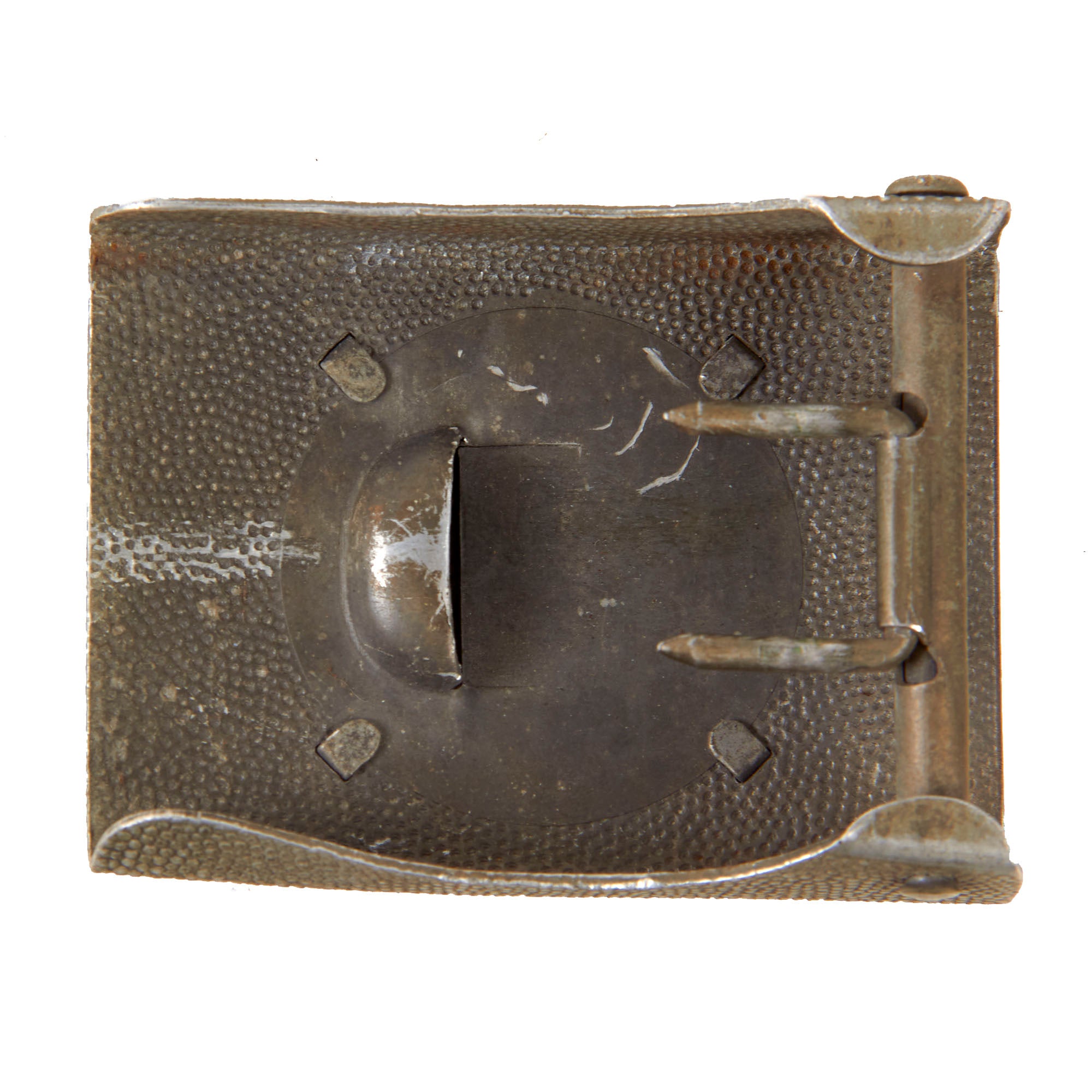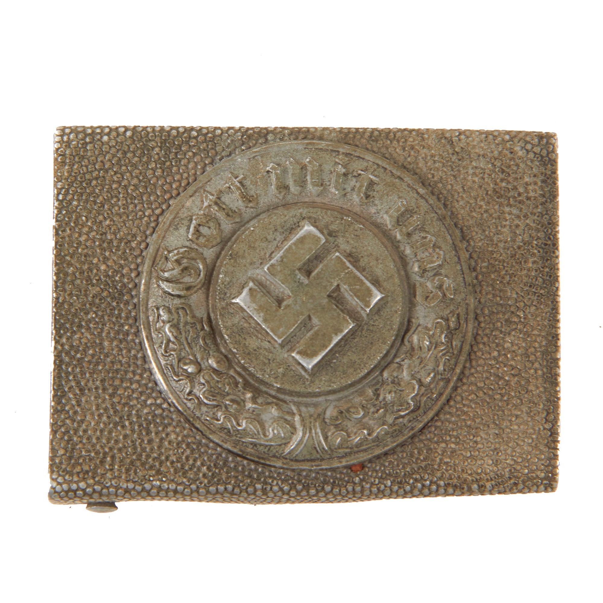 Original Item: Only One Available. This is a very nice WWII German Polizei (Police) NCO's Pebbled Aluminum Belt Buckle (Koppelschloß) with the correct leather belt. It is embossed with a central swas (hook cross), with a wreath around it bearing the motto Gott mit uns (God with us). Nice single piece injection molded aluminum construction box buckle with a pebbled background and oxide finish. The buckle is in very good condition, with all the pebbling in good condition, and most of the details in the wreath still present. It does however have some deformation at the loop end, which we have left intact to preserve the history. There is no maker’s mark that we can see on the buckle.