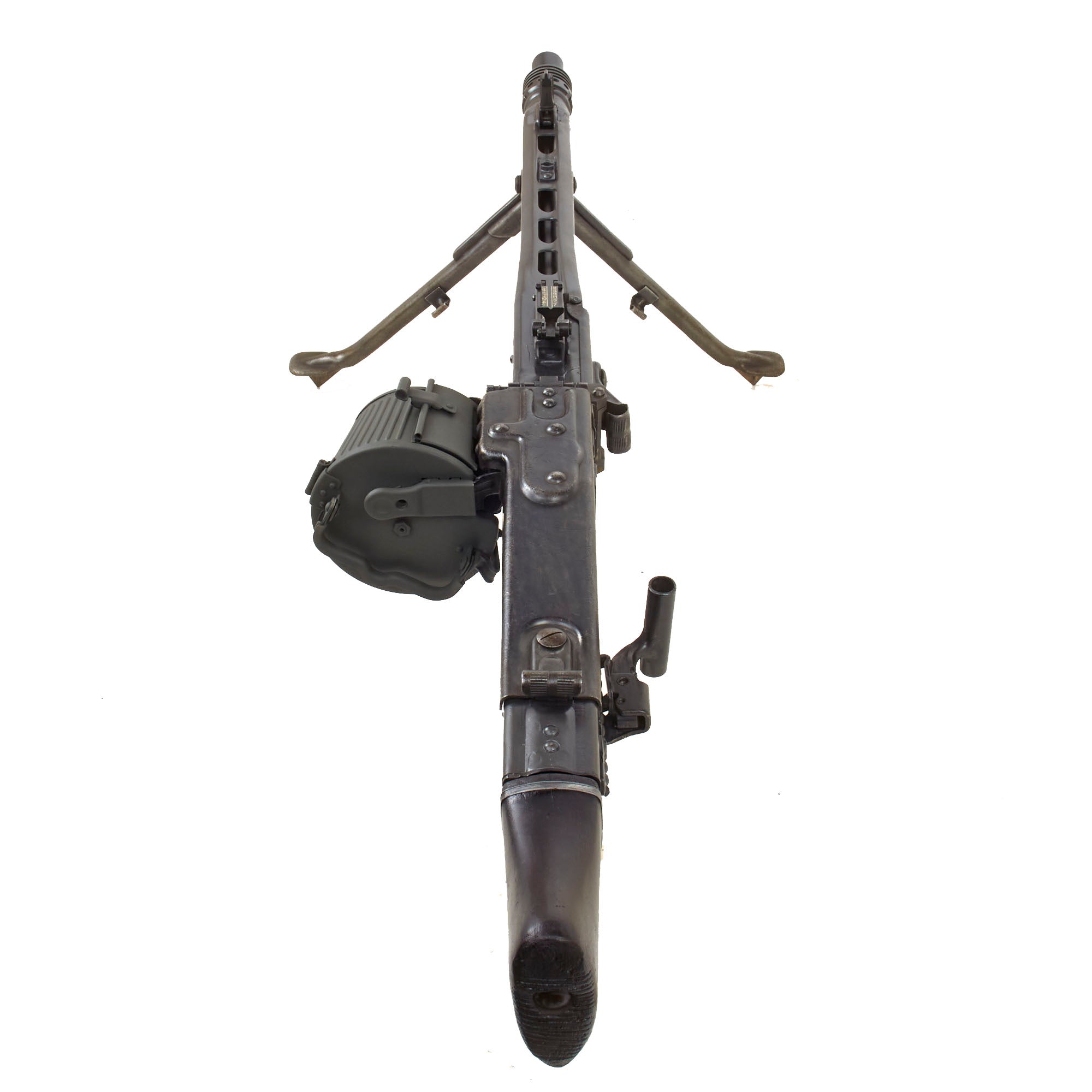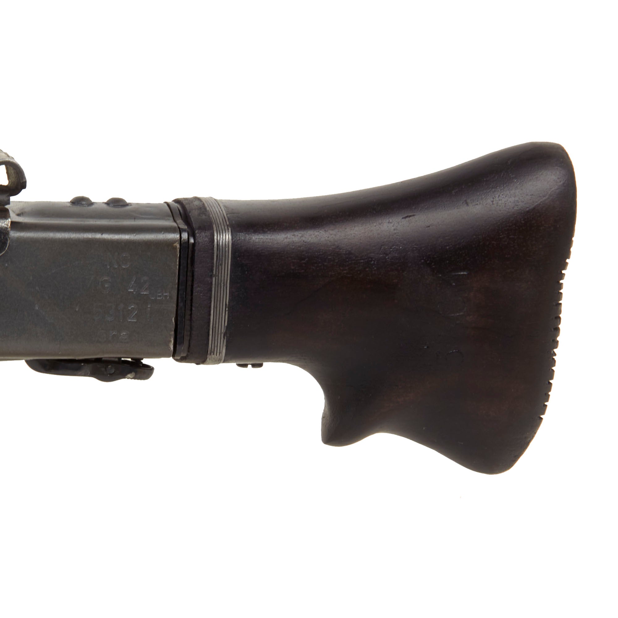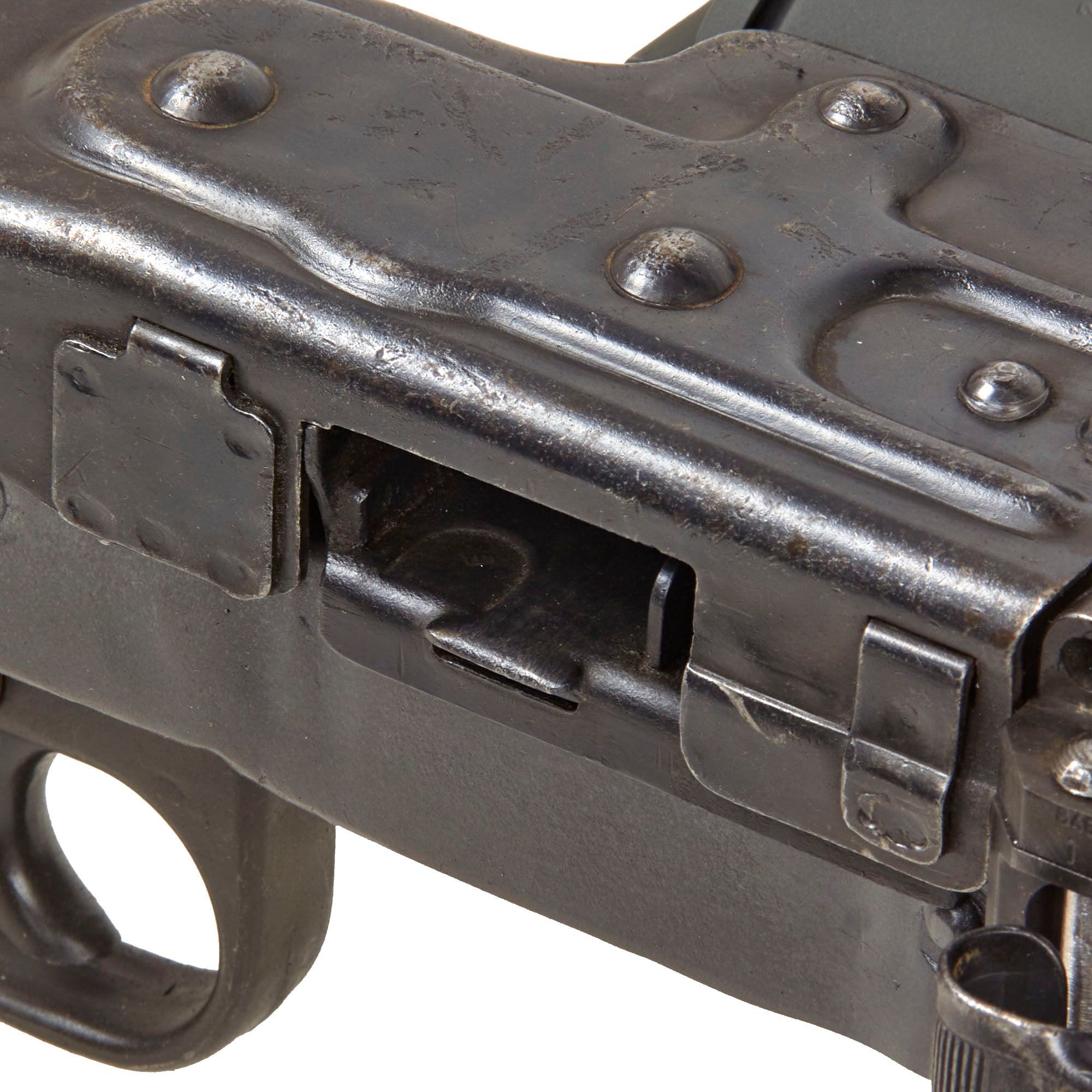 Original Item: Only One Available. Constructed from a legally demilitarized (de-milled) parts set, this is a wonderful and rare German WWII MG42 Display Gun. It is built from all original parts on an original BATF compliant non-firing display receiver, making this a 100% legal display machine gun. This receiver was created by using portions of the original torch cut receiver, including the barrel bushing, combined with a new made solid steel portion under the feed tray. It has properly had a 25% section of the total length completely replaced entirely with solid steel bar stock. Meaning a 1/4 length section of the display receiver is solid steel, making this totally legal to own without a license of any kind.