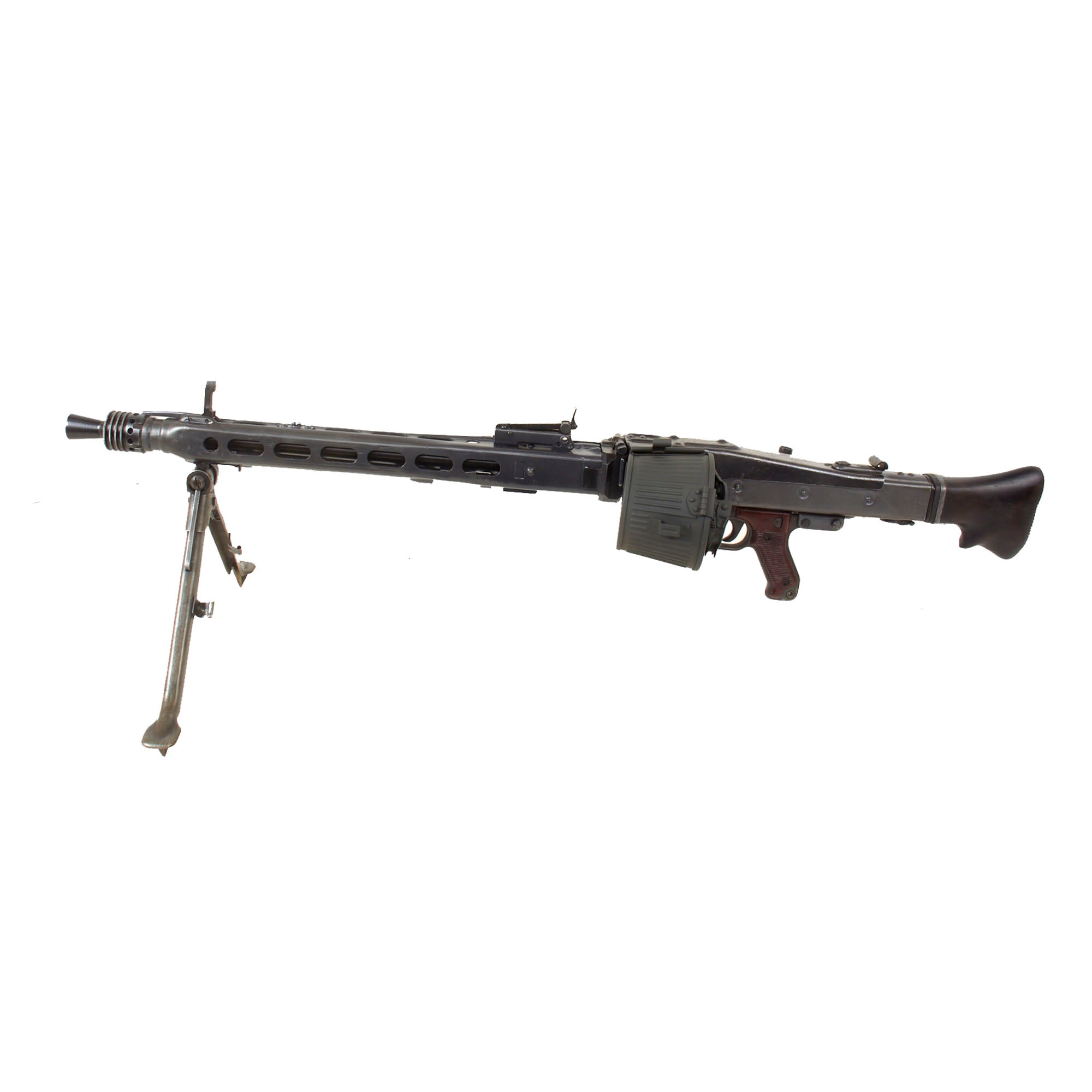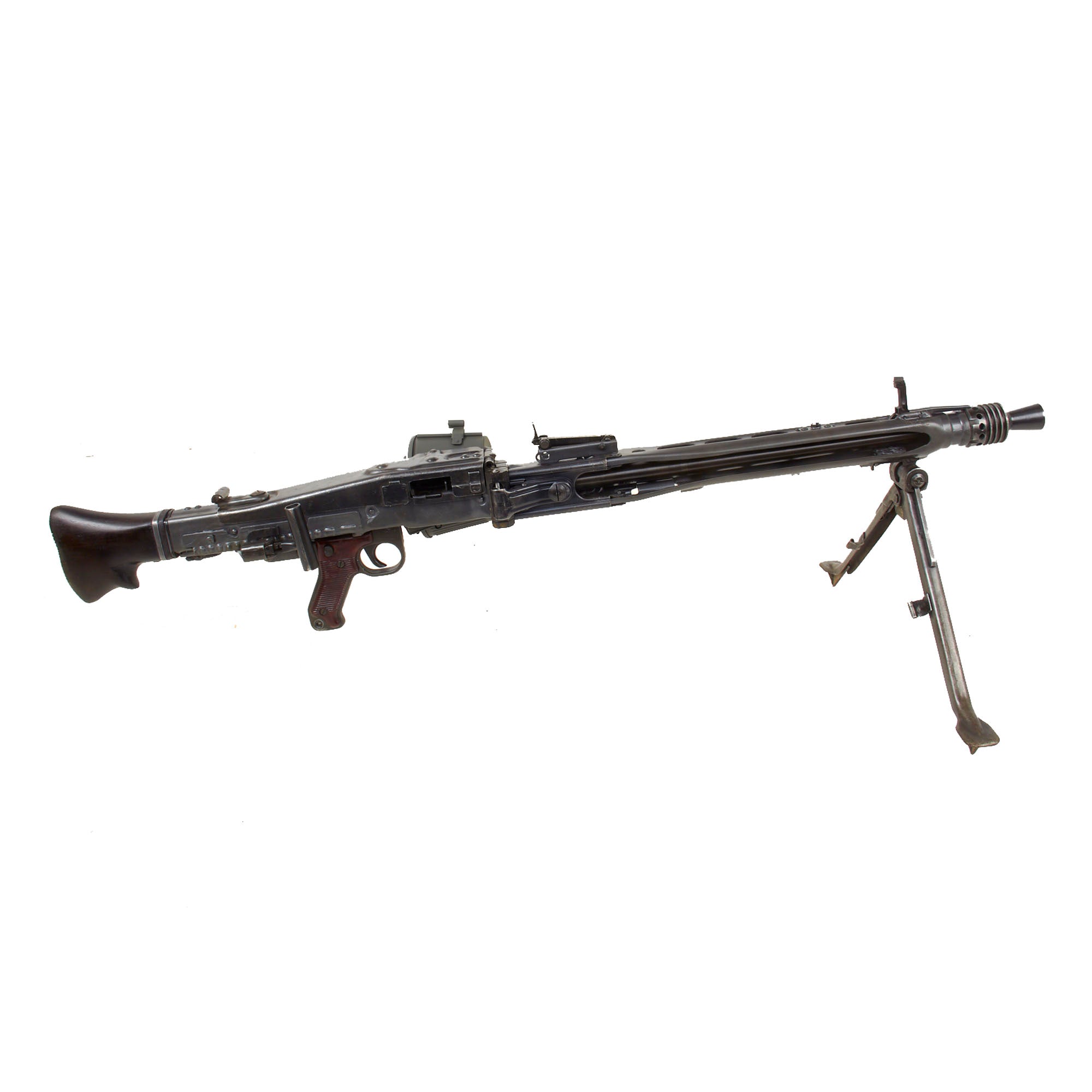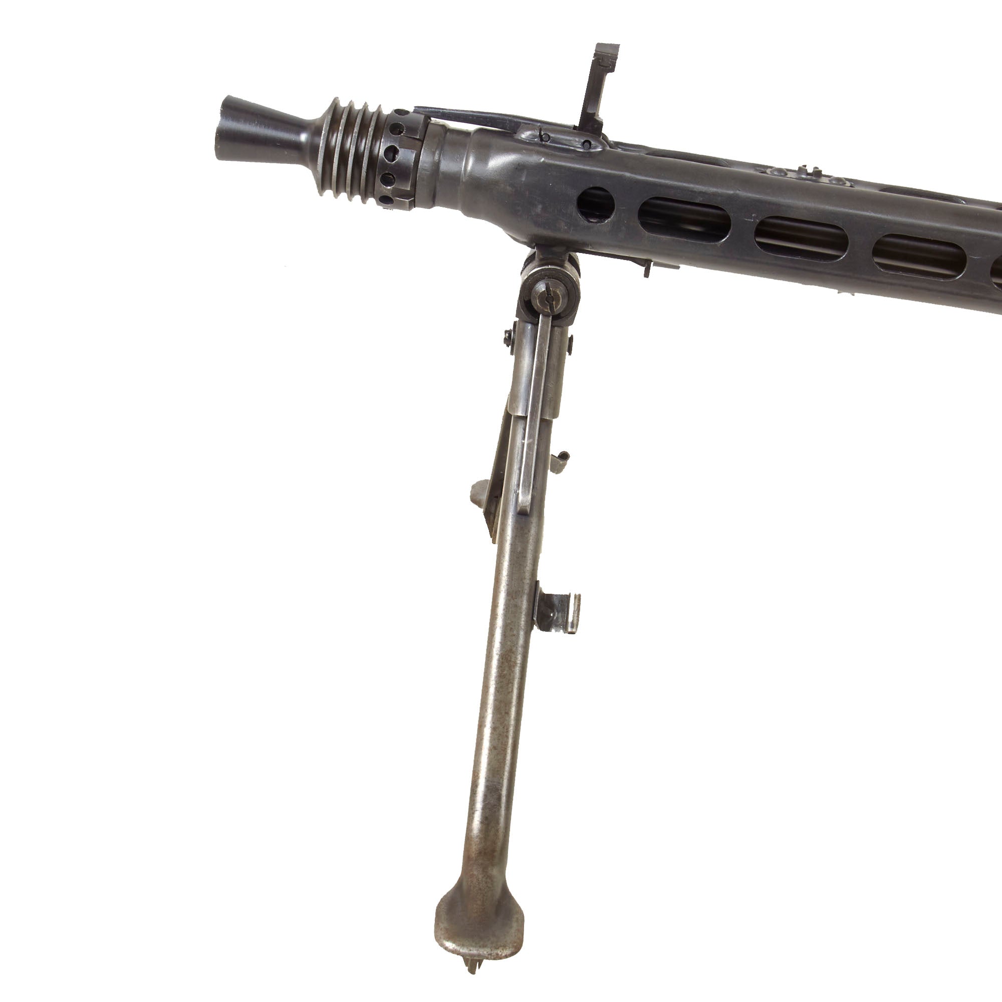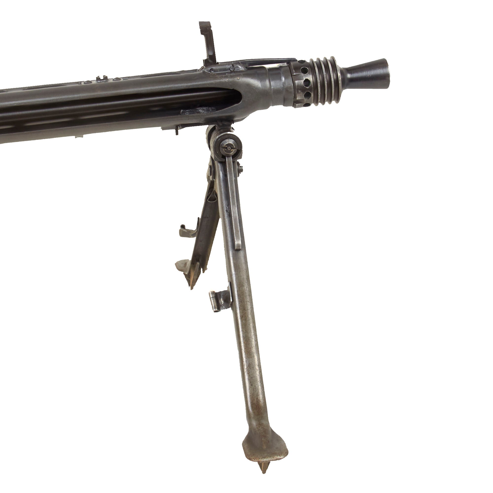 Original Item: Only One Available. Constructed from a legally demilitarized (de-milled) parts set, this is a wonderful and rare German WWII MG42 Display Gun. It is built from all original parts on an original BATF compliant non-firing display receiver, making this a 100% legal display machine gun. This receiver was created by using portions of the original torch cut receiver, including the barrel bushing, combined with a new made solid steel portion under the feed tray. It has properly had a 25% section of the total length completely replaced entirely with solid steel bar stock. Meaning a 1/4 length section of the display receiver is solid steel, making this totally legal to own without a license of any kind.