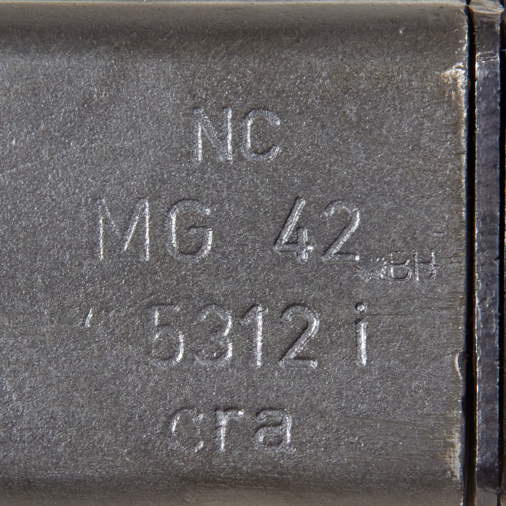 "cra" is the maker code for MAGET - Maschinen und Geraetetbau GmbH, in Berlin-Tegel. This company was previously known as ALKETT-Altmärkische Kettenweke GmbH, Werk II, but was was renamed in 1942-1943. They used the code "cra" until 1944, when they changed their maker code to "swd" for 1945 only. They made MG34 and MG42 machine guns, and also made components for armored vehicles. The top rear of the receiver is marked on either side with Waffenamt WaA11 codes, correct for this maker. Next to the markings is an EAGLE BH marking, indicating post war service with the Austrian Bundes Heer. The top of the barrel change assembly is also marked with a Waffenamt WaA11 code.