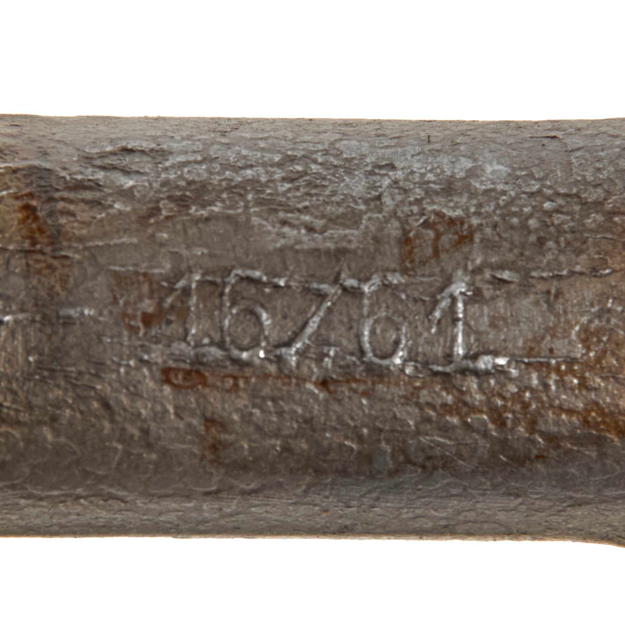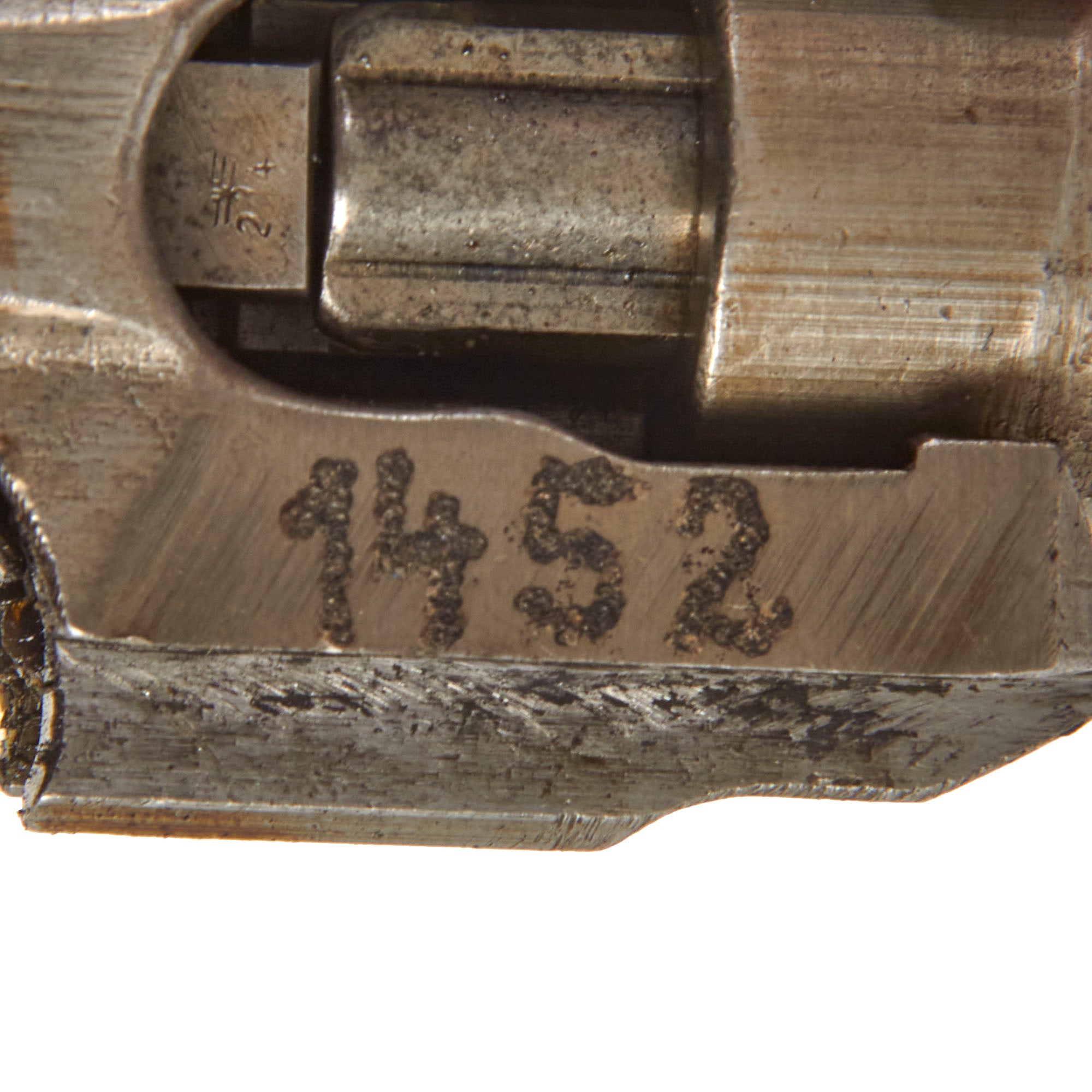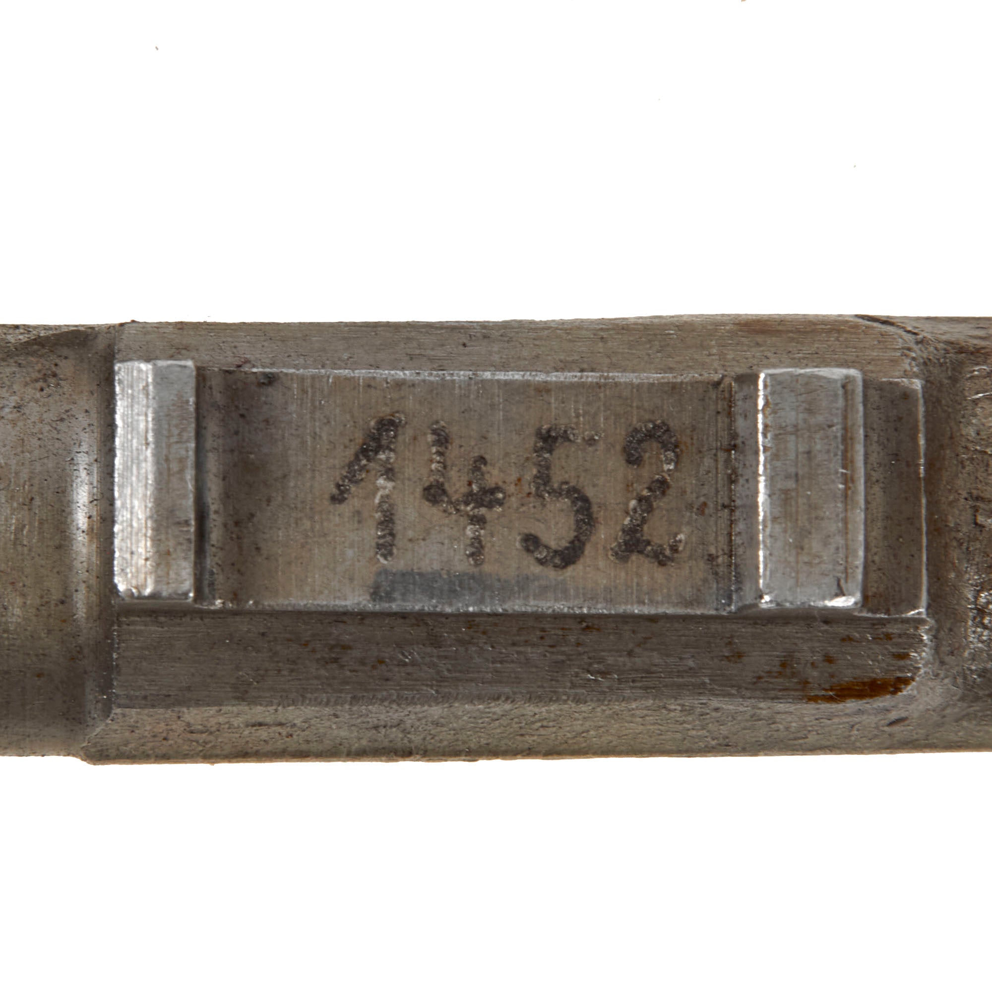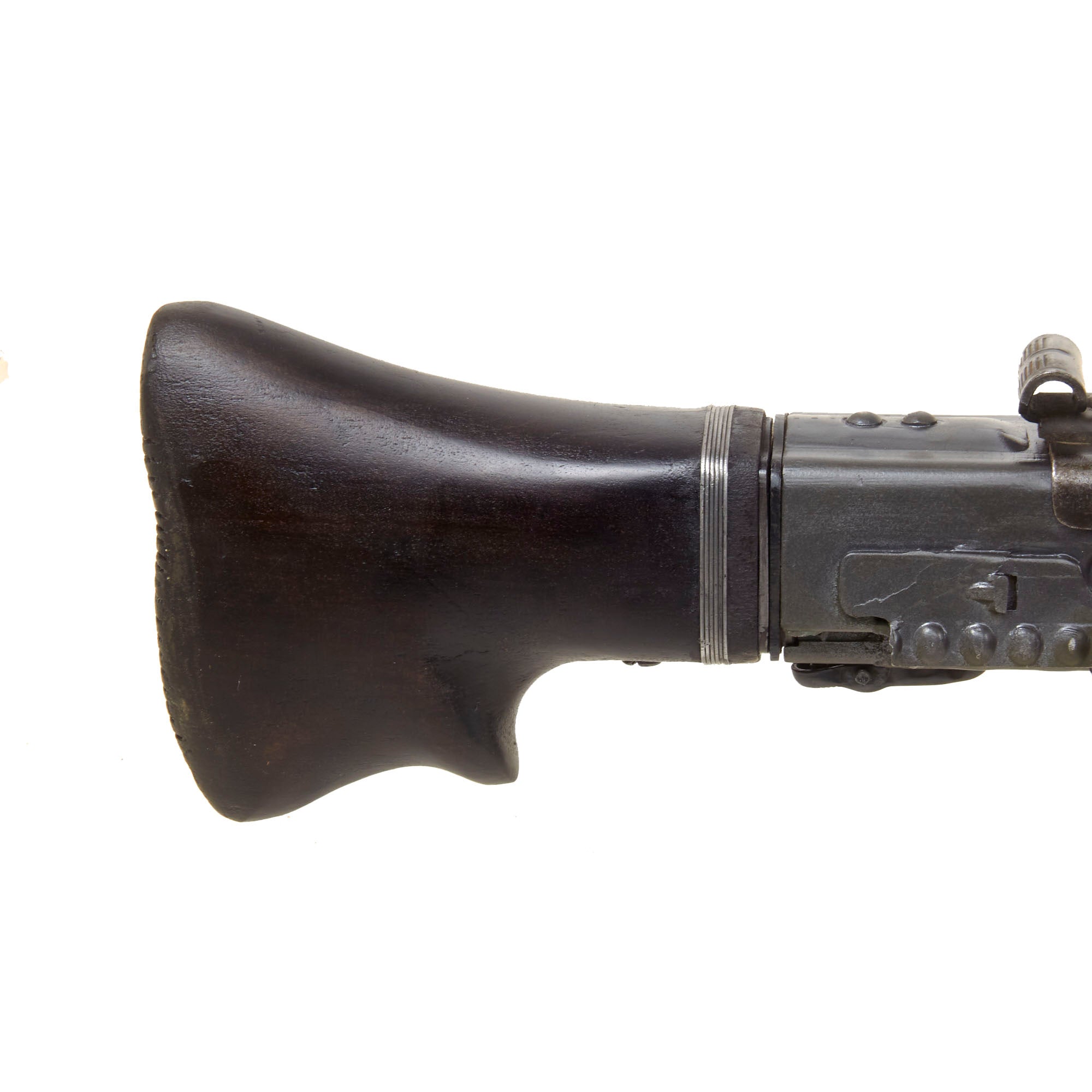 The bipod is the correct type, without a height adjustment, and is in very good shape, looking to possibly have been repaired in the past. There is some oxidation and/or wear around the central hub where the markings would usually be, which has obscured the markings. We can see that it was marked, but cannot read them. The butt stock has been worn down a bit over the years, and has a lovely black finish present, as we usually see on these. It has the wire wrapping around the connecting end, like we usually see, and can easily be removed from the gun. This display gun bears additional markings on various components. This display gun bears additional markings on various components.