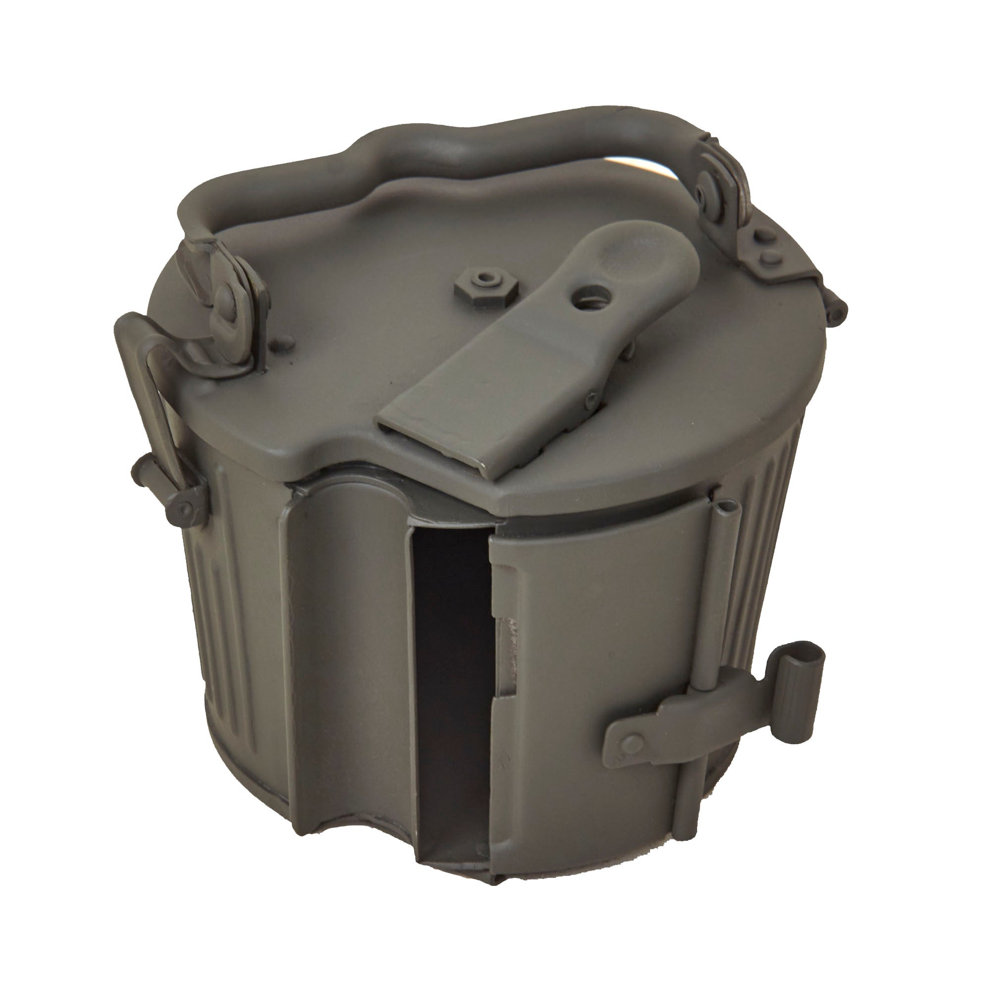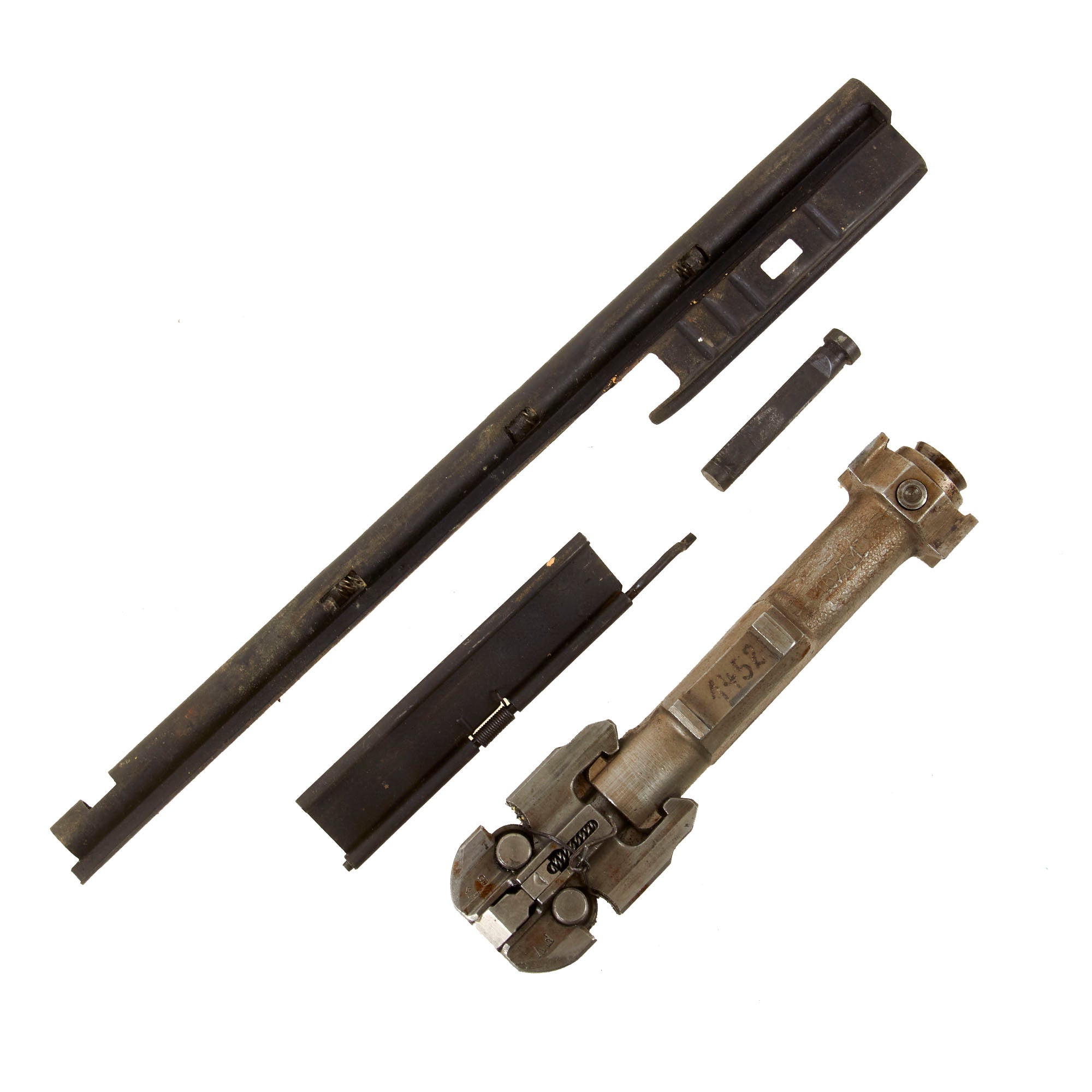 Condition-wise, it is one of the best we have seen in years, and doesn't have lots of crossed out markings as so many do. It also comes with parts not used during the construction, including the Recuperator, Bolt Assembly, and Ejection Port cover. The metal finish and overall condition is very good, with the entire re-welded receiver and barrel jacket finished with our lovely "gunmetal gray" paint, and it will make a fantastic addition to any WWII Collection. It comes complete with German WWII issue parts including a black finished wooden butt stock, as well as a basket belt carrier painted with our period correct panzergrau paint. It has a wartime production original bipod, and the barrel change assembly is still present and able to be opened. However, the barrel cannot be removed because the recoil booster is most likely welded into the muzzle, so the barrel cannot be angled enough to get it out.