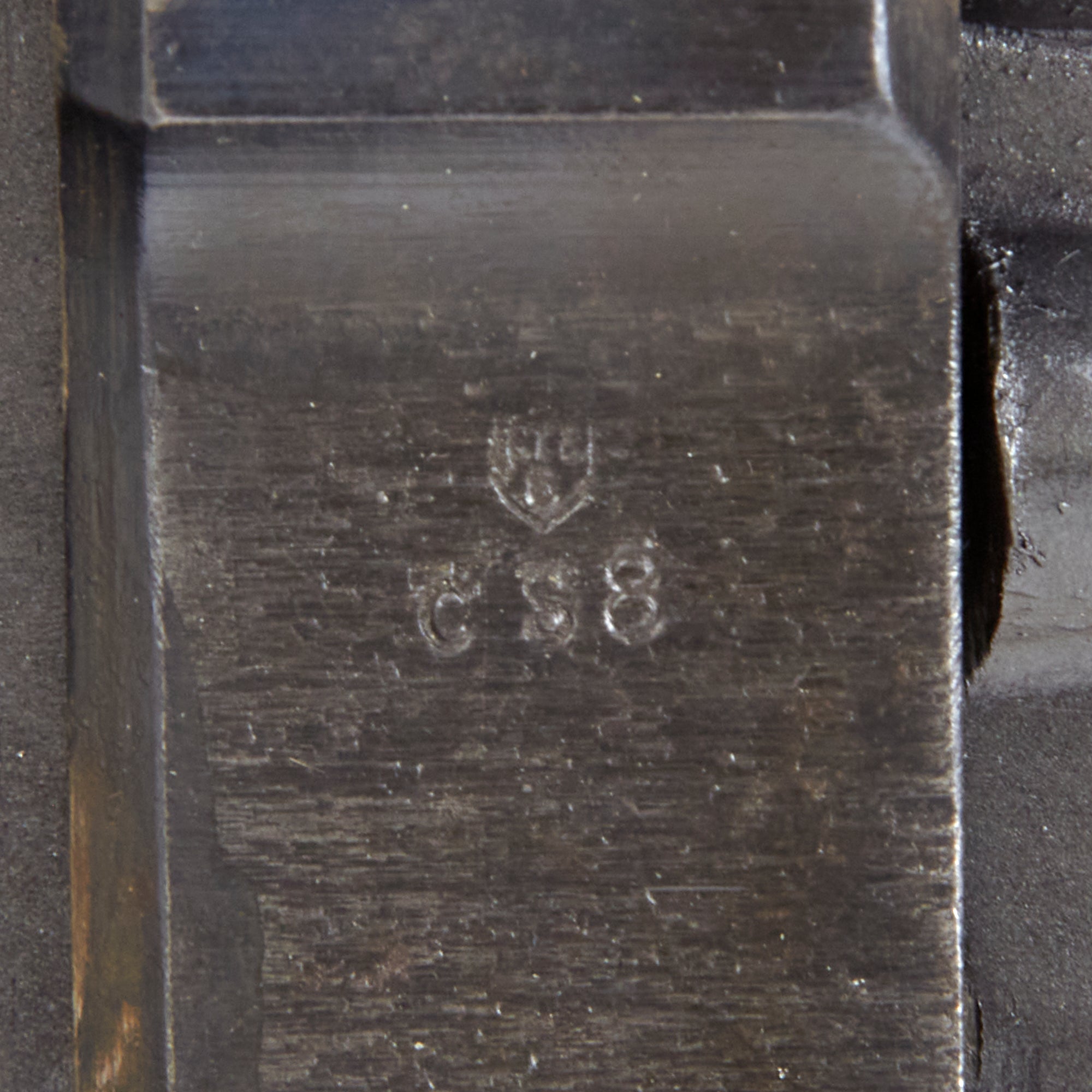 The top cover shows some past oxidation, and we were not able to find any maker codes or serial numbers, though it does not look like a serial number was ever added. We did however see a Waffenamt WaA147 inspection stamp, which is associated with Johannes Grossfuss AG of Dölbeln in Sachsen, a known maker of top covers and feed trays for both the MG 34 and 42. We checked, and there is also a bpr stamped on the feed mechanism underneath, the maker code for Grossfuss, so we assume they made the top cover as well. The bottom feed tray does not have any WWII markings, and looks to have been re-marked with a Post War Yugo marking on the bottom.