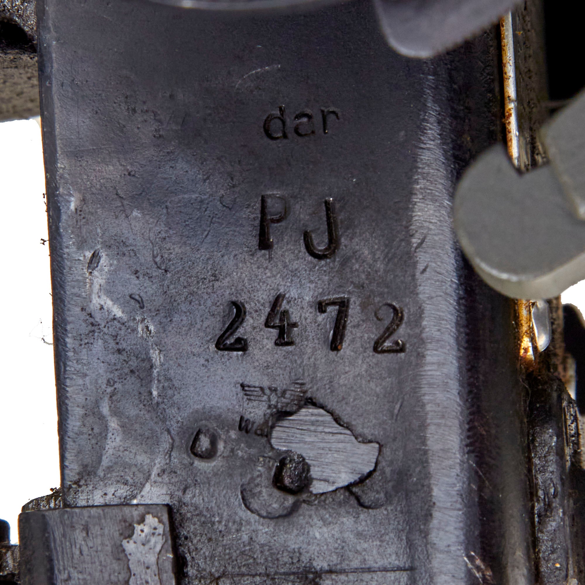 "dar" is the letter code for another known maker of MG 42 lafettes and components, Metallindustrie Schönebeck A.G., located on the Elbe River. For this maker, the code "PJ" is also for 1944, so both major components of the lafette were made during this year. These markings are fully legible and totally correct, making this a fantastic offering!