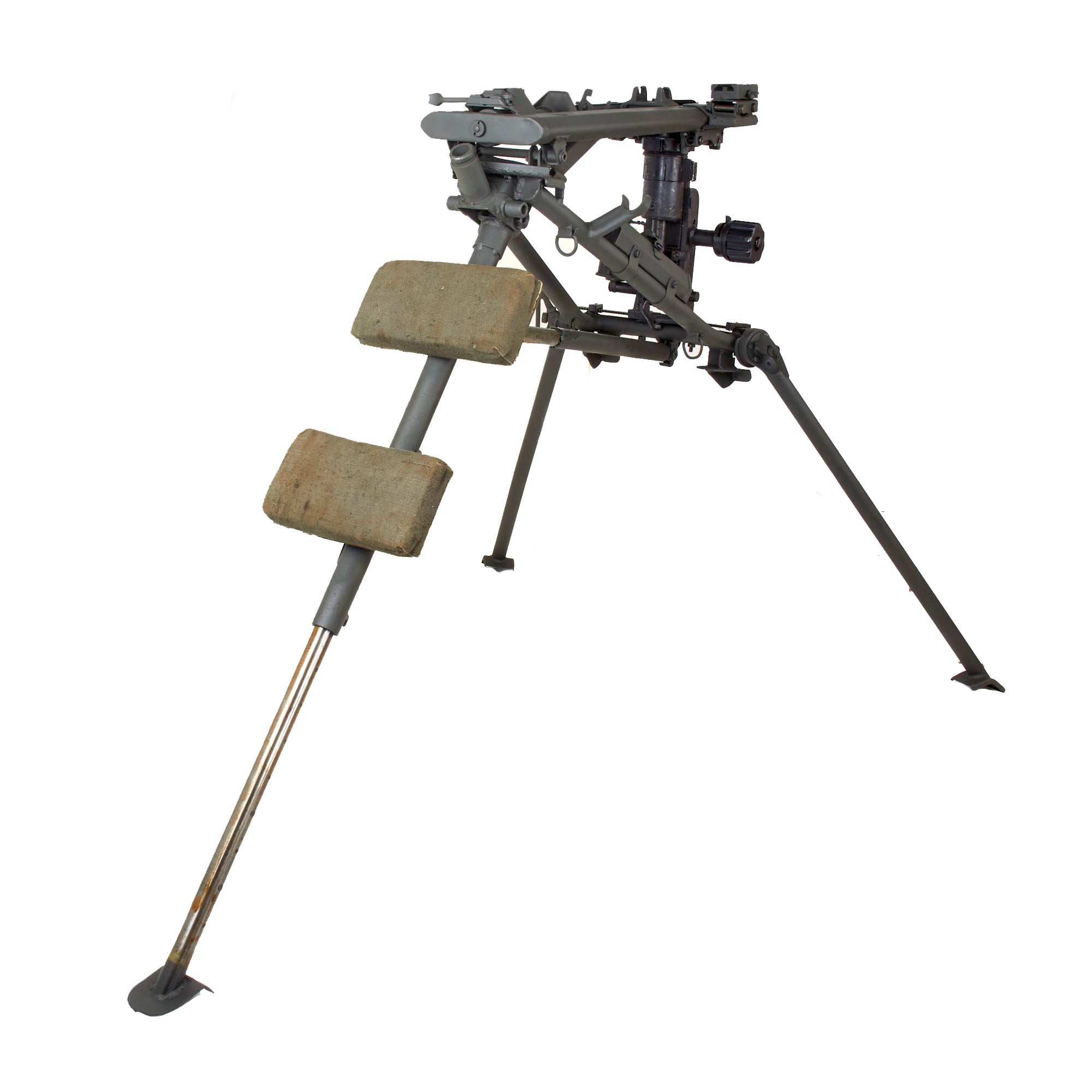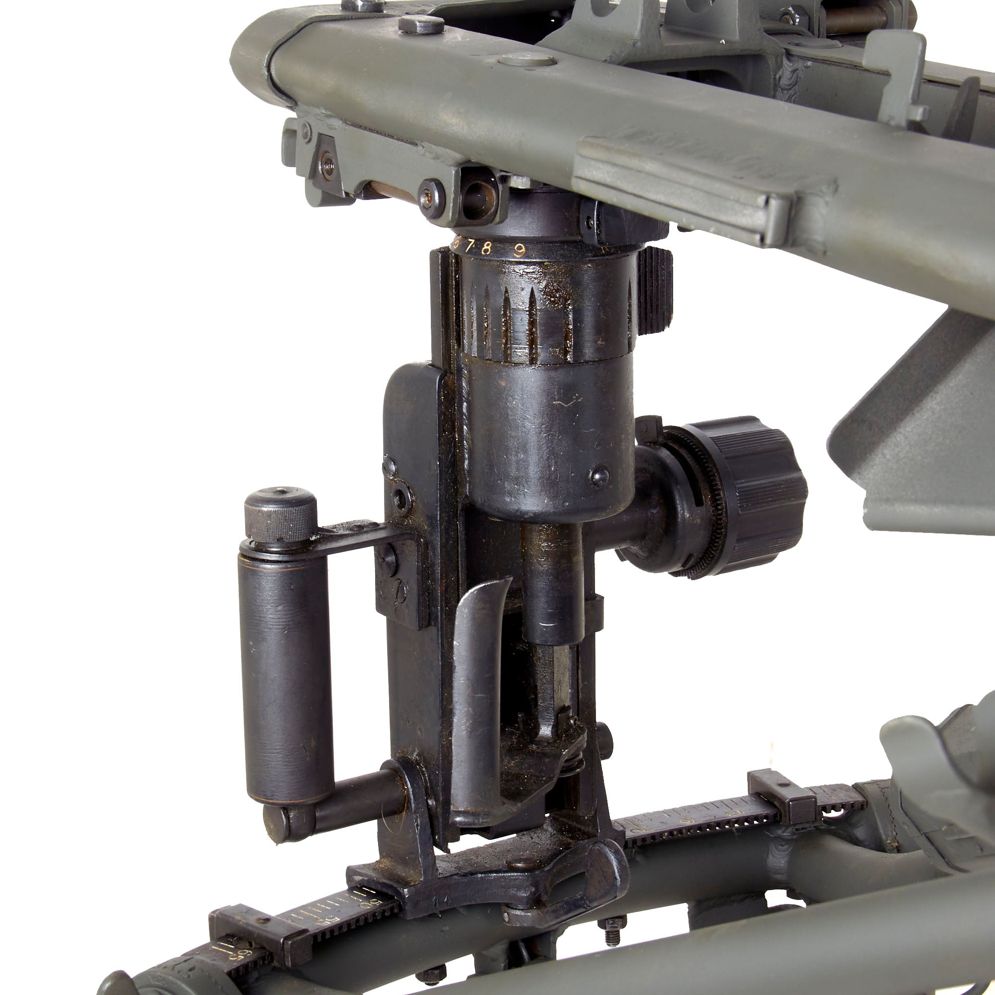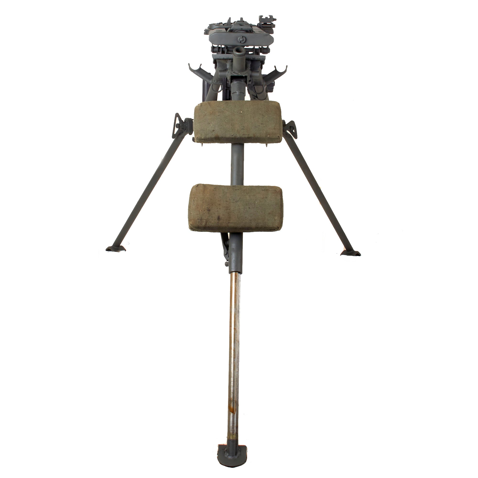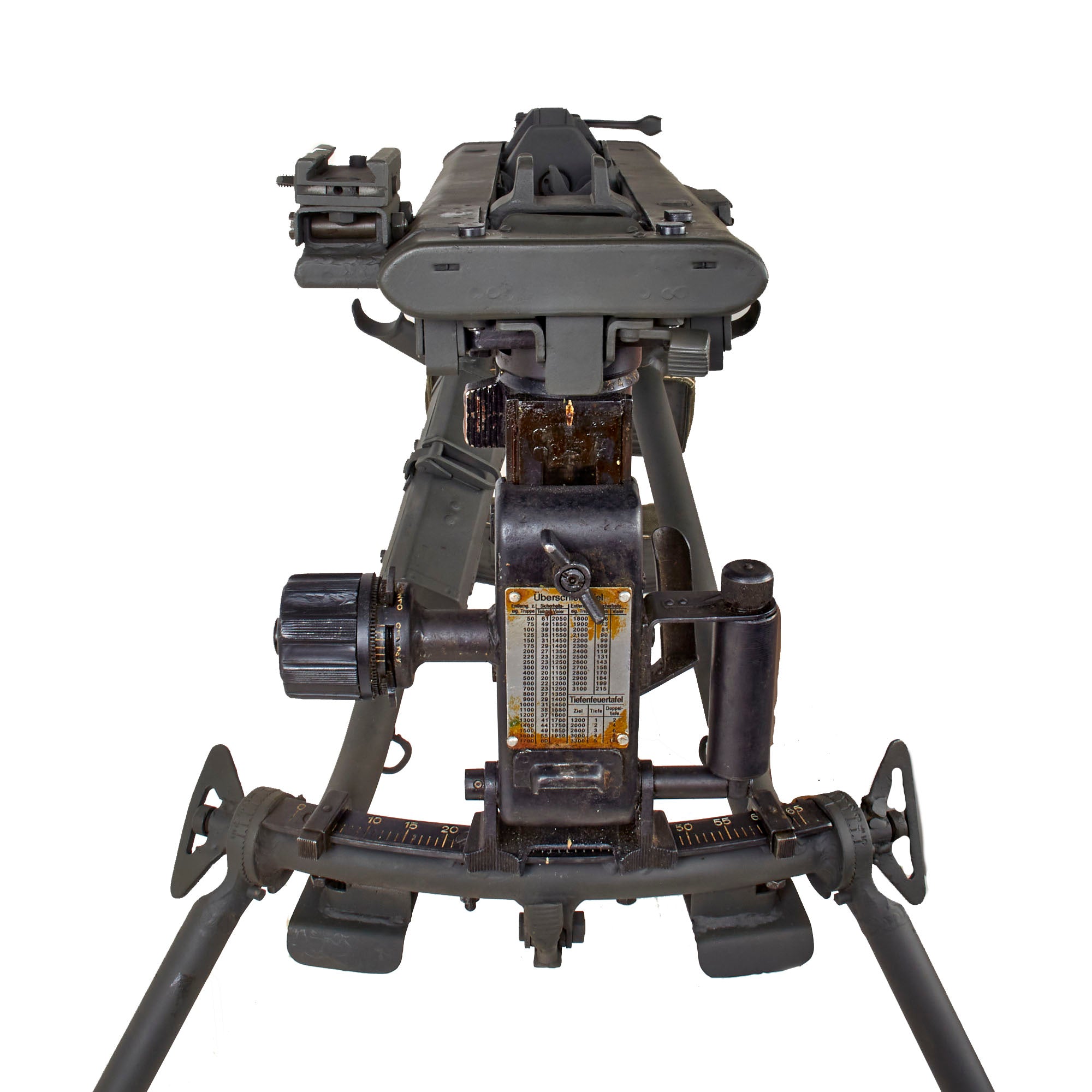 Features precision German engineering representative of the nation's arms and accessories of the time with fully-functional telescopic base and extension legs that provide increased ground clearance for sustained fire and allow the tripod to be used in an anti-aircraft role with the appropriate extension (not included). The rear remote trigger handle is present, however the linkage on the top of the search fire mechanism is missing, so there is nothing connecting it to the right upper portion of the lafette. It also looks like the internal linkage inside the tripod is not connected correctly anymore either.