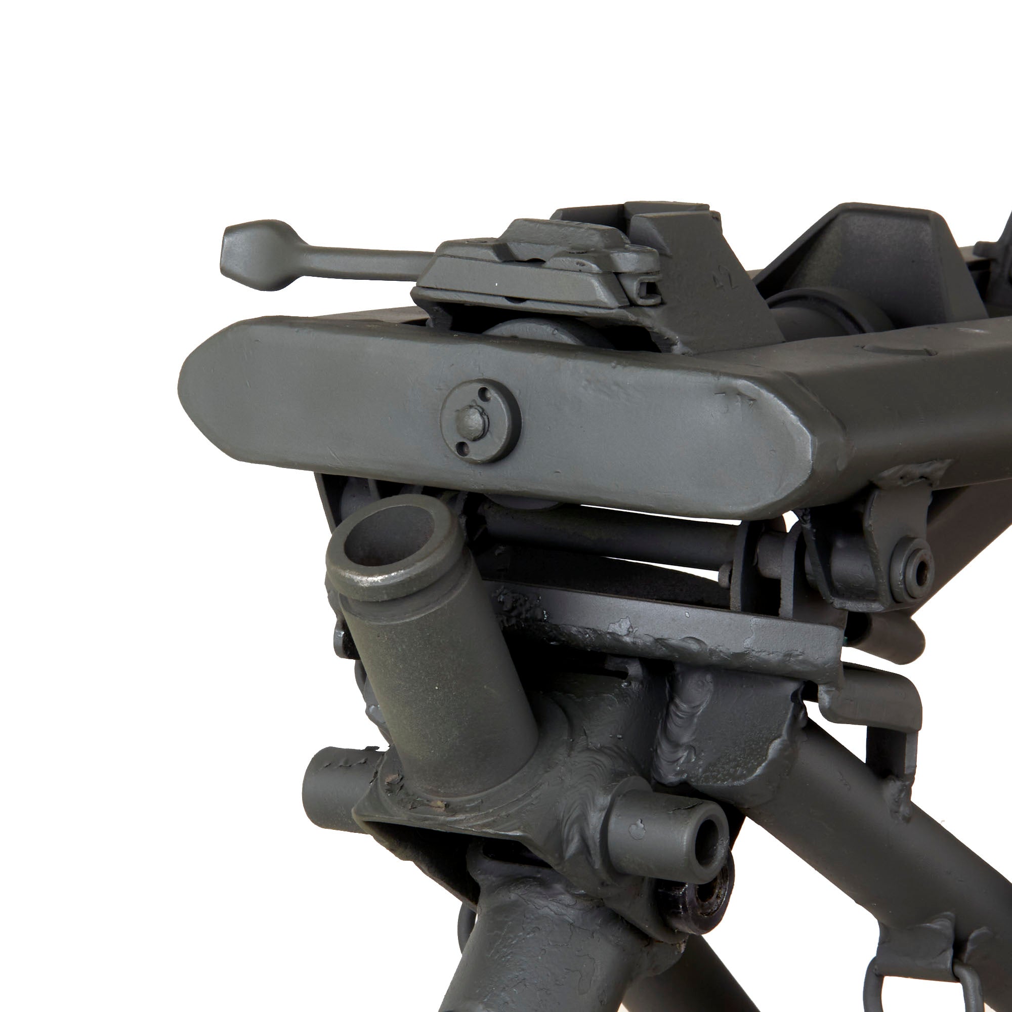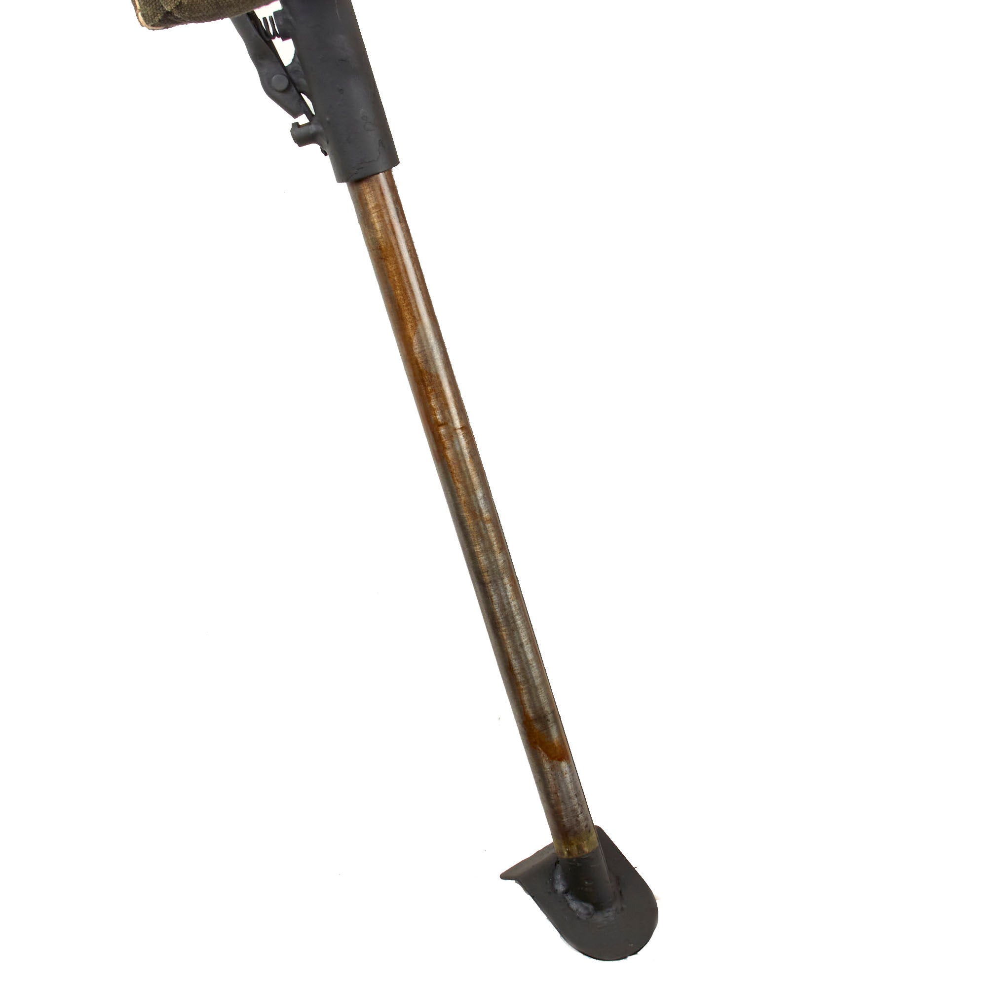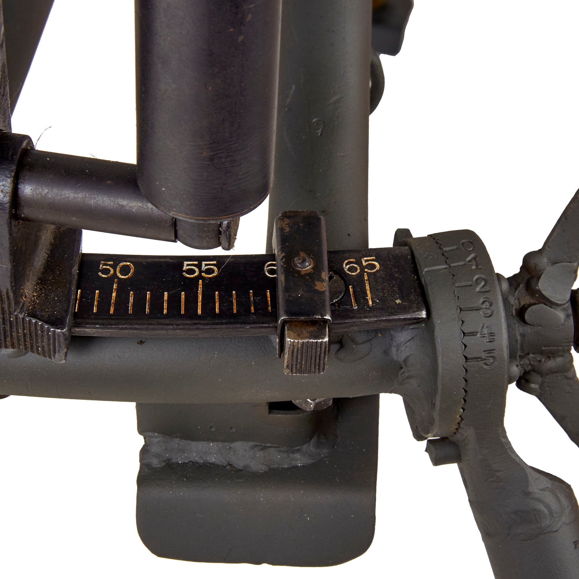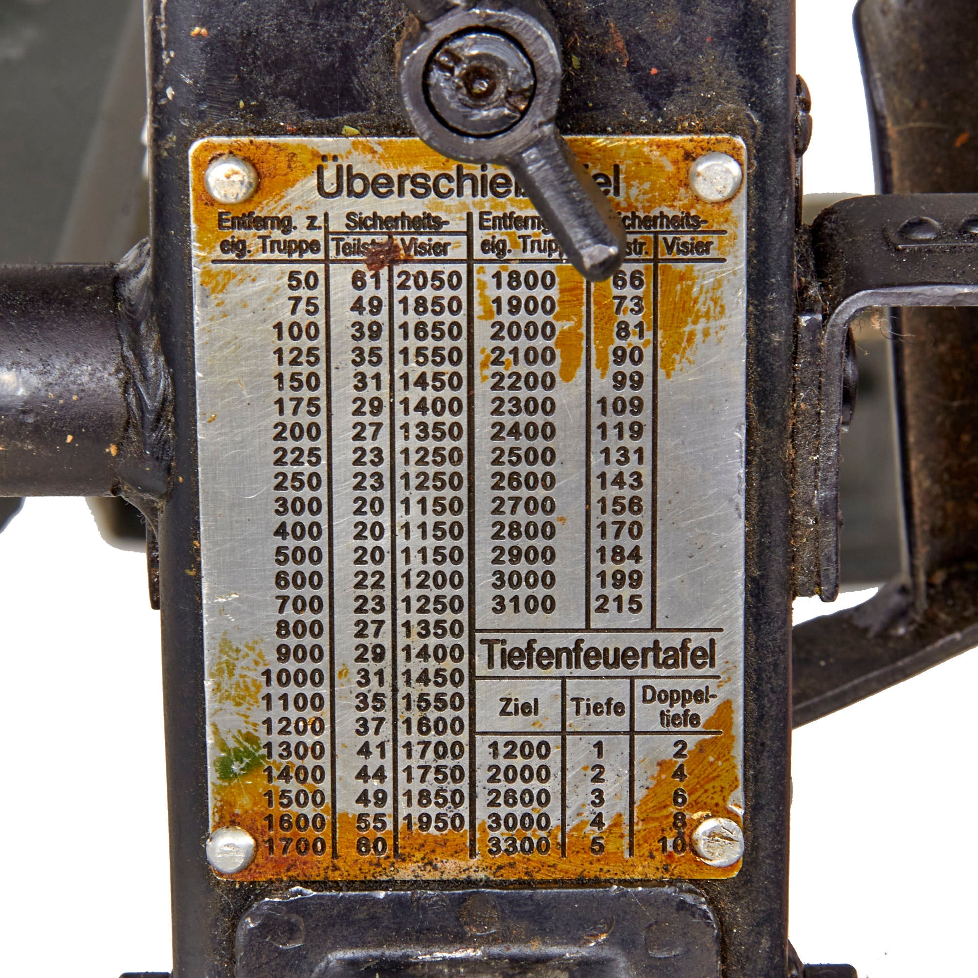 Features precision German engineering representative of the nation's arms and accessories of the time with fully-functional telescopic base and extension legs that provide increased ground clearance for sustained fire and allow the tripod to be used in an anti-aircraft role with the appropriate extension (not included). The rear remote trigger handle is present, however the linkage on the top of the search fire mechanism is missing, so there is nothing connecting it to the right upper portion of the lafette. It also looks like the internal linkage inside the tripod is not connected correctly anymore either.