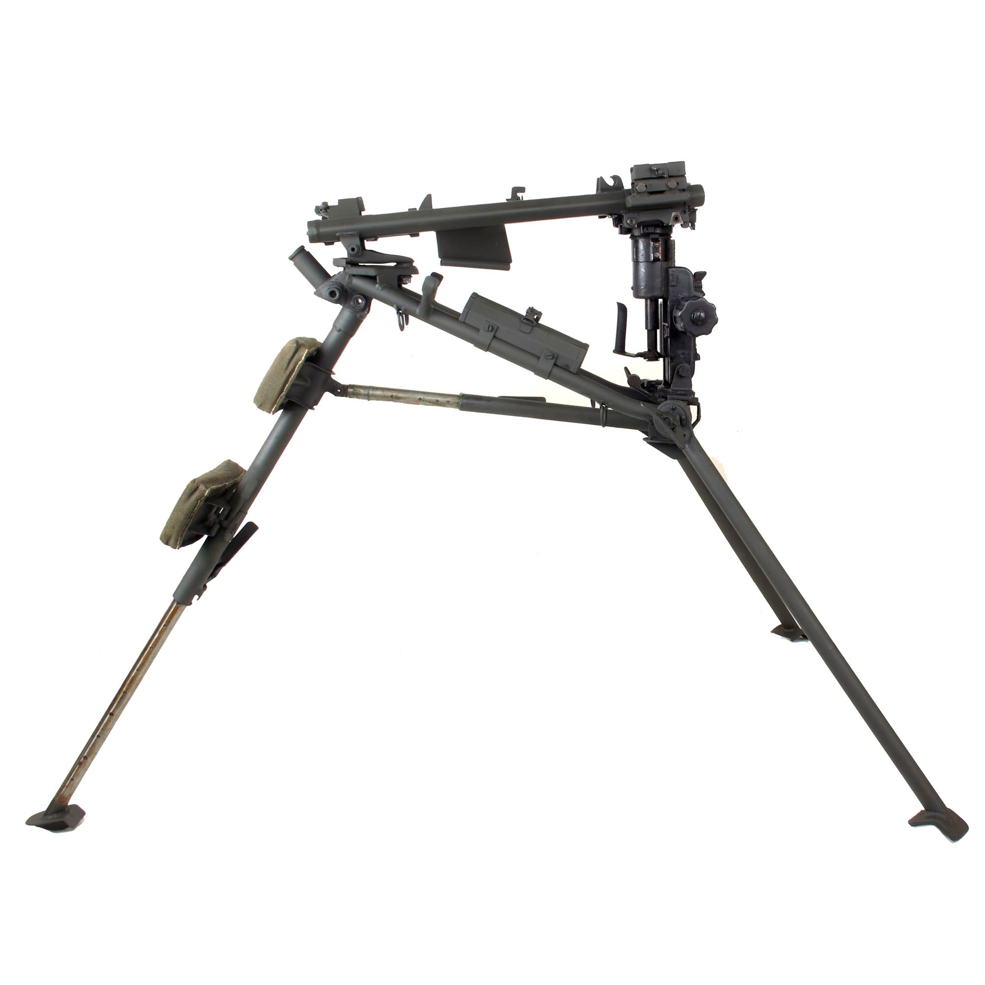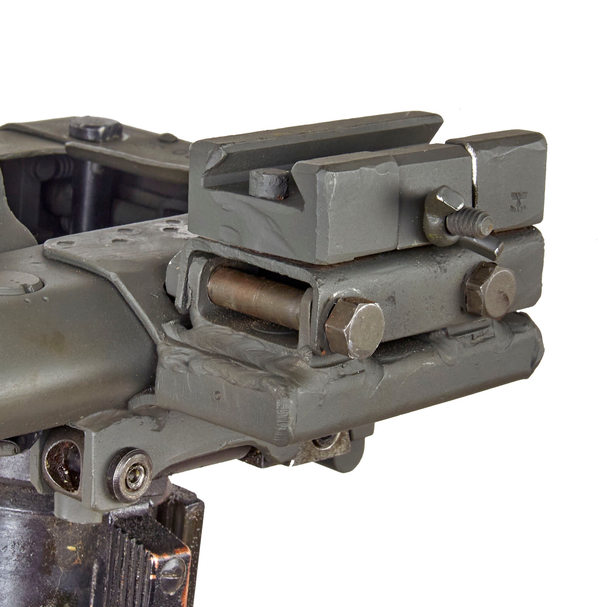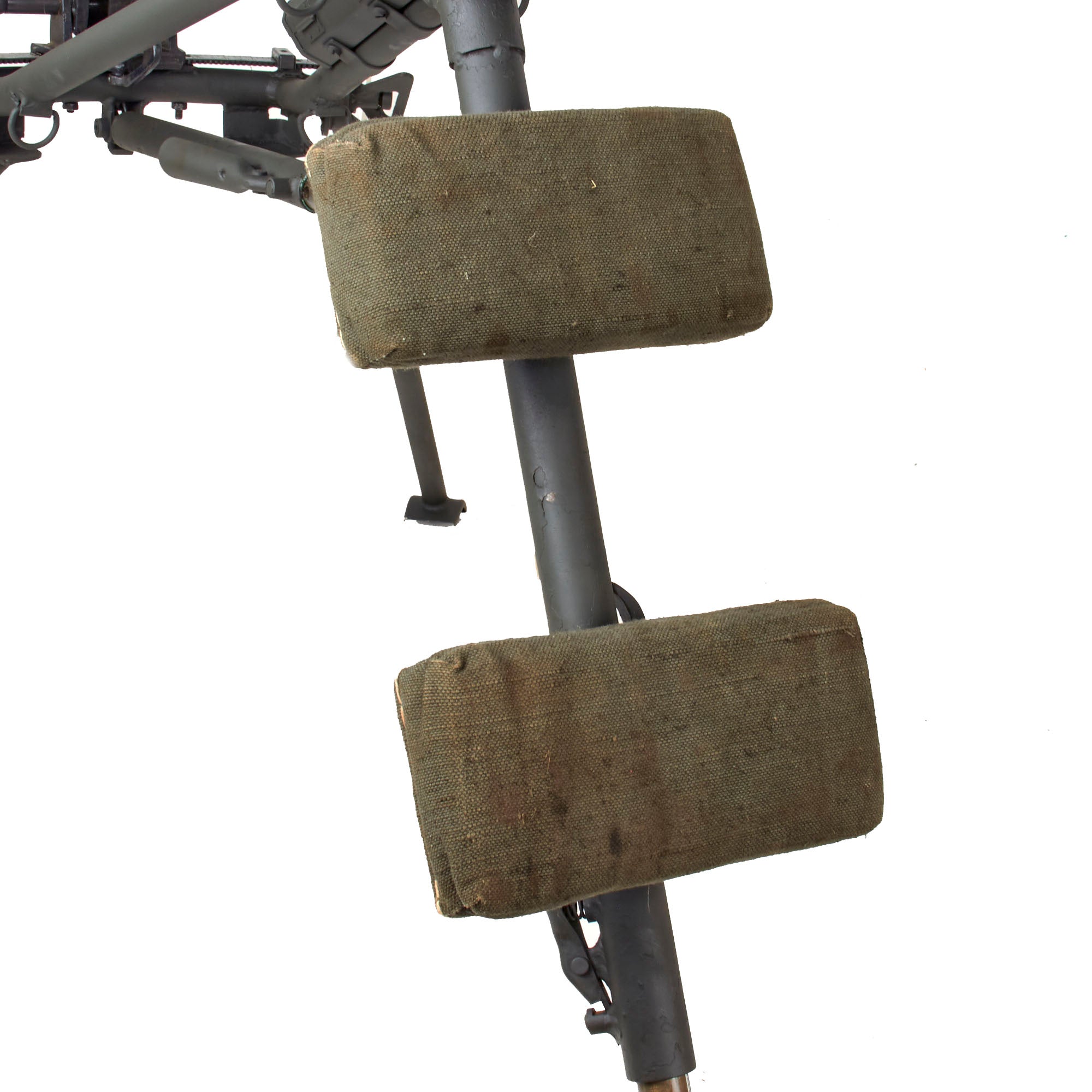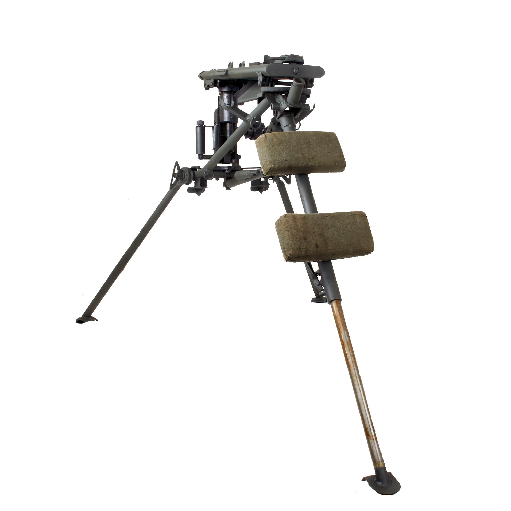 Features precision German engineering representative of the nation's arms and accessories of the time with fully-functional telescopic base and extension legs that provide increased ground clearance for sustained fire and allow the tripod to be used in an anti-aircraft role with the appropriate extension (not included). The rear remote trigger handle is present, however the linkage on the top of the search fire mechanism is missing, so there is nothing connecting it to the right upper portion of the lafette. It also looks like the internal linkage inside the tripod is not connected correctly anymore either.