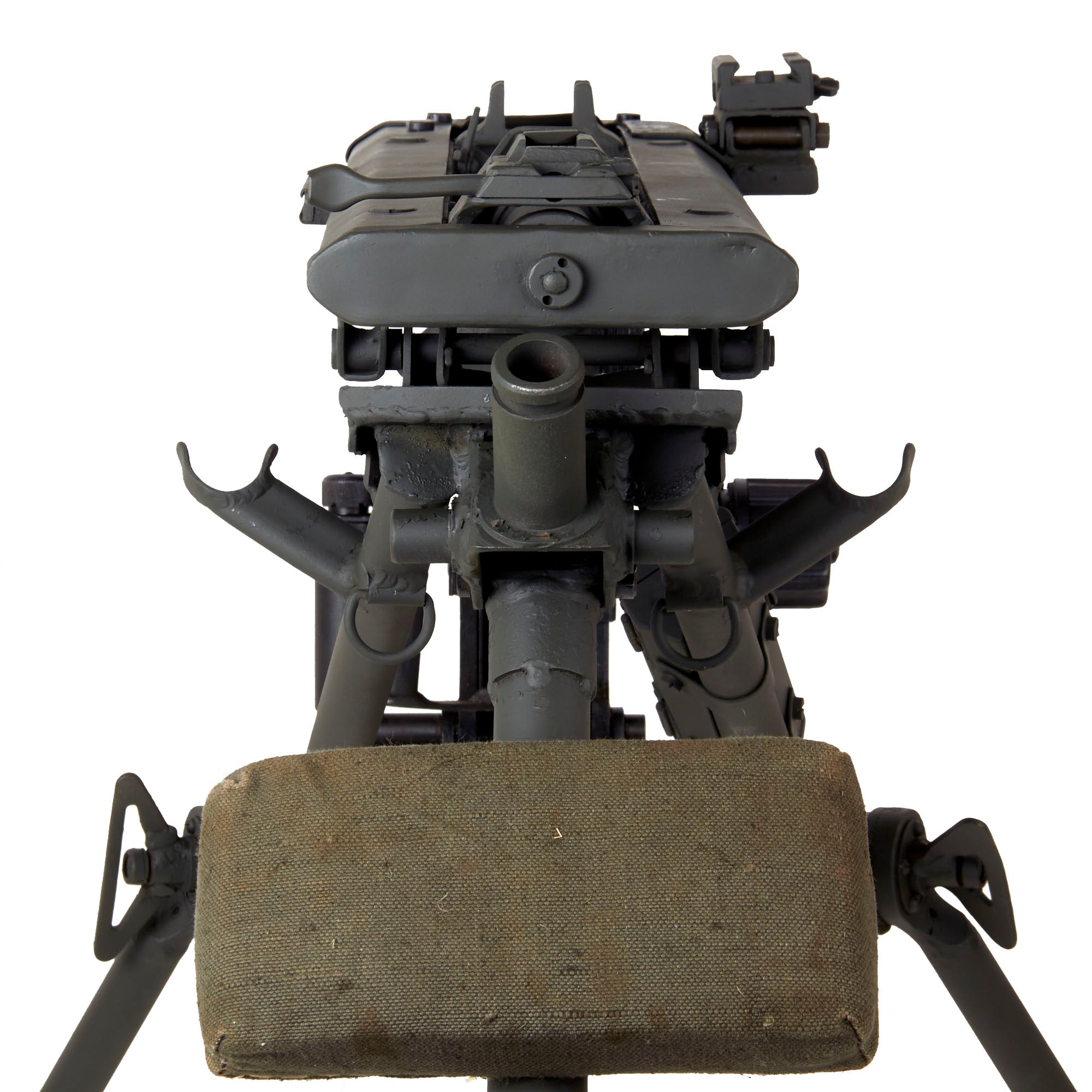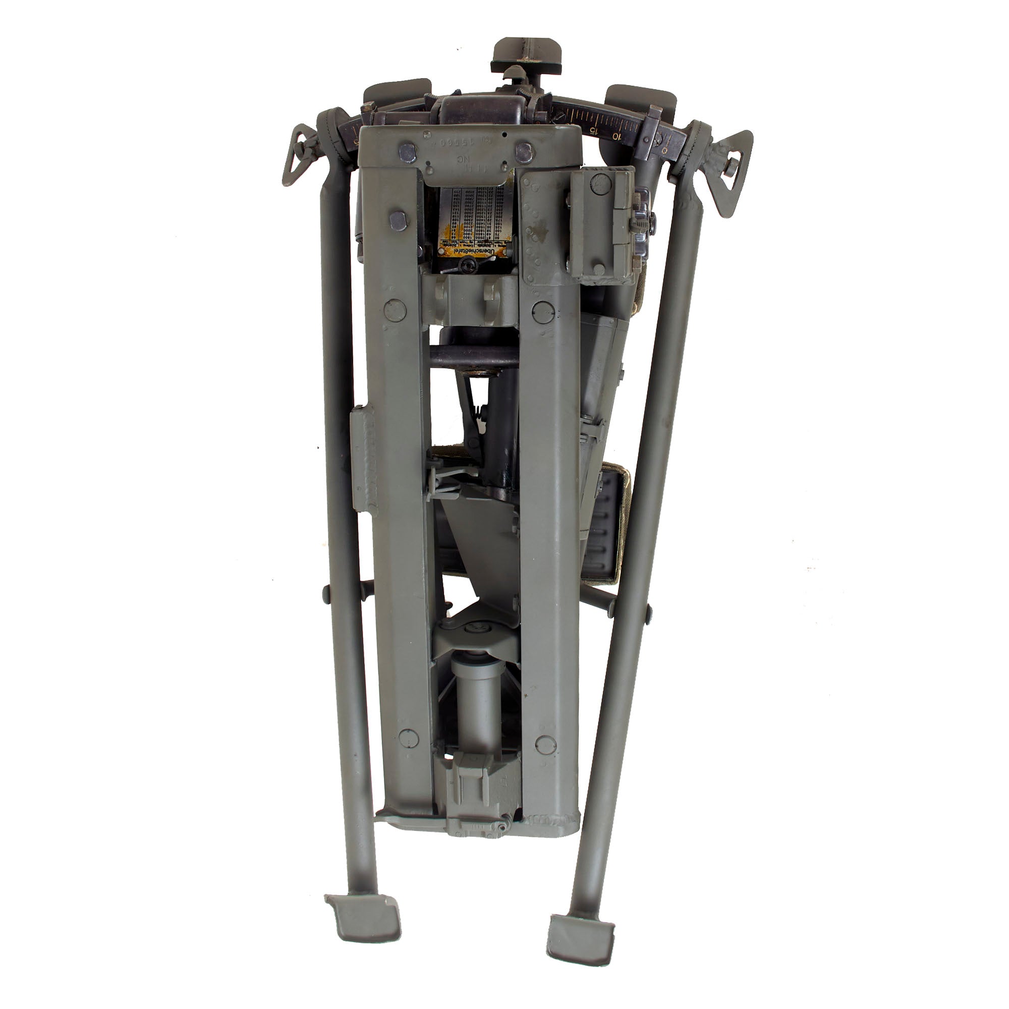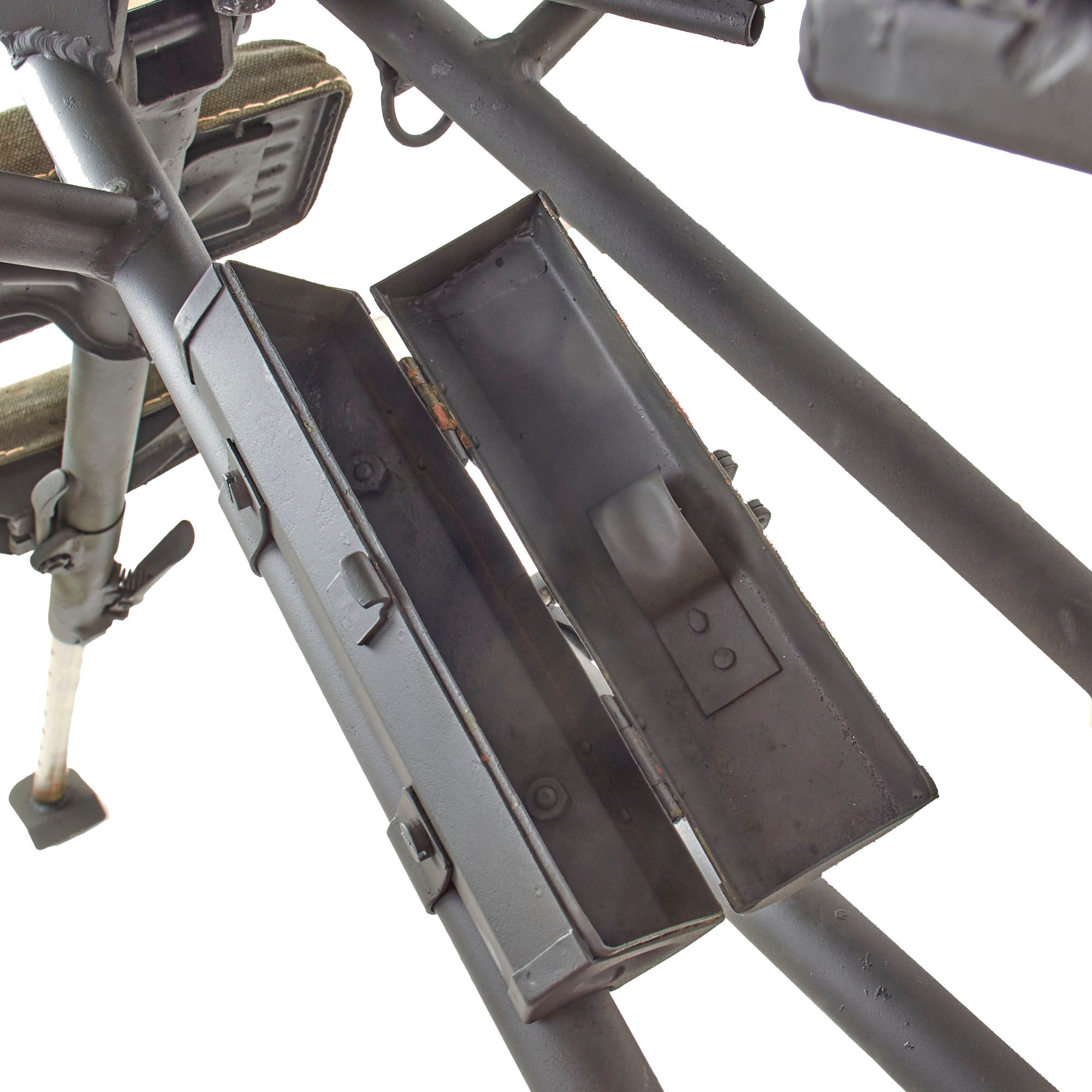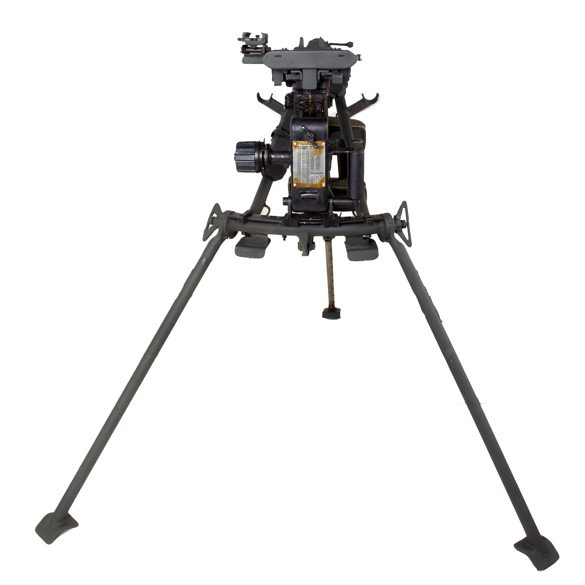 Features precision German engineering representative of the nation's arms and accessories of the time with fully-functional telescopic base and extension legs that provide increased ground clearance for sustained fire and allow the tripod to be used in an anti-aircraft role with the appropriate extension (not included). The rear remote trigger handle is present, however the linkage on the top of the search fire mechanism is missing, so there is nothing connecting it to the right upper portion of the lafette. It also looks like the internal linkage inside the tripod is not connected correctly anymore either.