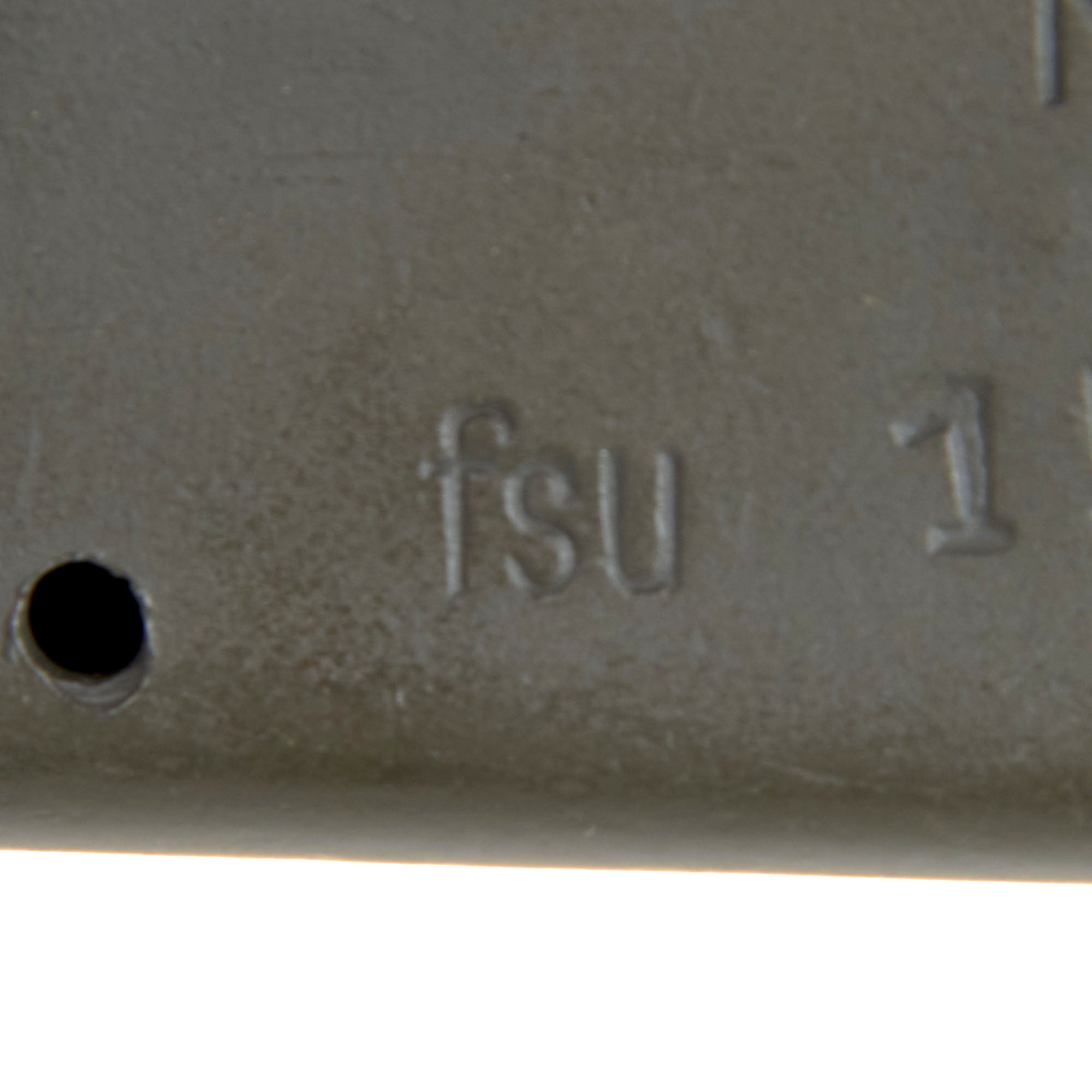 "fsu" is the letter code for known MG 42 lafette maker Brandenburger Fahrrad und Motorradwerk, Excelsior. For this company, the "NC" date code indicates 1944 manufacture. There is also a faint Waffenamt inspection mark to the right of these, which looks to have the code WaA135 under the eagle, however we are not sure of this reading. The left side of the T&E mechanism is also marked with the maker information:-