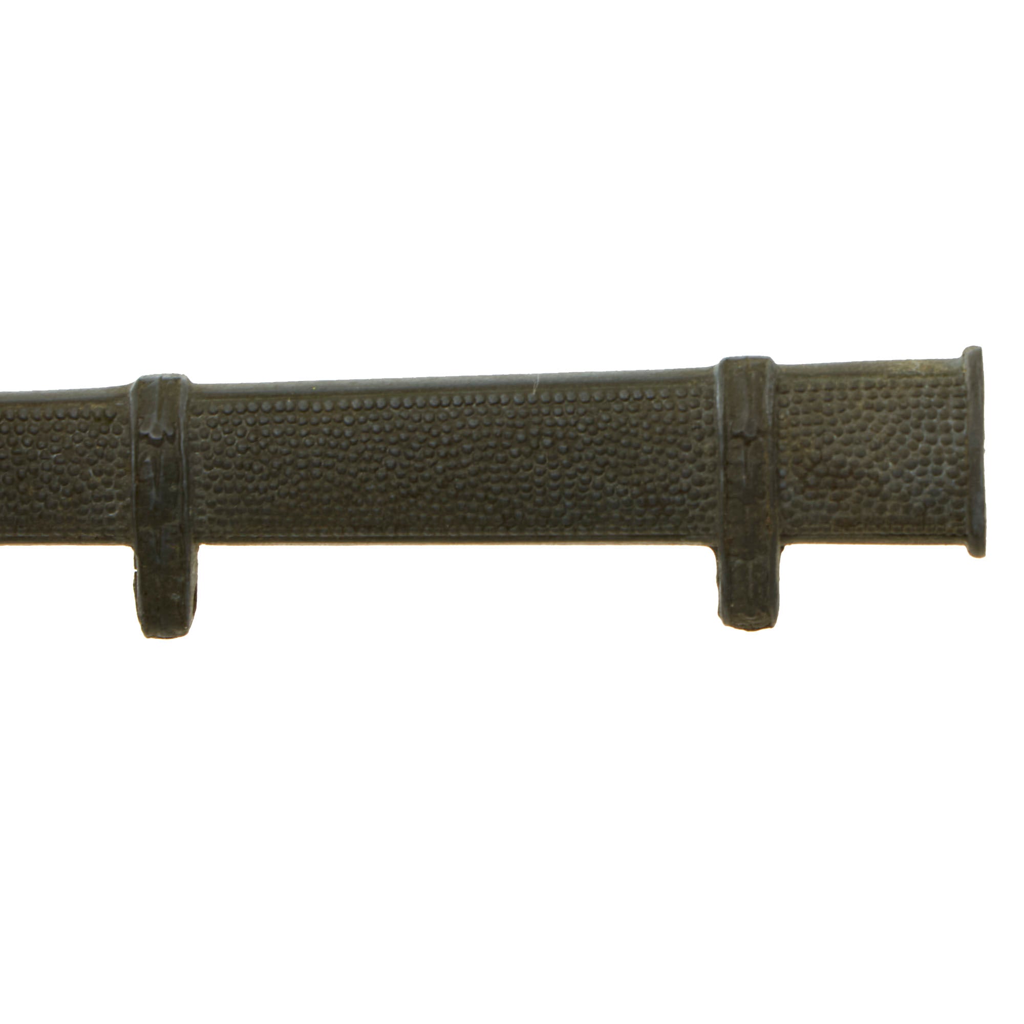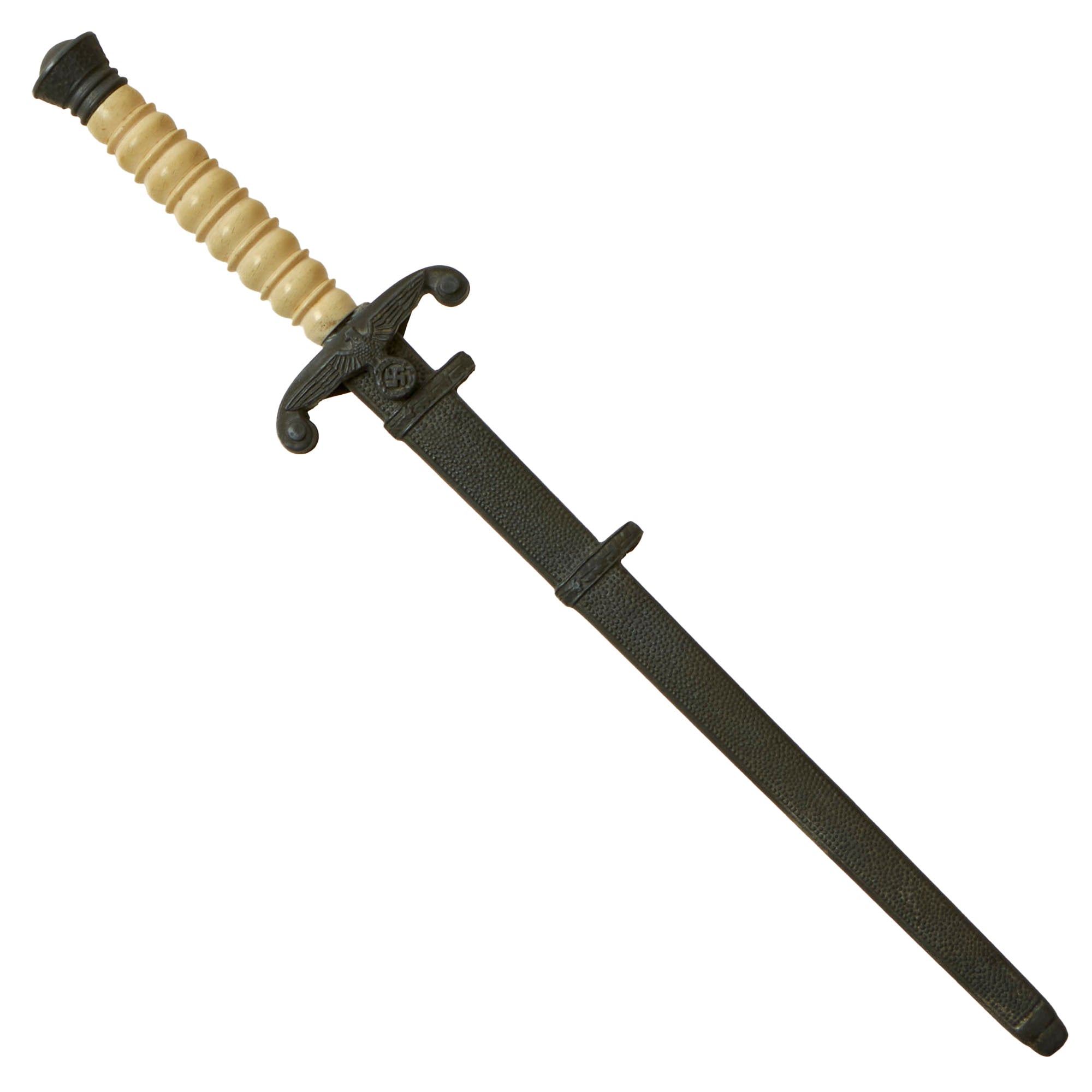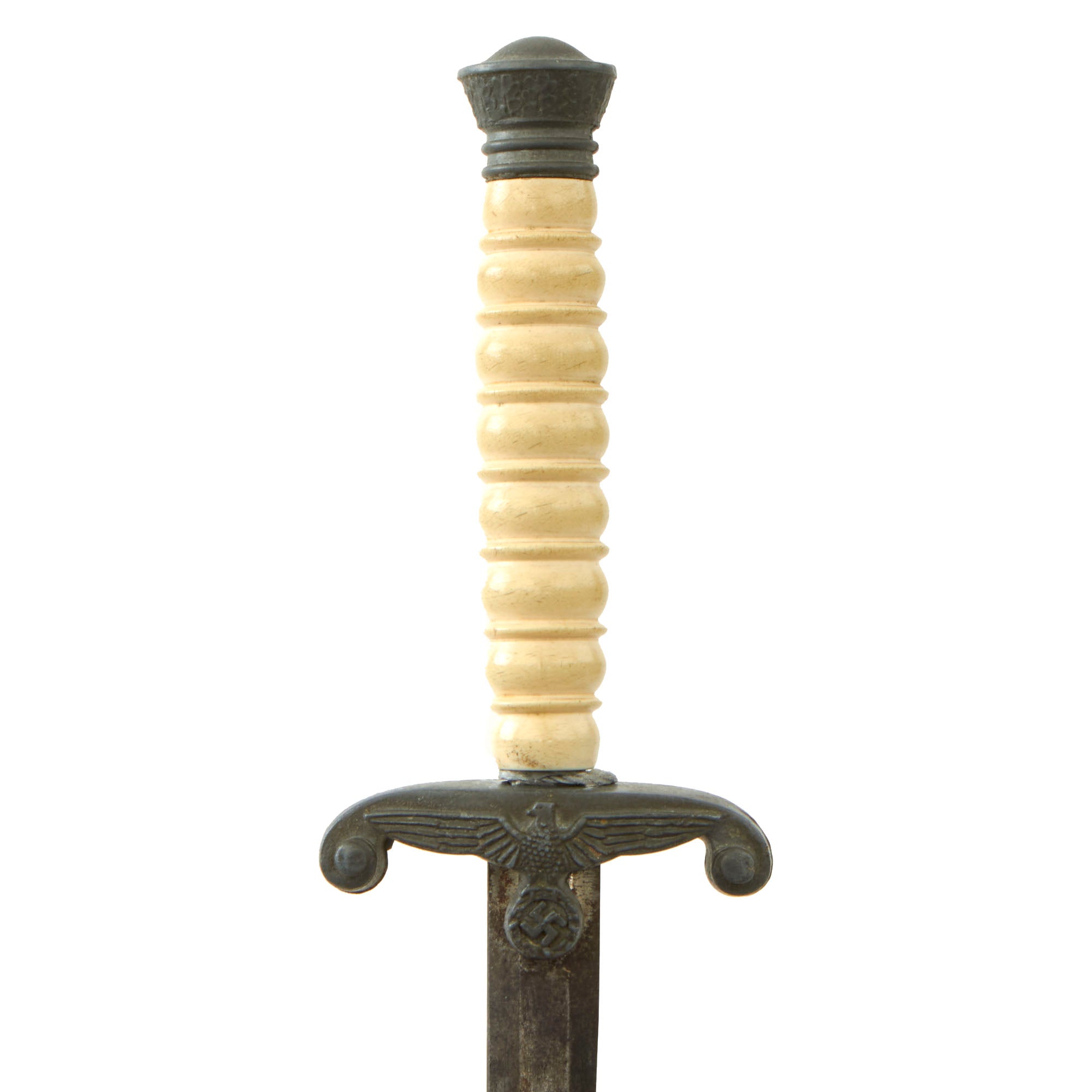 The pommel depicted oak leafing around the outer circumference. The scabbard had panels of pebble designs. Later produced examples were plated with nickel, and late war-made pieces were unplated, finished in a gray color metal. These daggers are often encountered with an aluminum portepee.