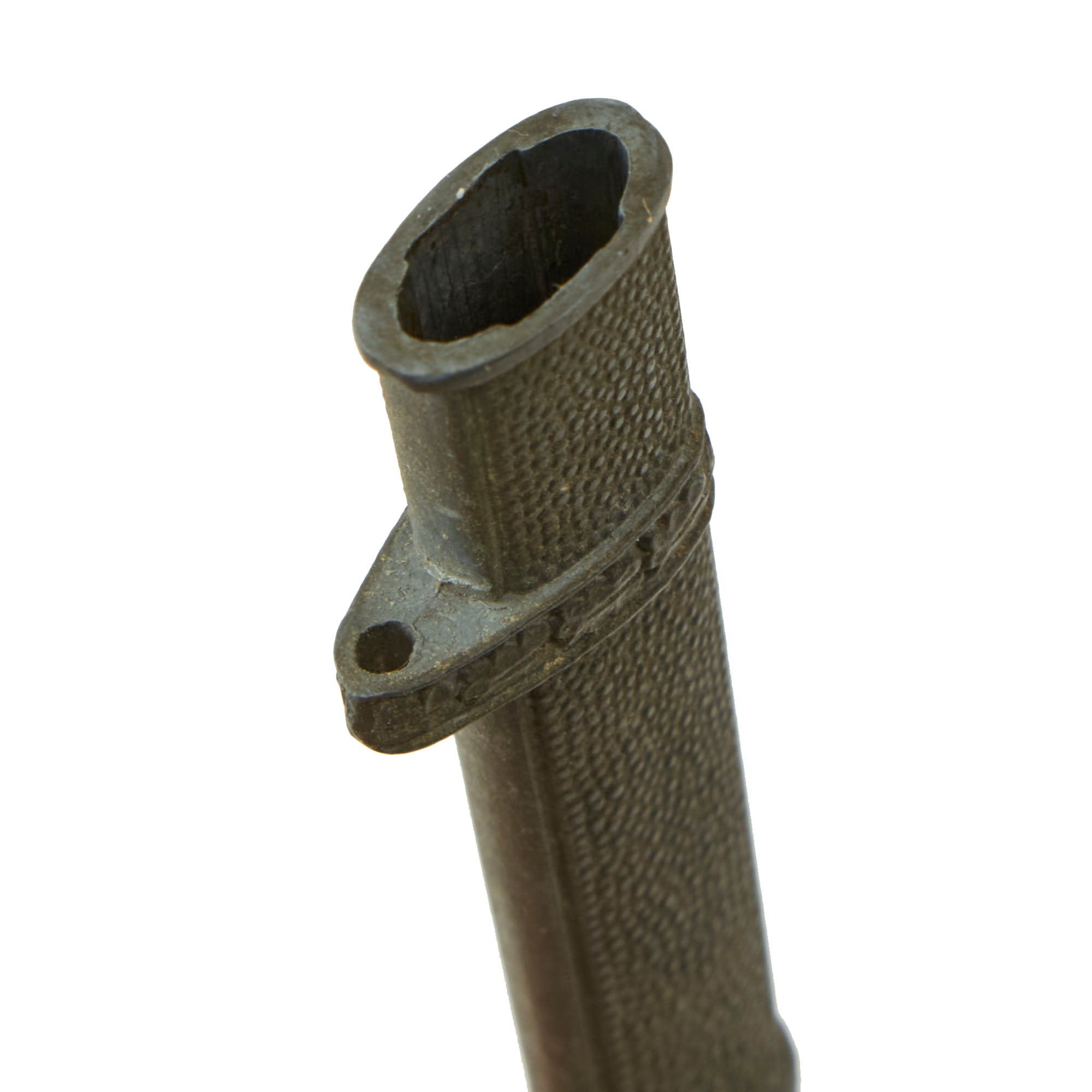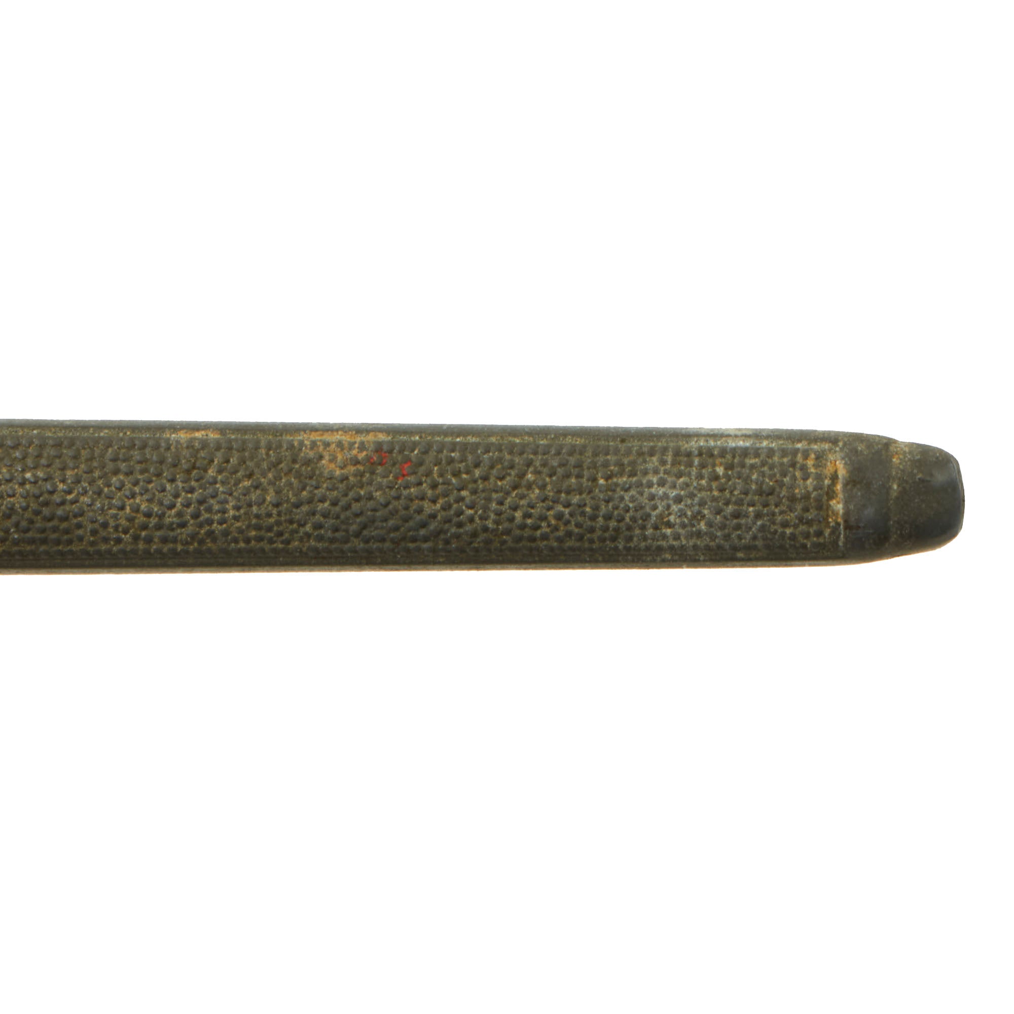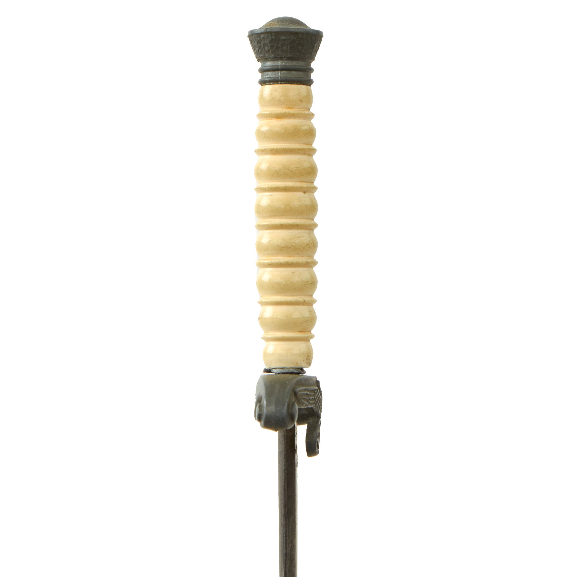 The pommel depicted oak leafing around the outer circumference. The scabbard had panels of pebble designs. Later produced examples were plated with nickel, and late war-made pieces were unplated, finished in a gray color metal. These daggers are often encountered with an aluminum portepee.
