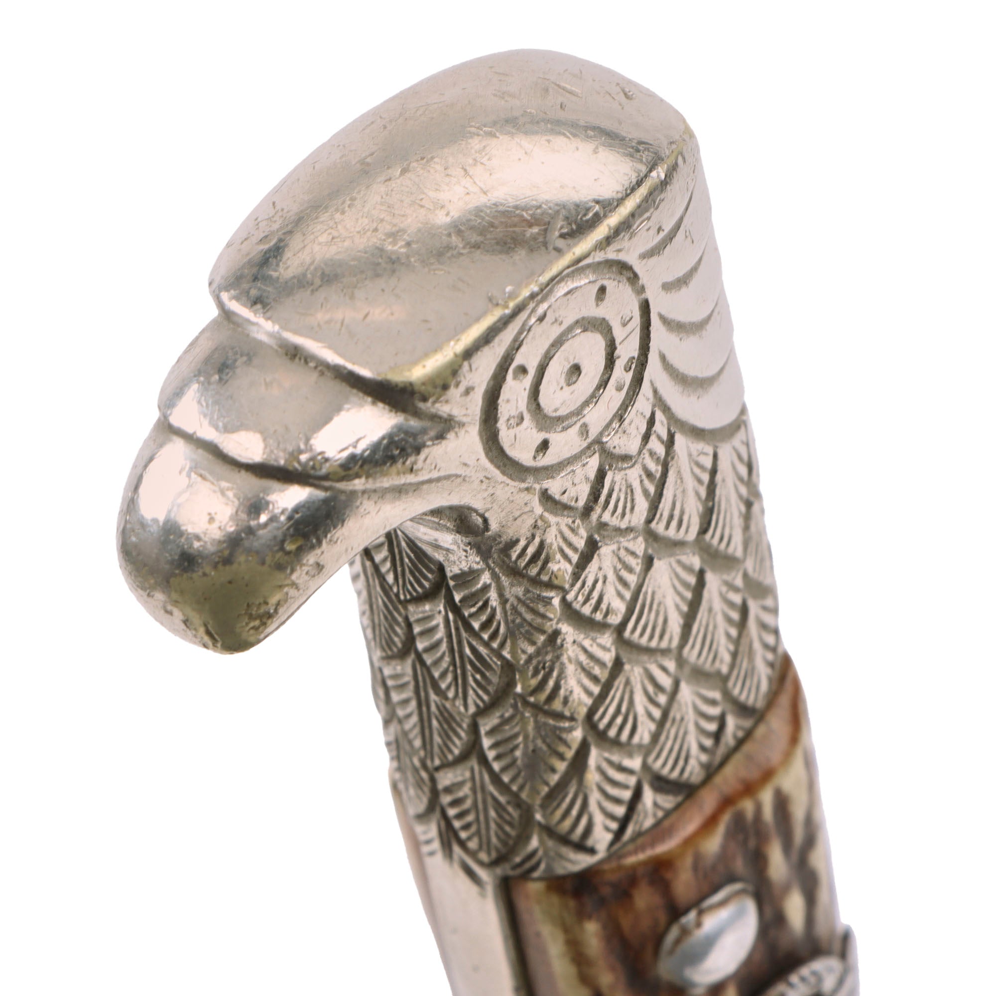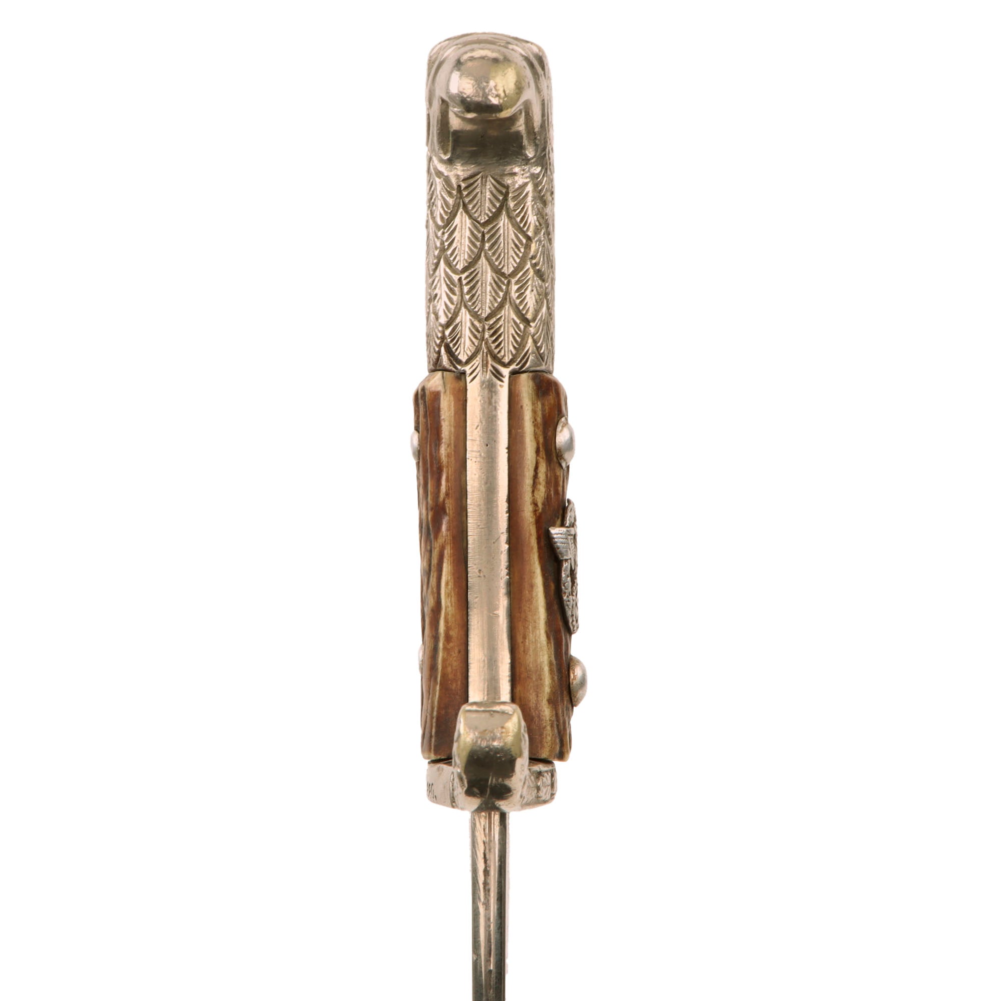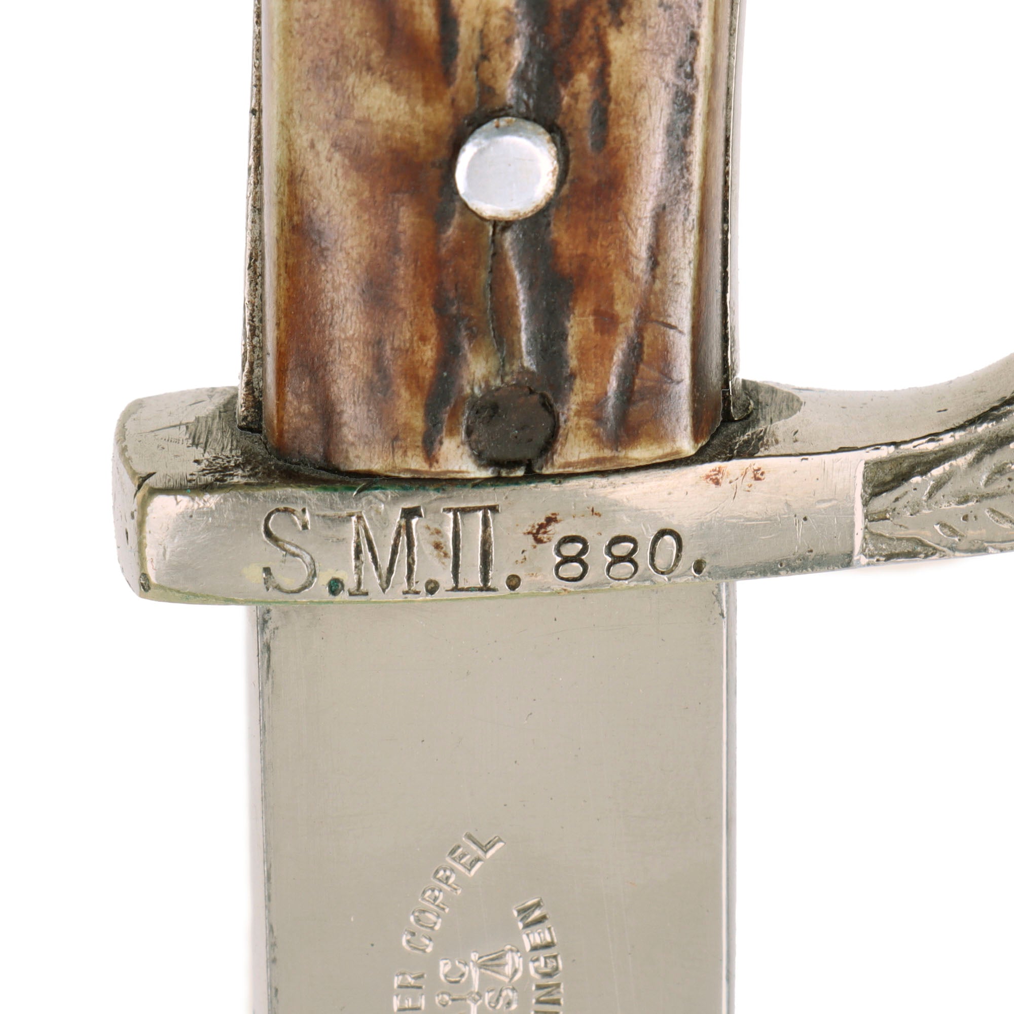 The handle of the bayonet is lovely nickel plated brass alloy, featuring a very nice decorated "Birds Head" pommel without a bayonet slot, and an upswept cross guard decorated with oak leaves. The grip scales are made of beautiful stag horn with an aluminum police insignia firmly attached on one side. These are held with solid aluminum rivets and show no wiggle at all. Both cross guard and eagle’s head are in very good condition, with most of the original nickel plating still intact, showing wear and light oxidation where the plating has worn away on the ends of the pommel and guard.