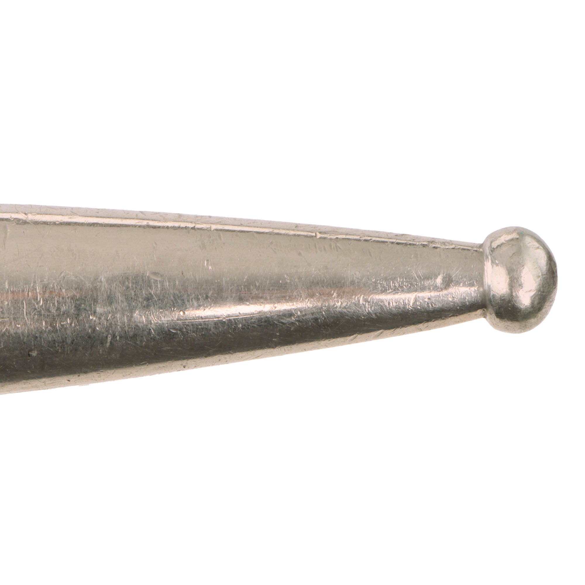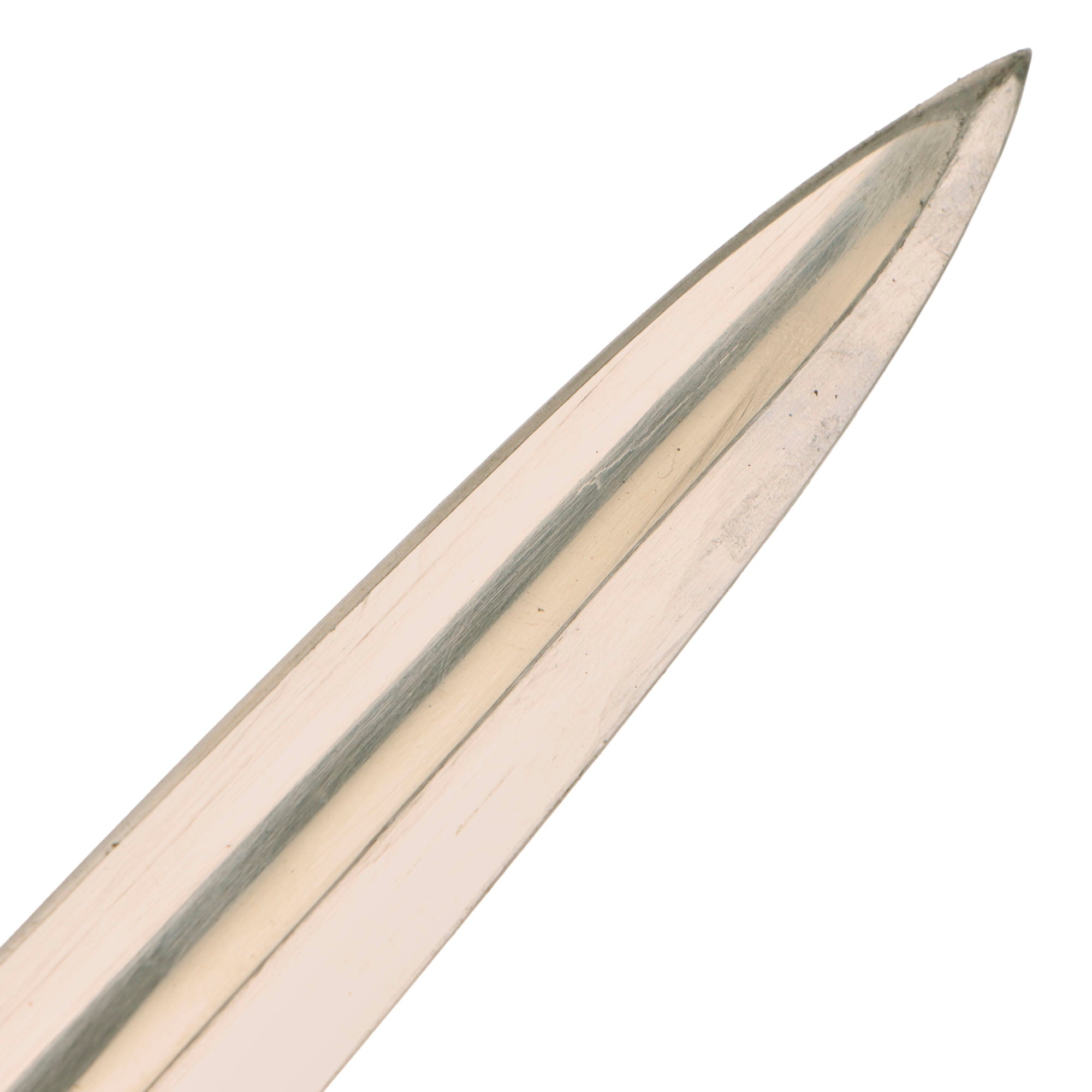 The bayonet has a lovely approximately 33 cm (13.125 inches) long nickel plated steel blade, which was forged "cut-down" style, with the fuller running to the tip. Blade is nice and bright, of excellent quality, and still has over 90% of the original nickel plating, with just a bit of wear through and oxidation speckling. There is definitely wear through from cleaning near the tip.