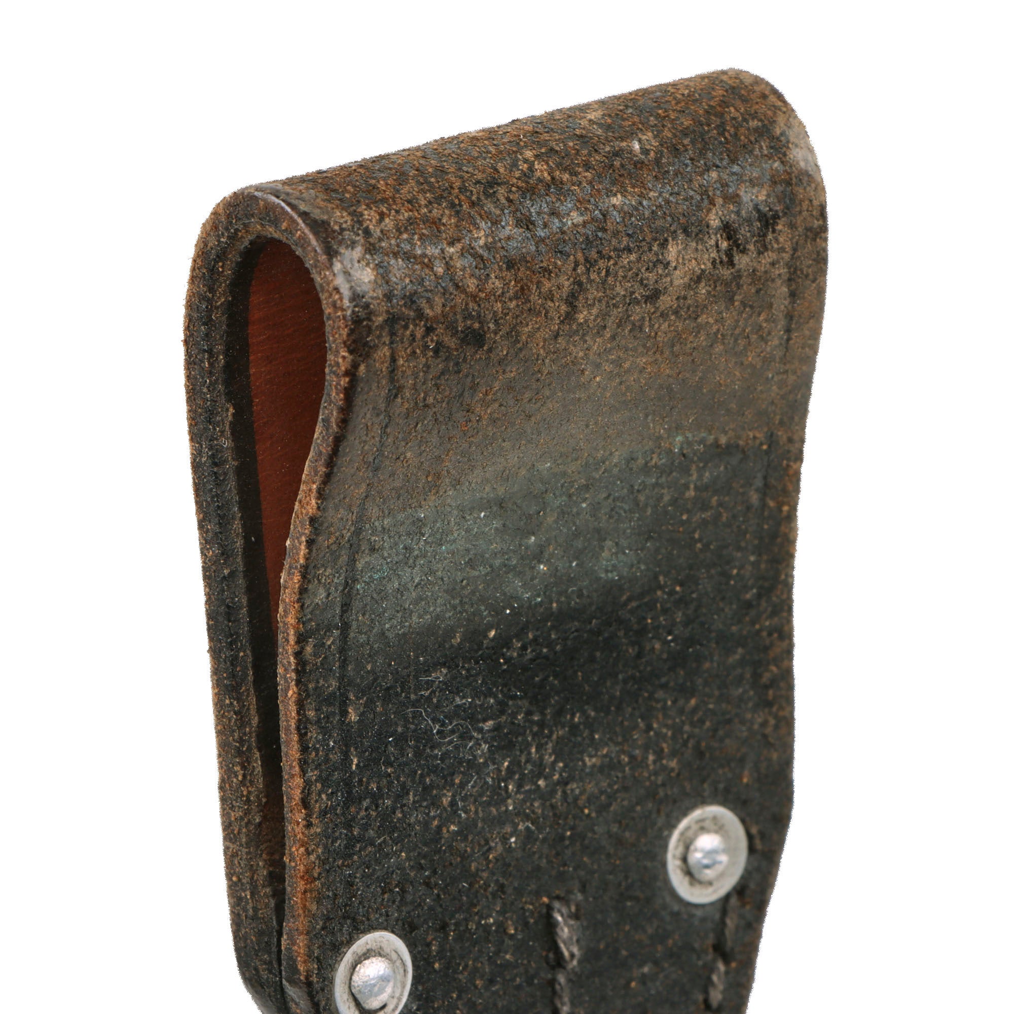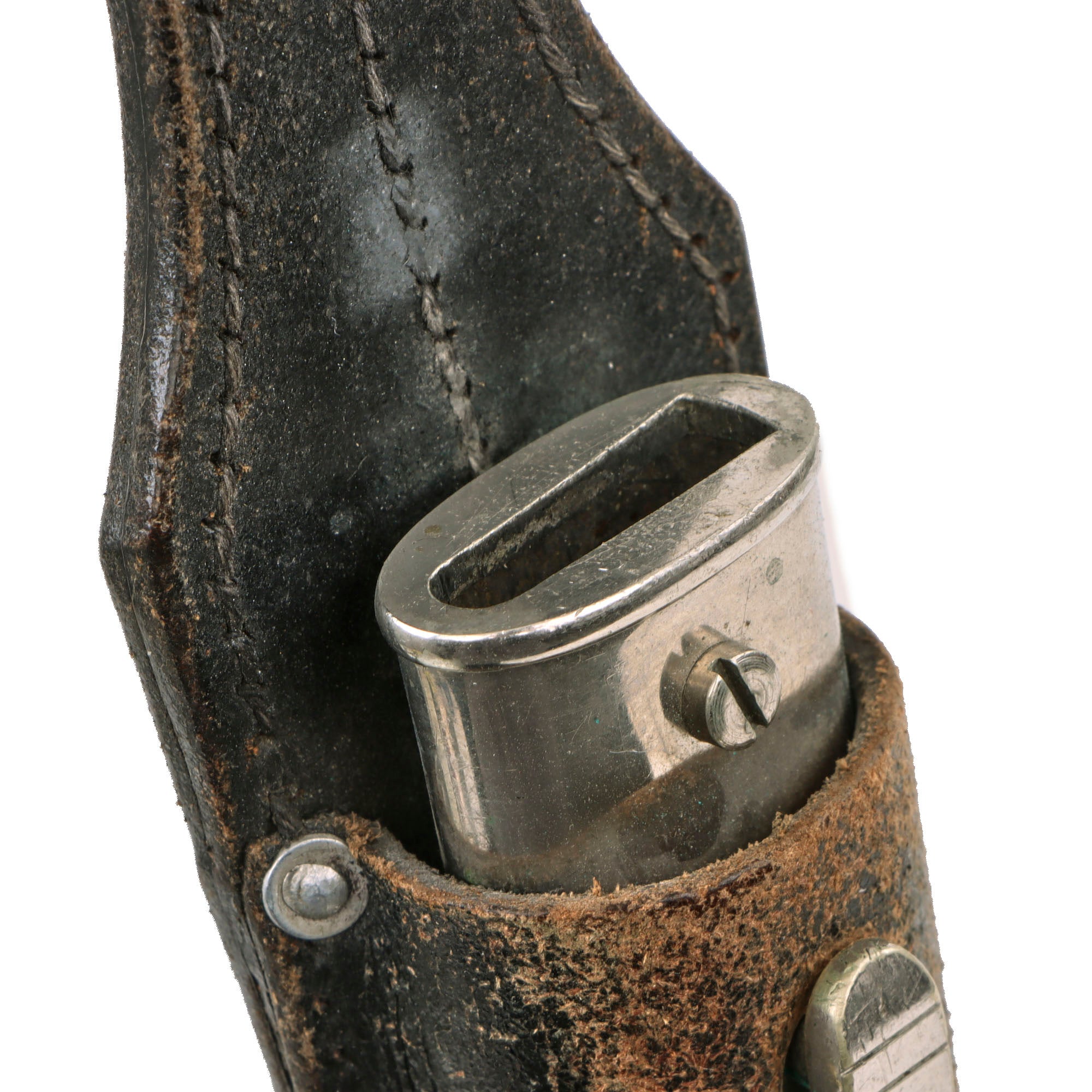 The scabbard is made of fine black leather, fitted with heavily nickel plated brass alloy, and is in very good service-used condition. The leather does show age and finish loss, and is now quite stiff. The fittings show some minor plating loss and wear, but still present very nicely. The black patent leather frog is a solid field type, with good reinforcement rivets. The stitching looks to be all intact, however there is some degradation to the leather, with heavy wearing away of the finish on the front.