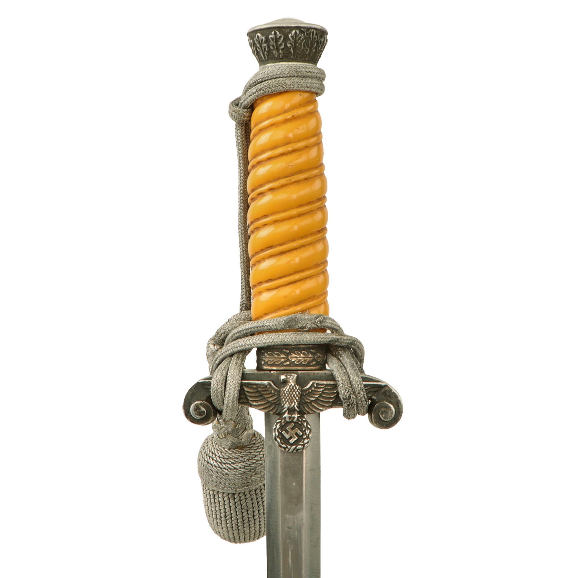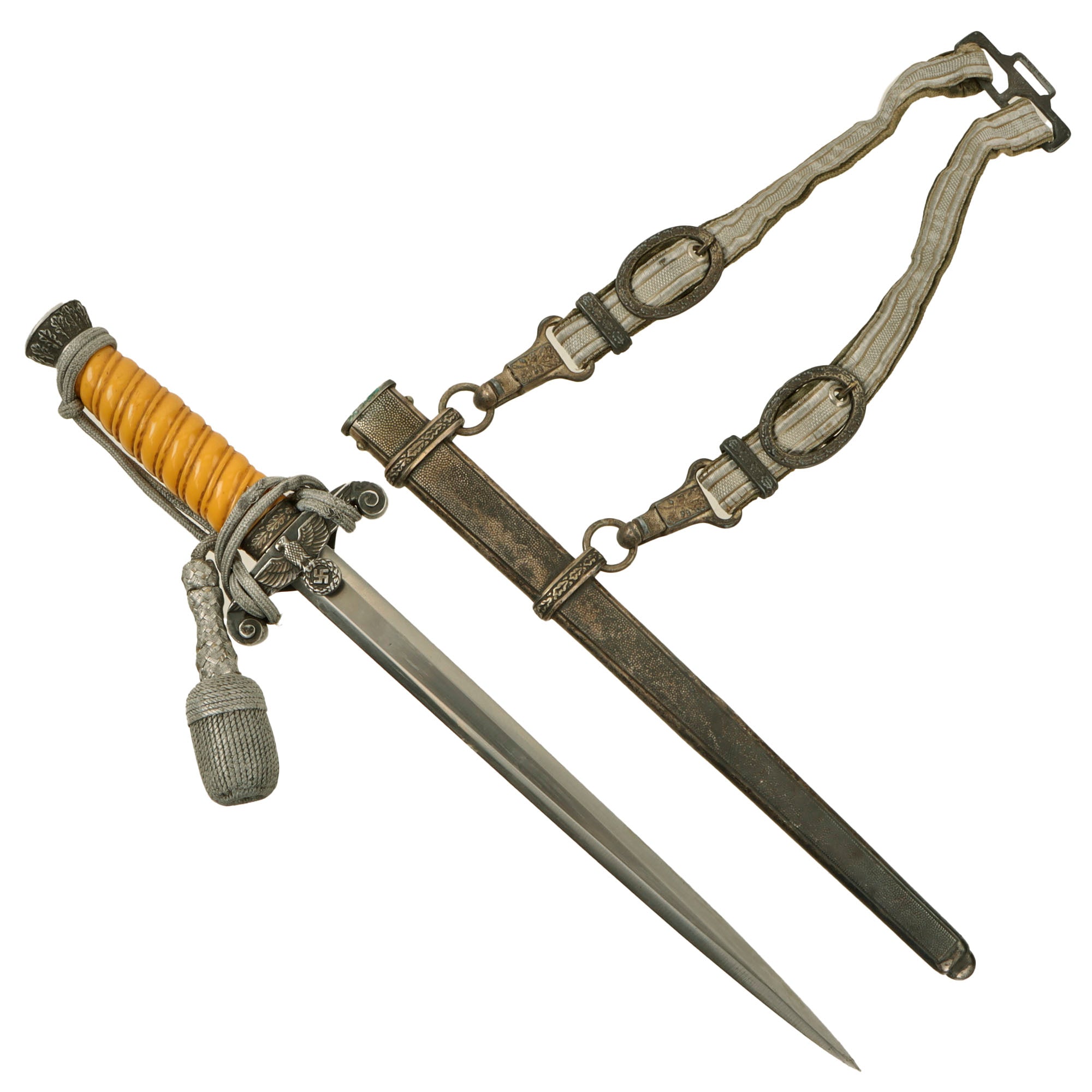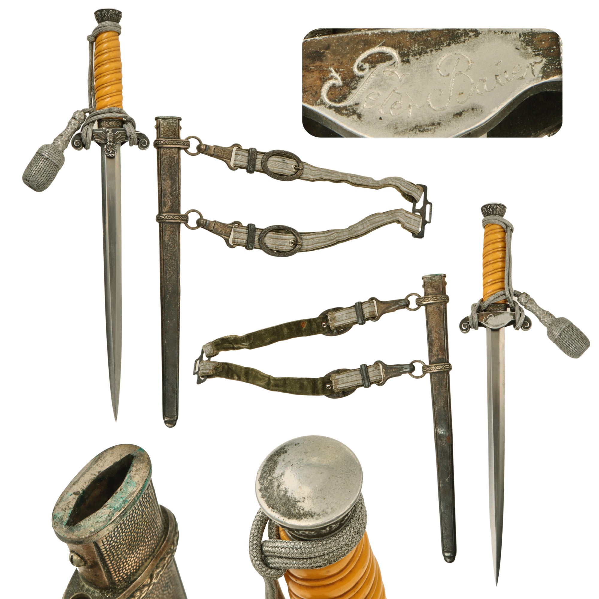 The pommel depicted oak leafing around the outer circumference. The scabbard had panels of pebble designs. Later produced examples were plated with nickel, and late war-made pieces were unplated, finished in a gray color metal. These daggers are often encountered with an aluminum portepee.