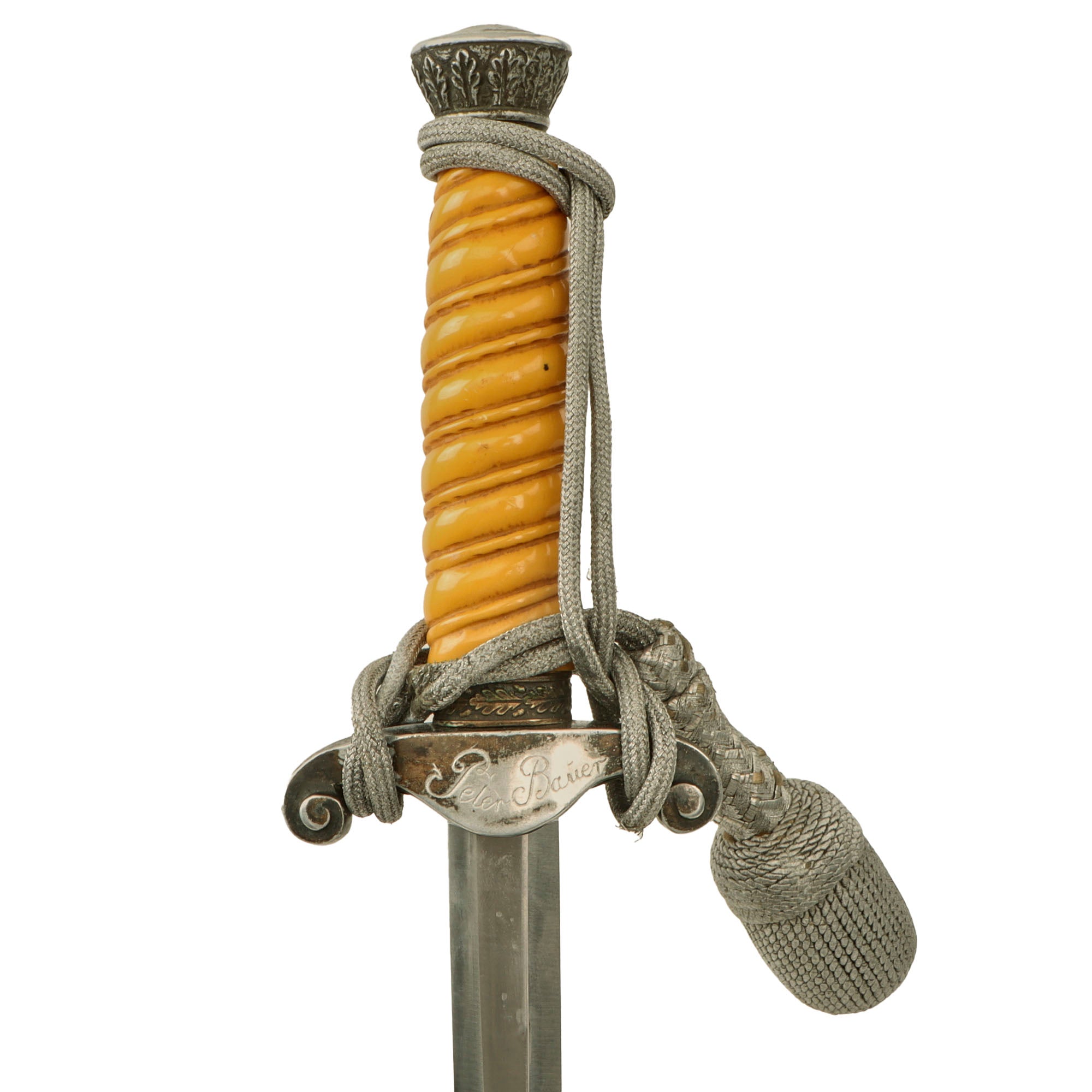 Original Item: Only One Available. This is an lovely condition named Army Officer's Dagger, complete with the original scabbard, belt hanger, and portepee knot, which are all the usual accessories it would come with. The rear of the cross guard is engraved with the name Peter Bauer, most likely executed at some time during the war. It shows a very high level of artistry, so we assume it was done by the maker or at a field workshop.