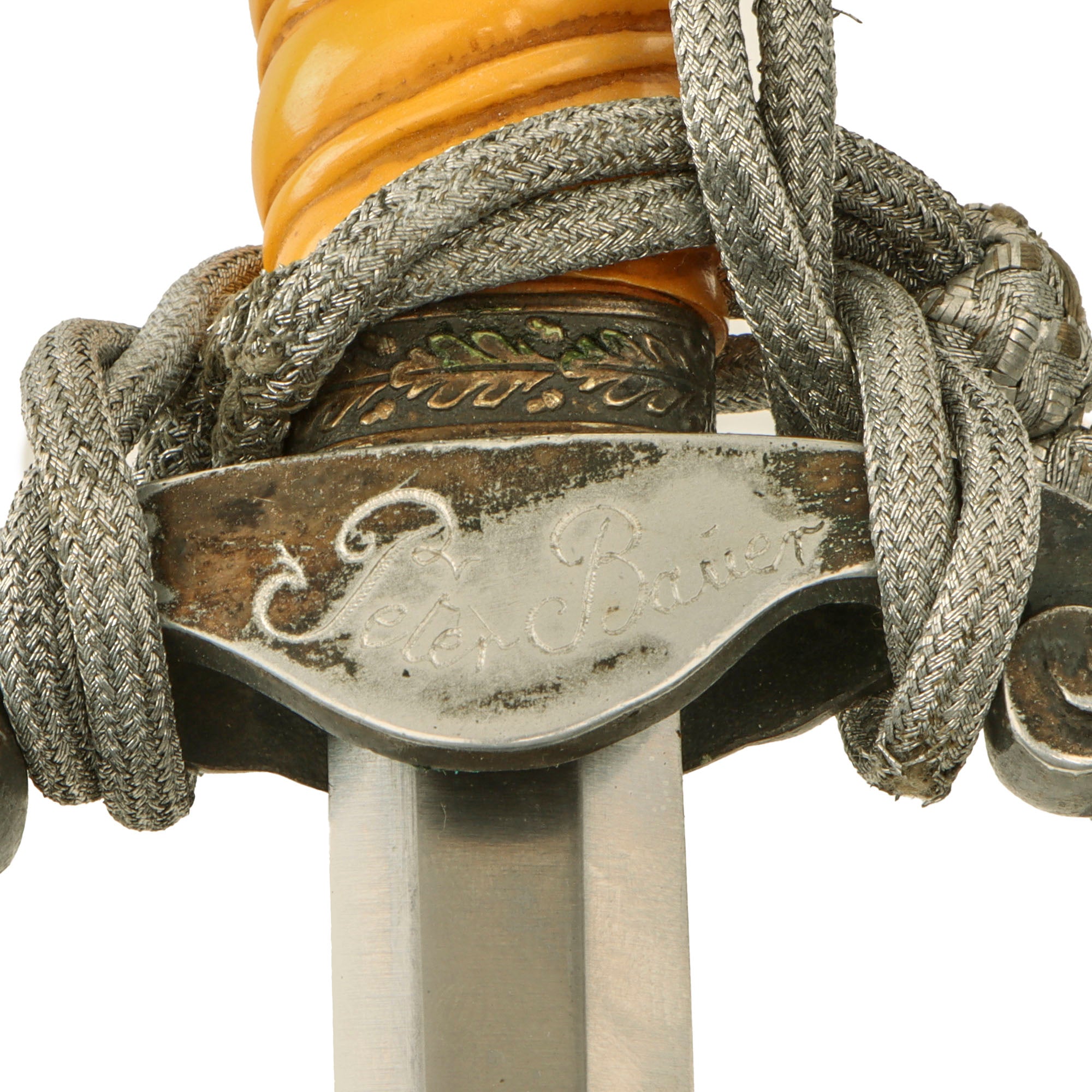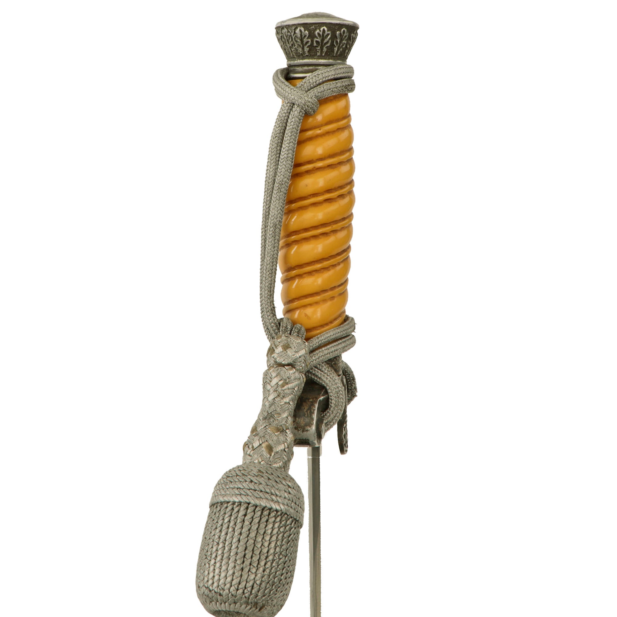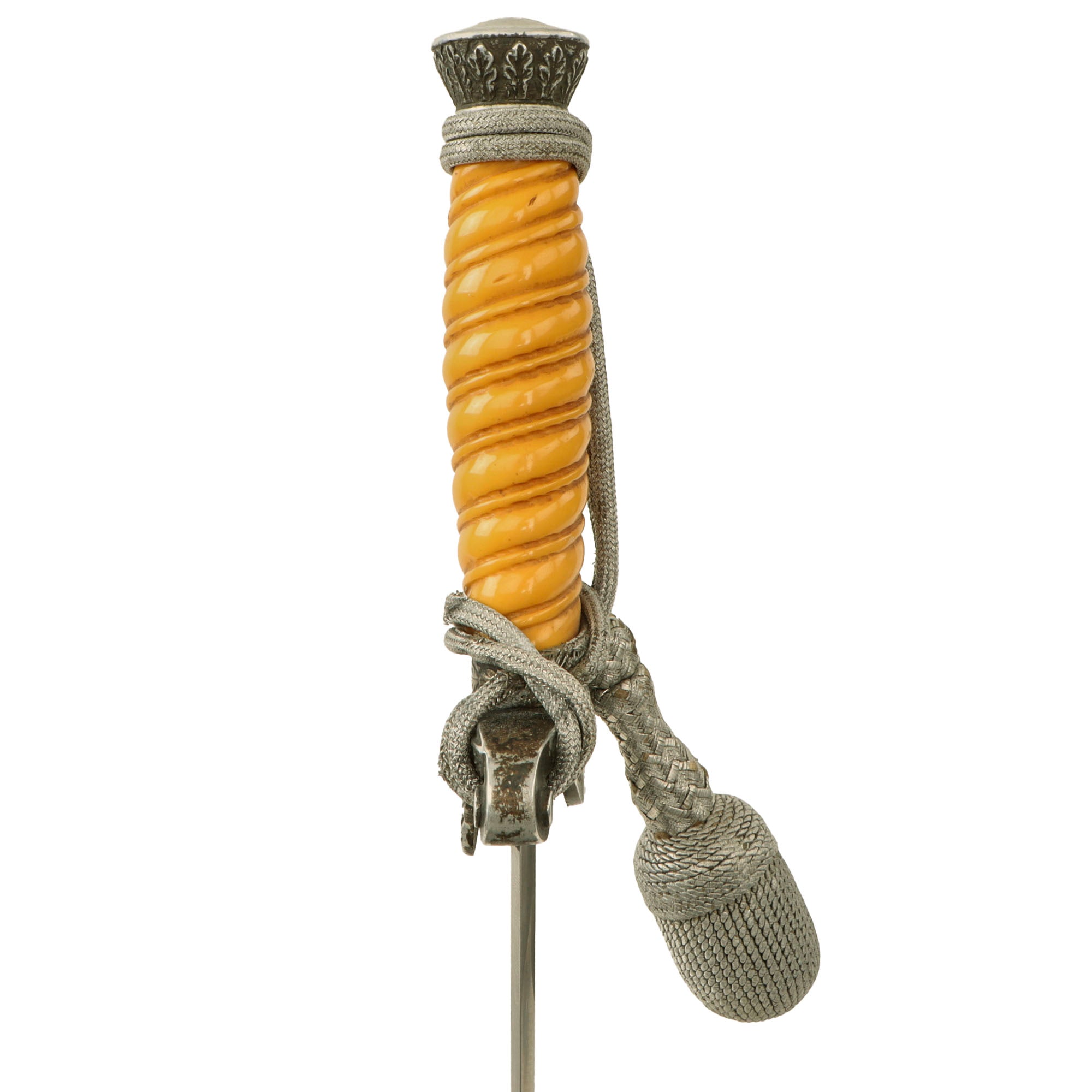 Wrapped around the grip and cross guard is an original aluminum bullion thread portepee (sword knot), tied in the Heer fashion. It is in very good condition, looking to have been fitted to the dagger for quite some time. There is some fraying in areas, but no major loss of bullion or exposure of the underlying cords.