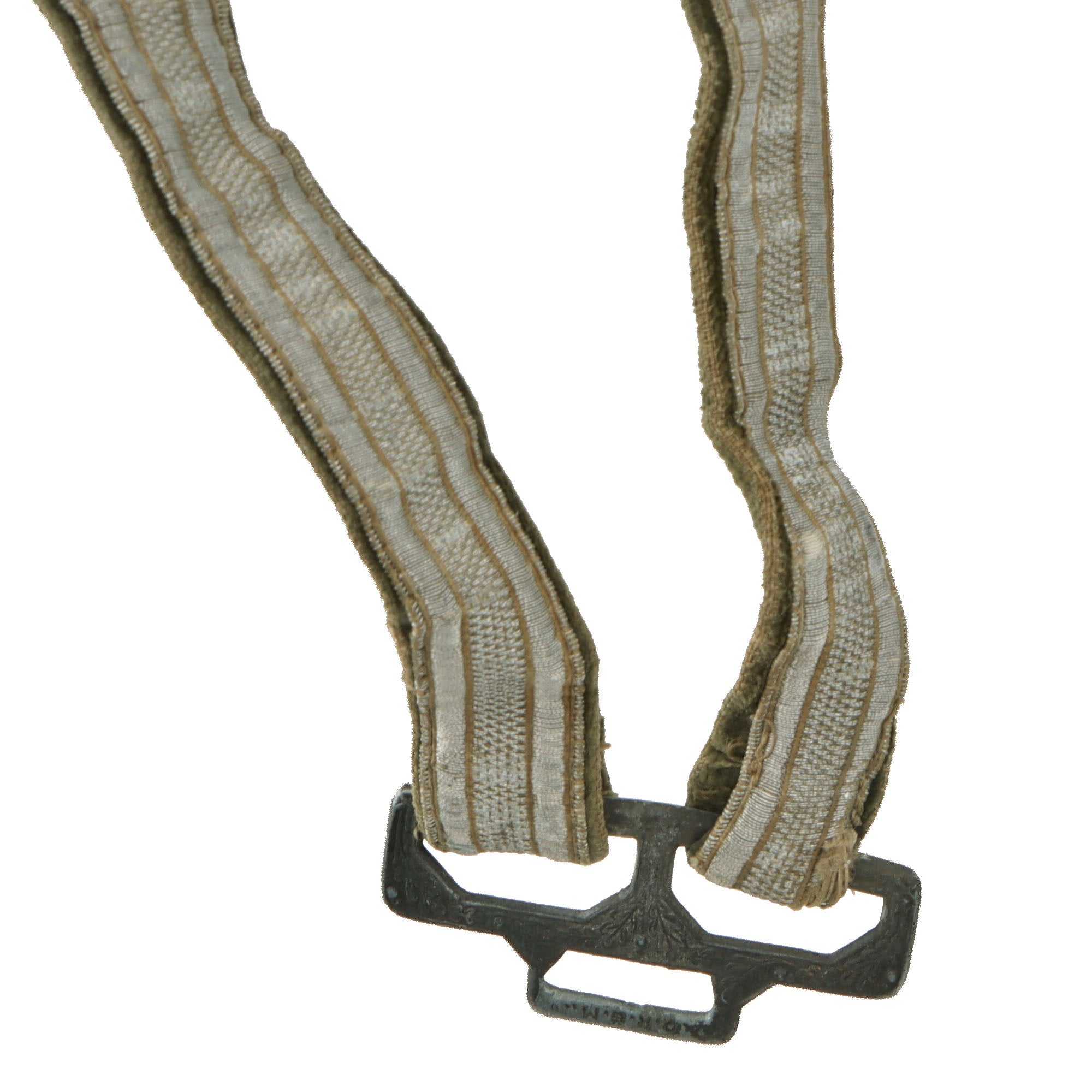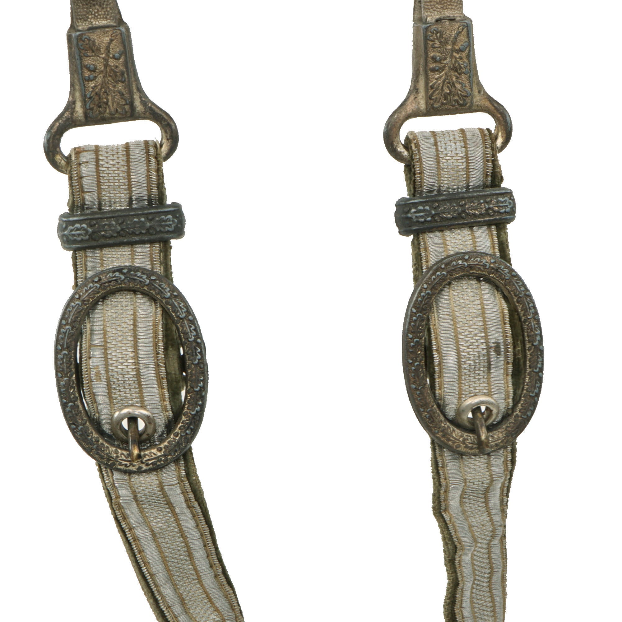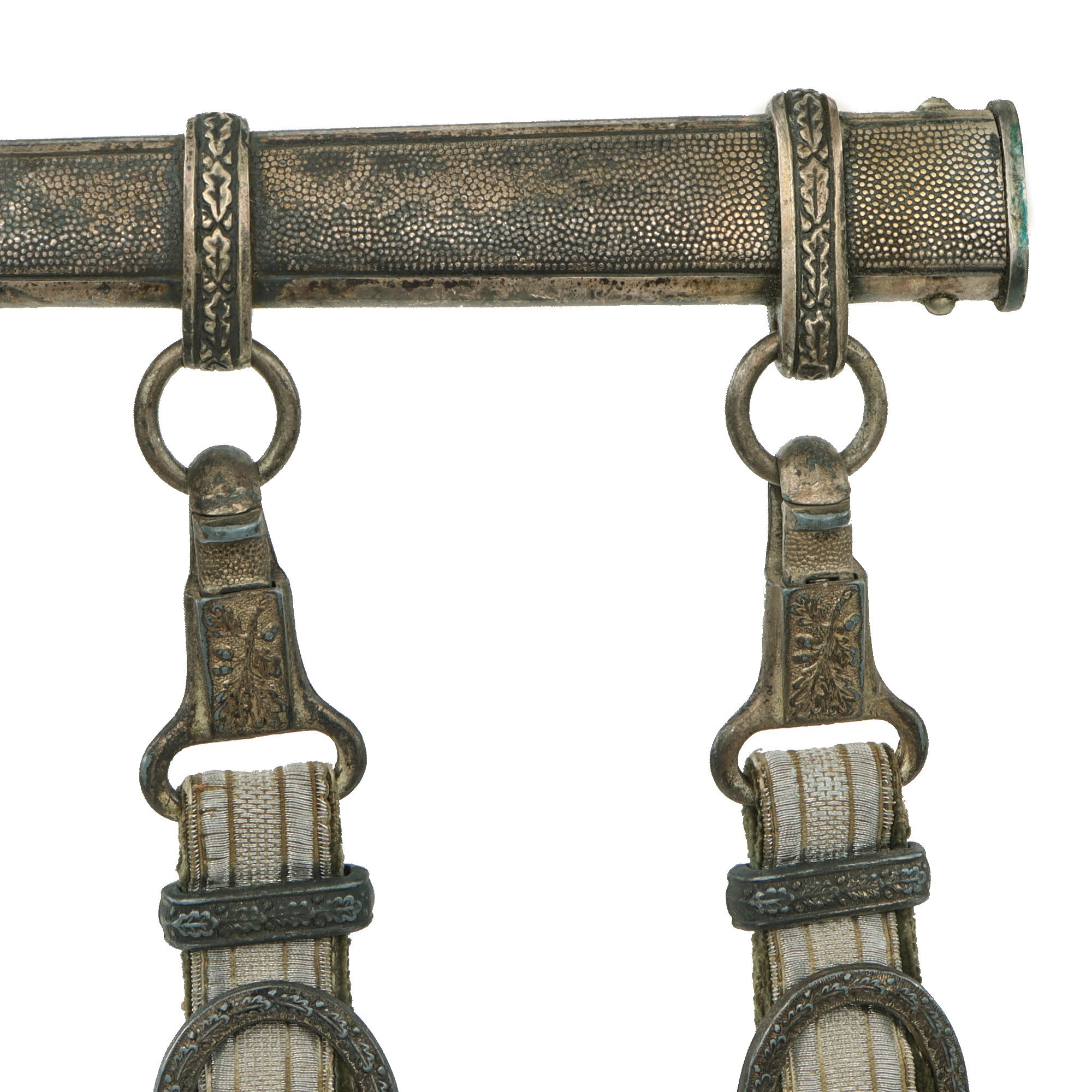 Attached to the scabbard is a very good condition belt hanger, with functional pebbled spring clips with a great patina. The buckles and keepers are engraved with the same oak and acorn motif seen throughout the dagger. The clips are the more desirable "sliding" type, both marked D.R.G.M. on the back, indicating it is a trademarked design. The original plating on the zinc alloy fittings is still mostly retained, with some remaining bright, while other areas have tarnished. The straps are in very good condition, showing the bullion on the front well, and the velvet plush material on the reverse is well retained, showing light wear. There is some age to wear and fraying to the edges of the straps near the box style end buckle.
