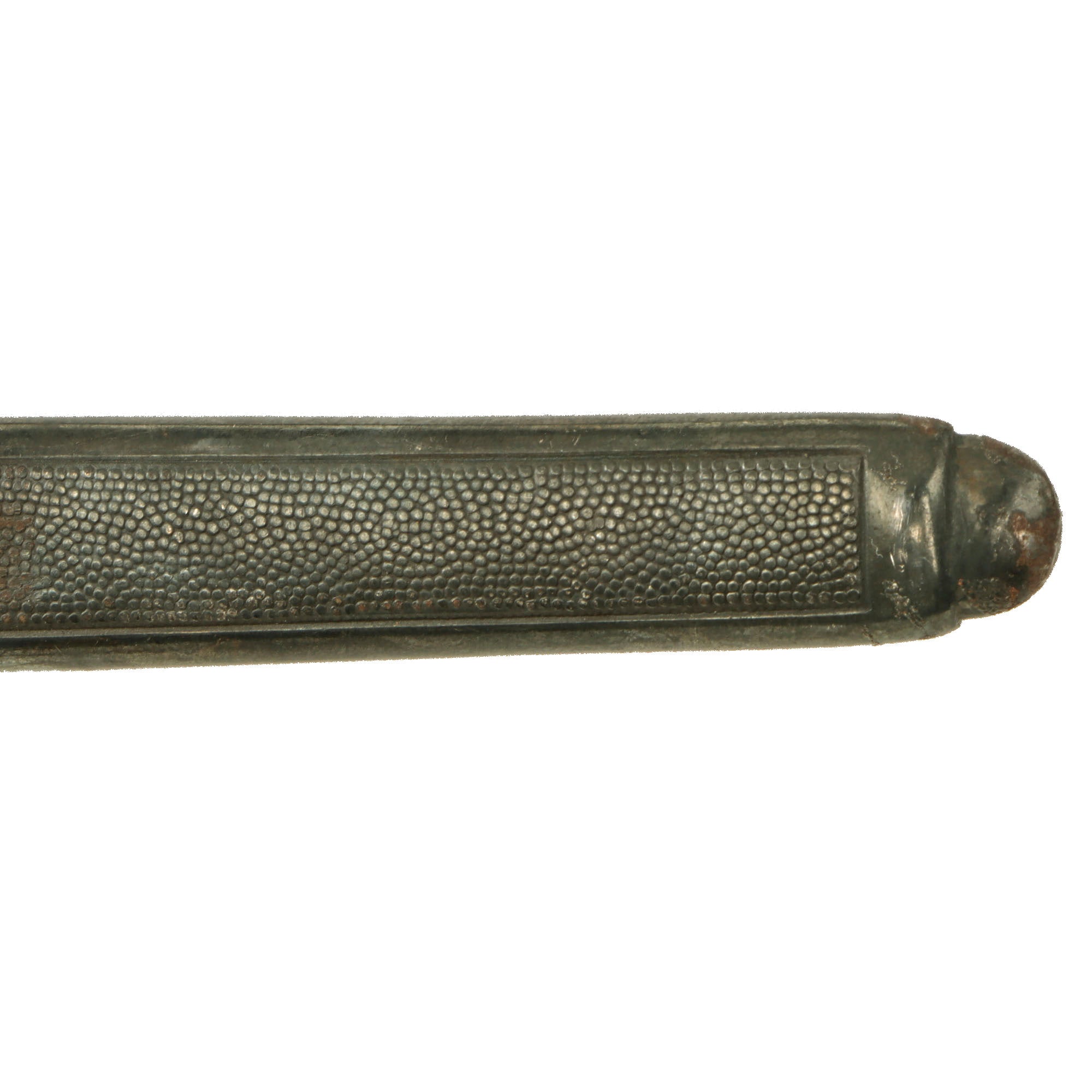 The scabbard is a fine steel example with what looks to be silver plating, which is still partly retained, but tarnished. The scabbard body does have a sizable dent and a bend about 2.5 inches below the lower carrying band, which does seem to make the blade a bit more difficult than usual to sheathe. It still retains its very crisp, finely grained pebbled panel but we can see some wear and oxidation from use and cleaning. The alloy carrying bands have an excellent pattern of overlapping oak leaves and acorns, which are nicely enhanced, but also show some wear and oxidation. The throat is the thinner style, and is retained with "dome-head" screws on the narrow sides.