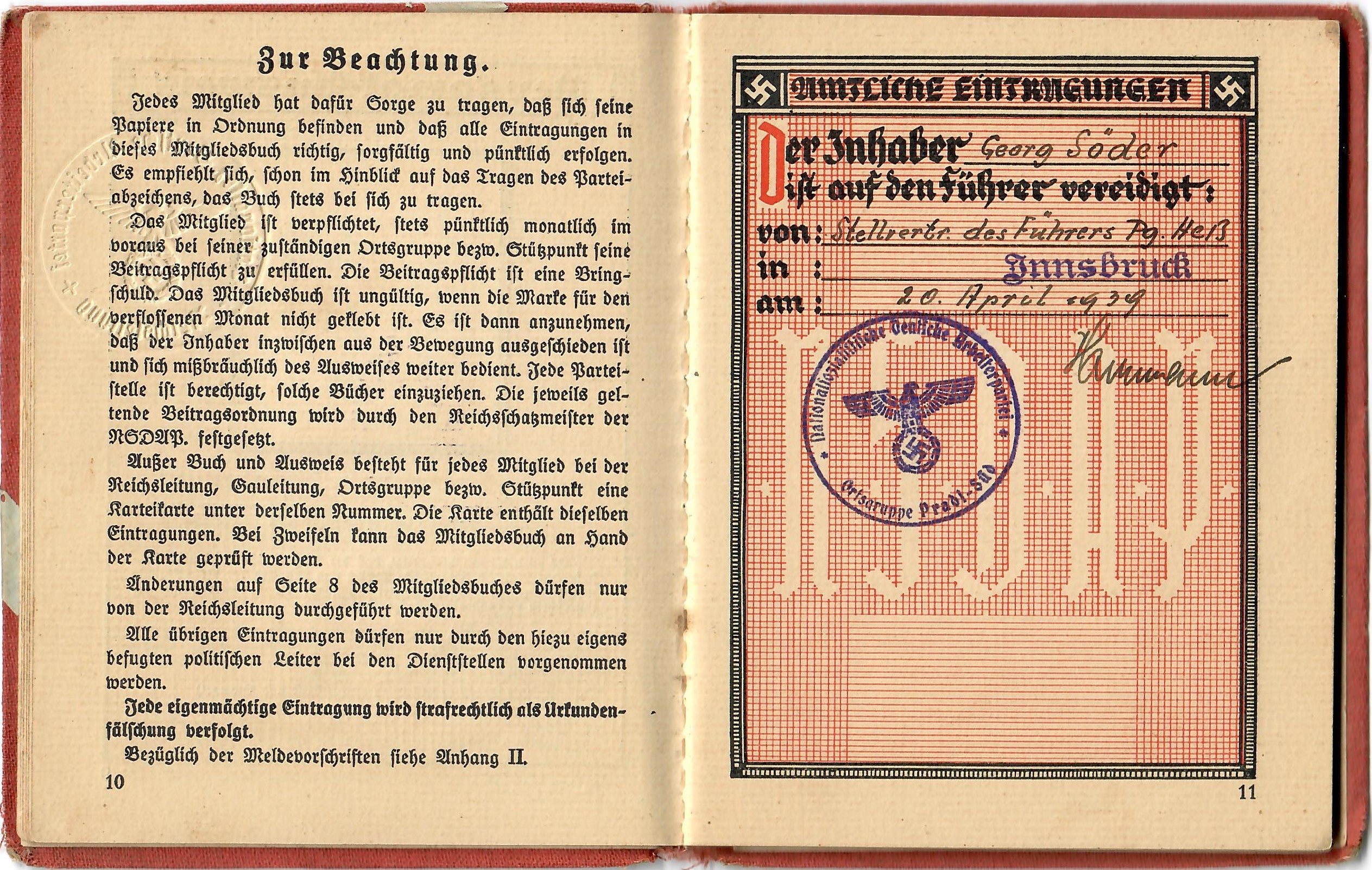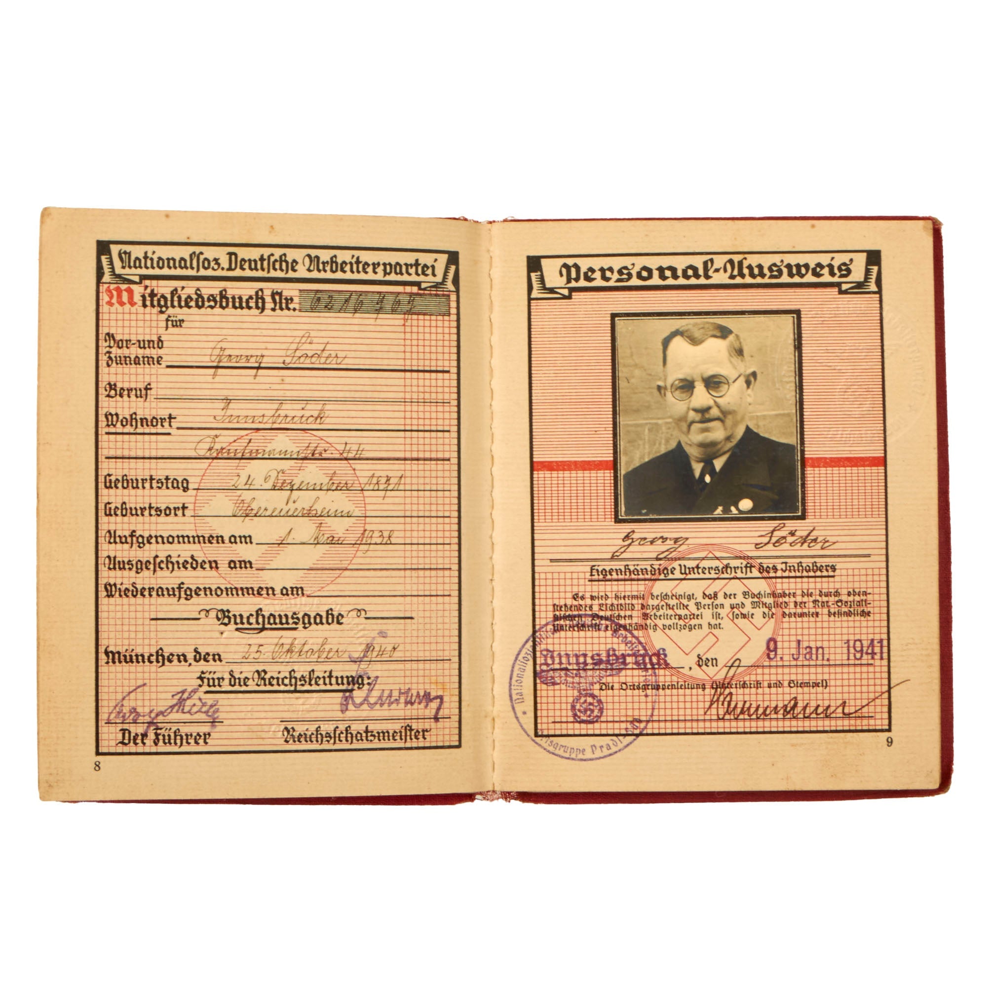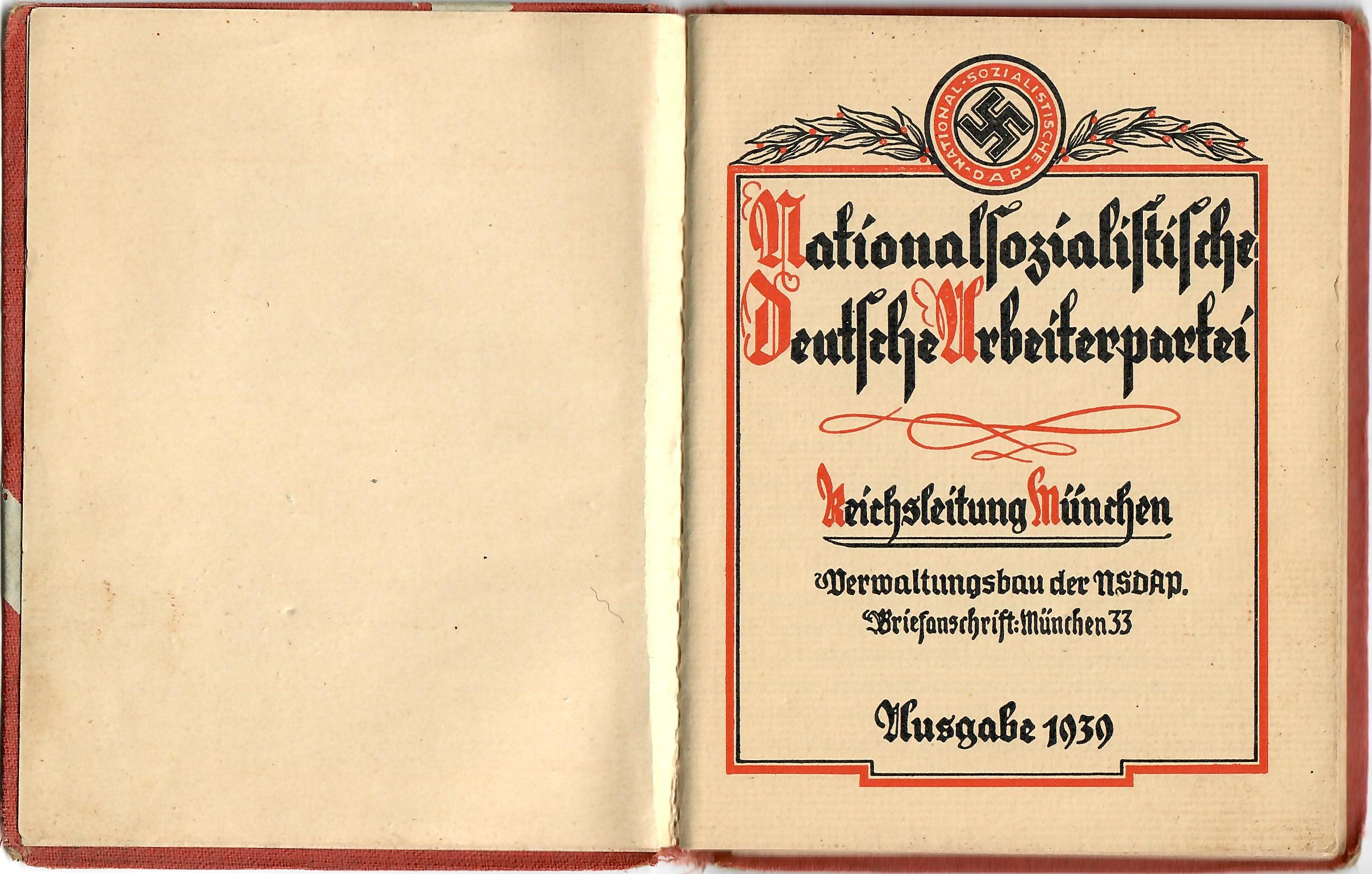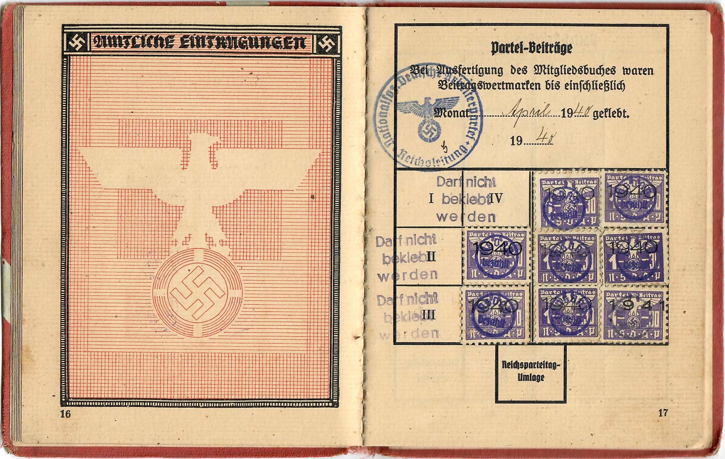 All members who joined the NSDAP "party" were given Membership books, which would contain their picture, personal information, and basic information about they party. It also contains pages listing when they paid their Partei-Beiträge (party dues), indicated by stamps, as well as further contributions to the party. It also would contain information regarding any changes in their residential location, as they were required to notify the Ortsgruppe (local group) when this occurred. This tracks the various locations the other was stationed during the NSDAP period.