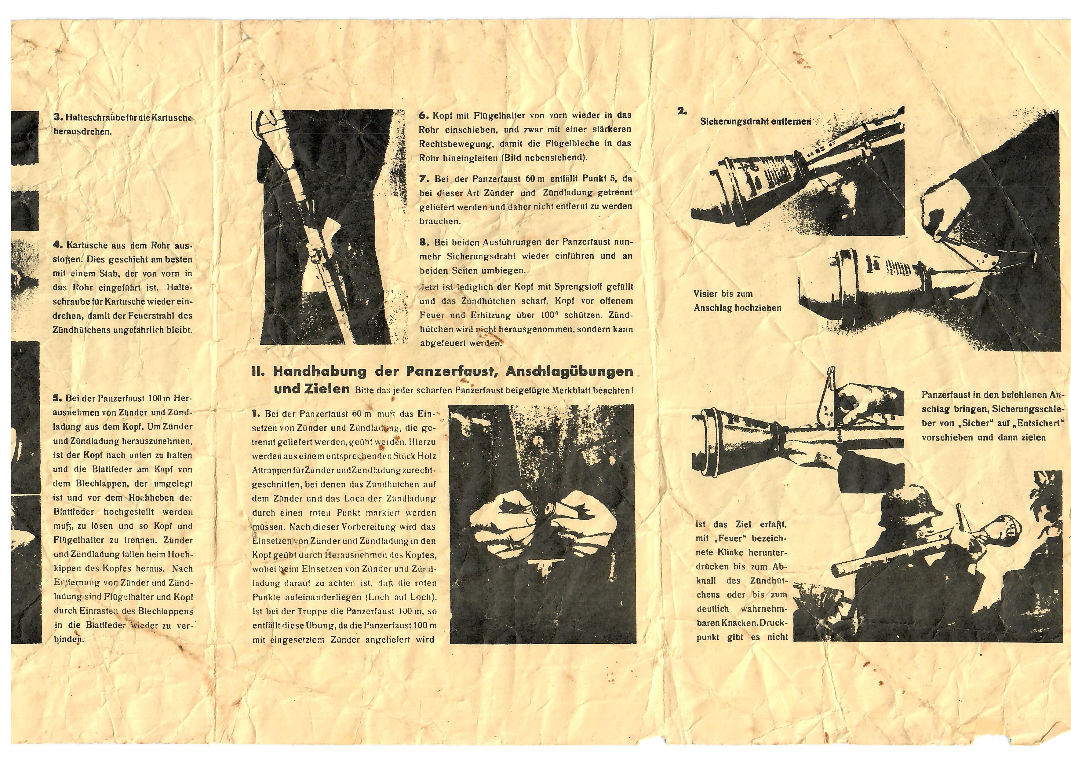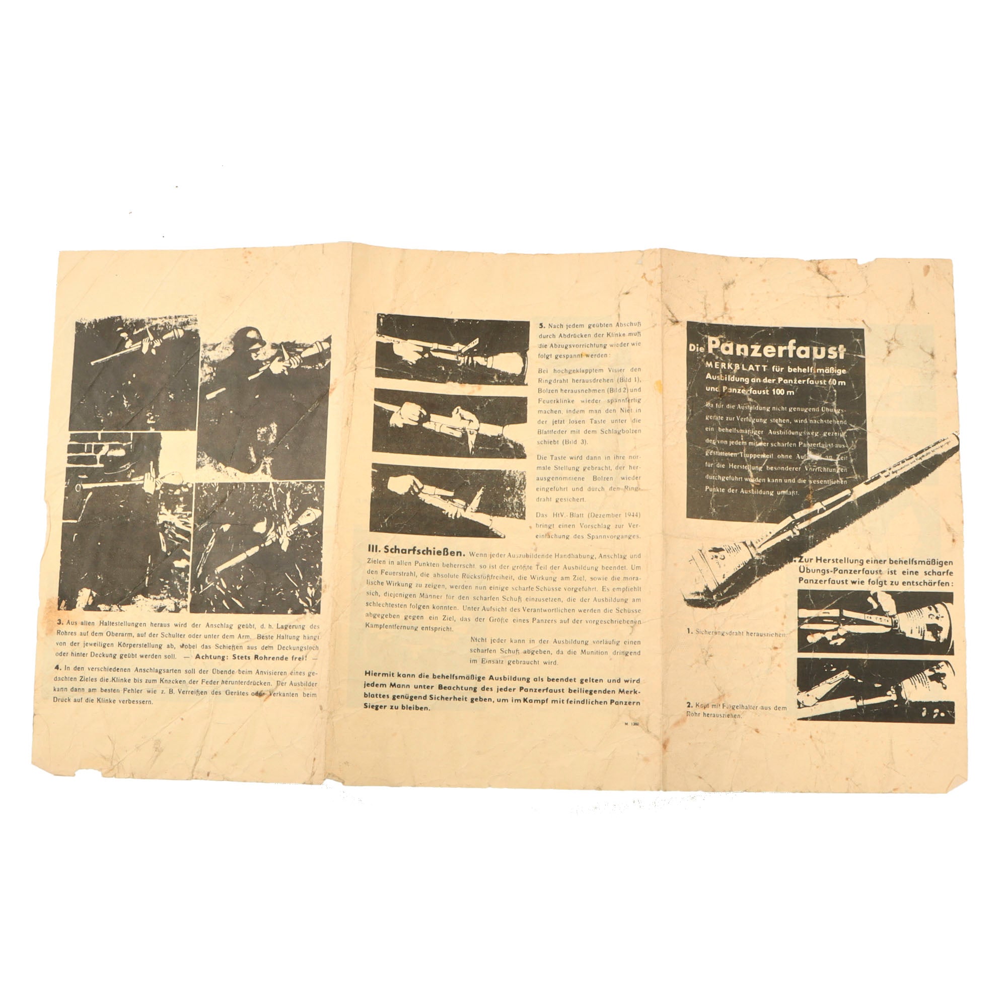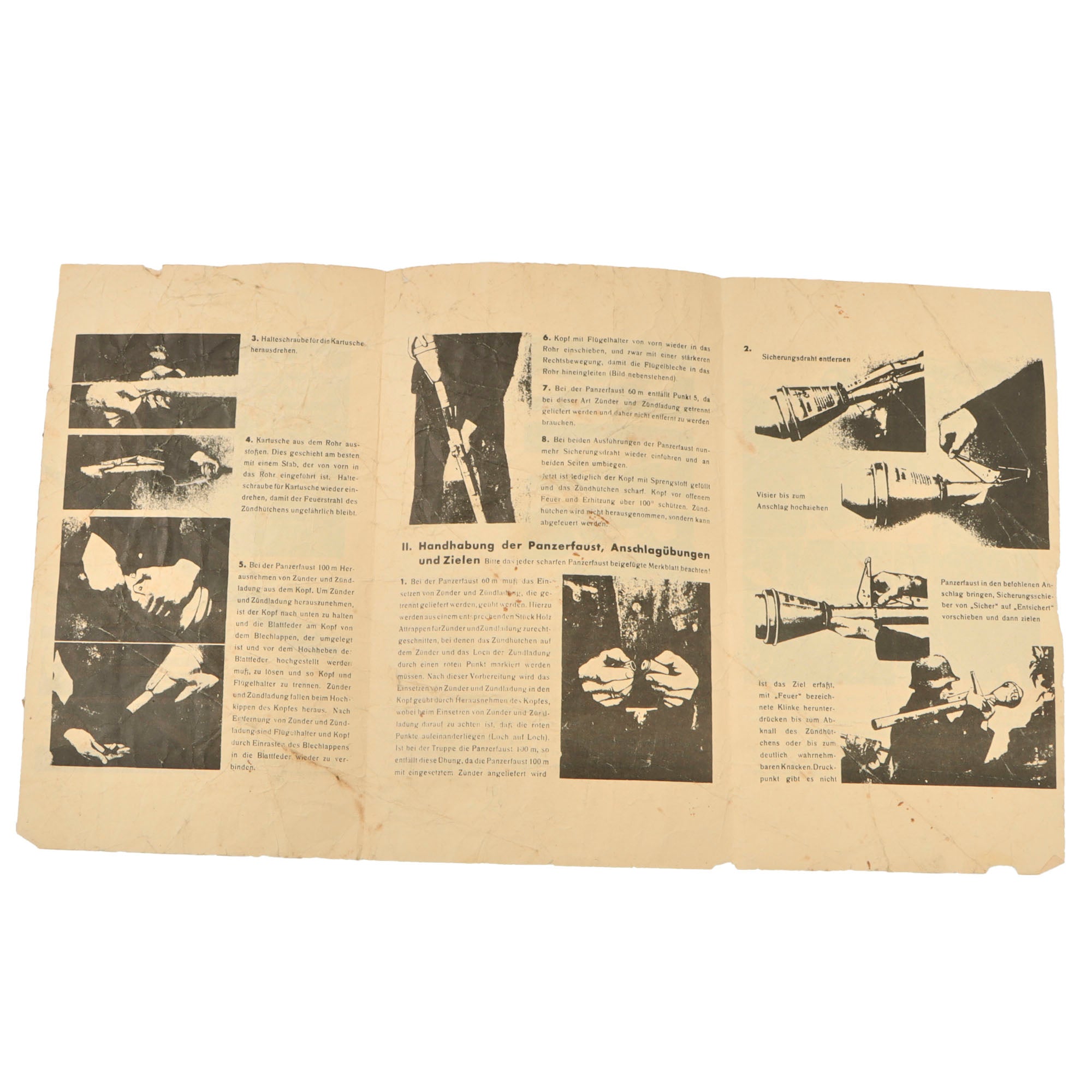 This is a very scarce instructional pamphlet issued with the Panzerfaust. When unfolded it measures 13 ¾ x 7 ⅞”, and when folded it measures 4 ¾ x 7 ⅞”. It has three double sided pages so six pages total with very good illustrations on the preparation and use of the Panzerfaust. The last bit of text on the bottom of the back of the pamphlet translates to: