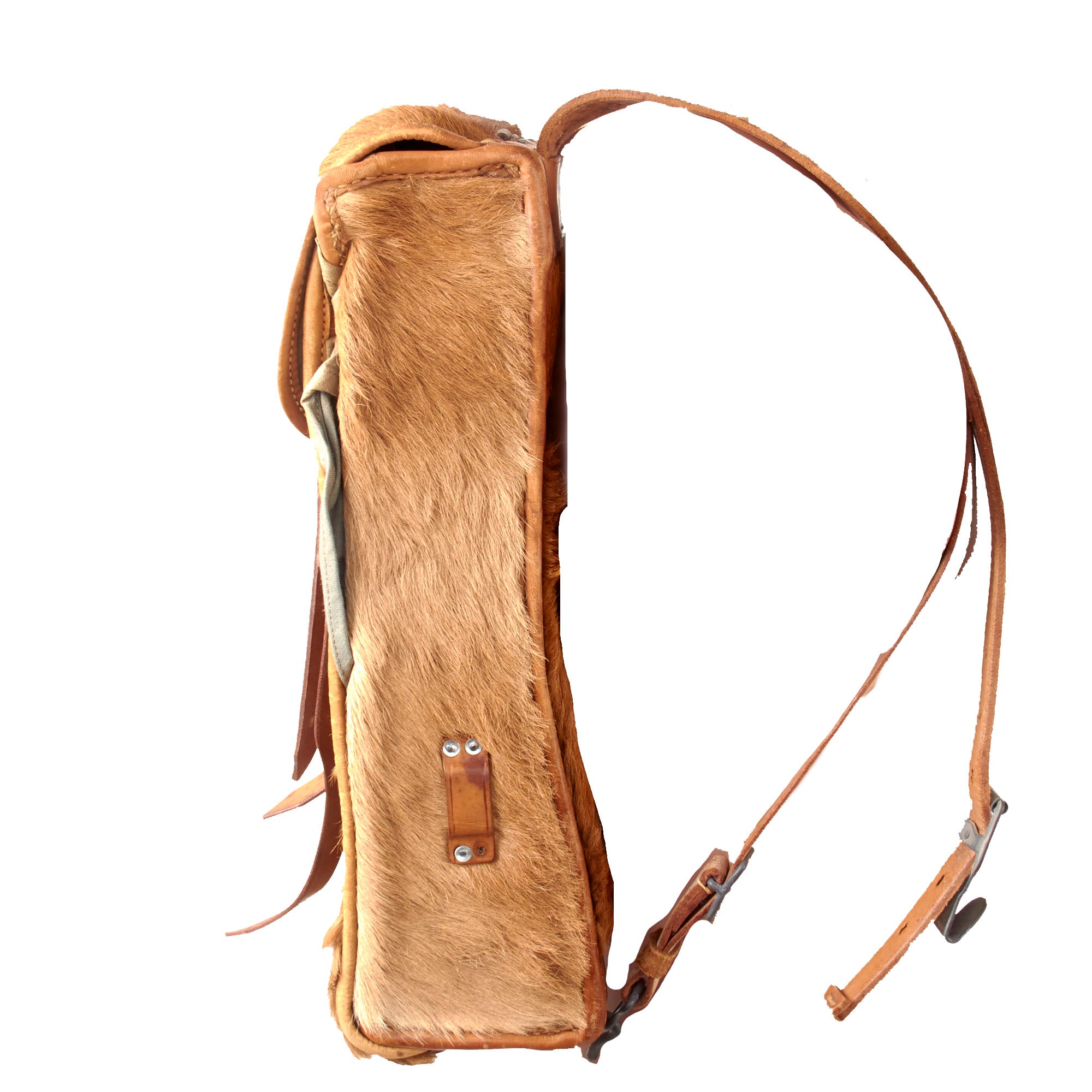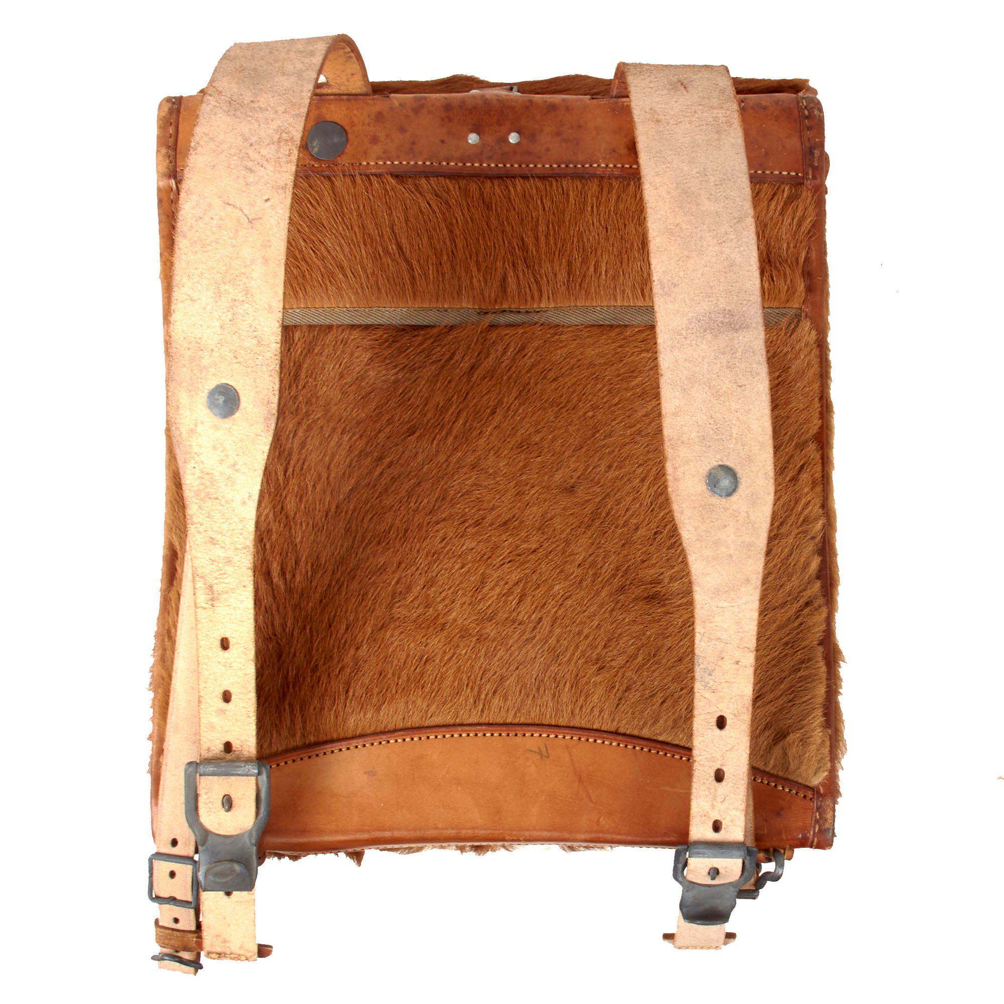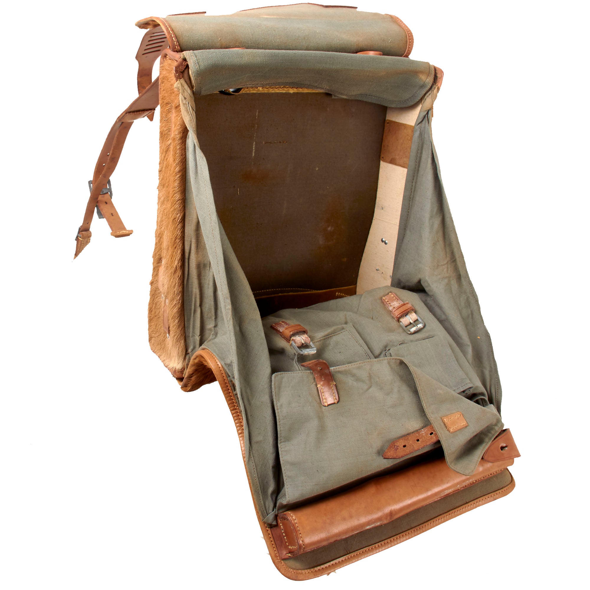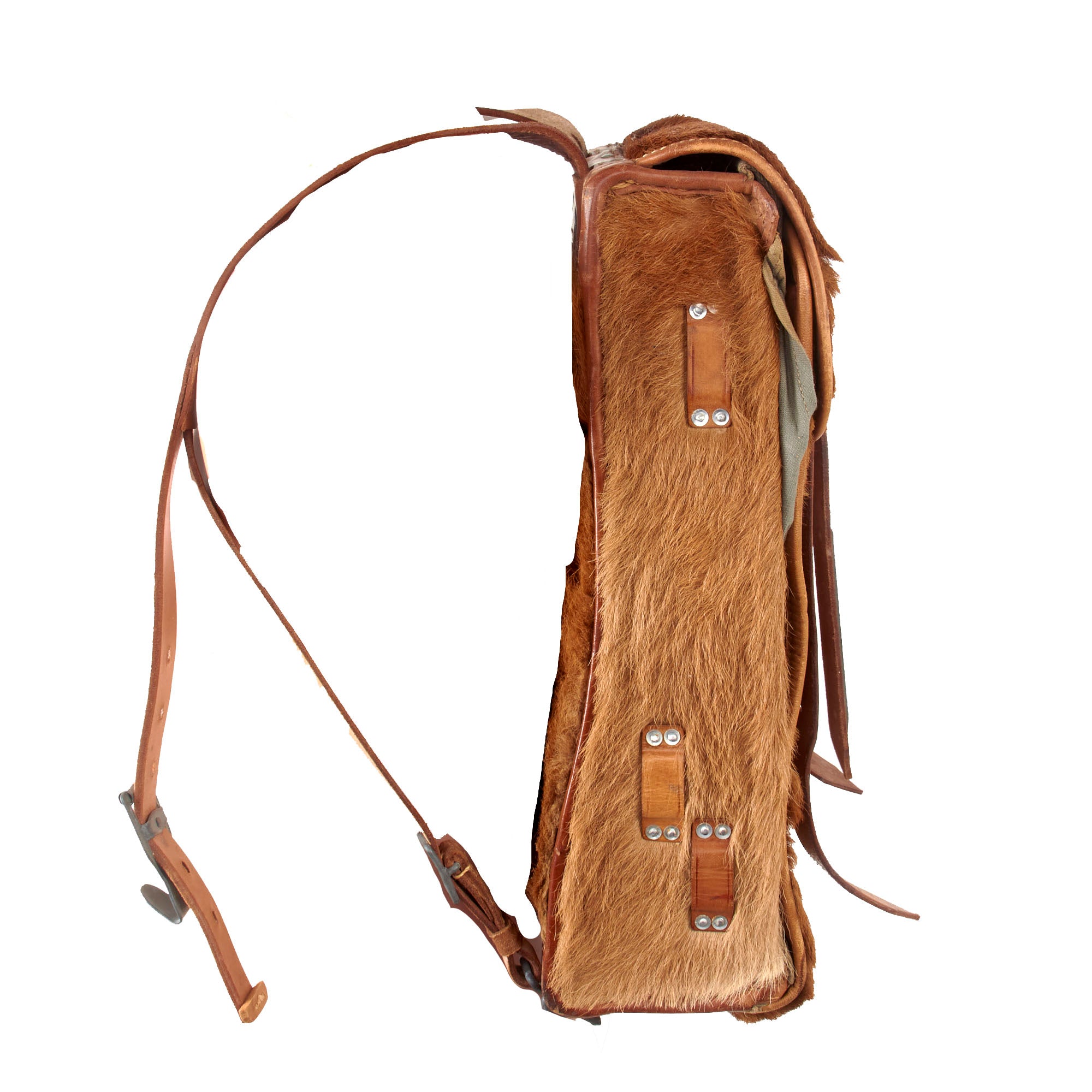 Condition is very good, especially considering the age. The fur on the cowhide is still mostly intact, though the leather has been worn at at the edges, with small areas of fur loss. The shoulder straps are complete and intact, with the leathers still supple with a nice color. The side straps that connect to the bottom of the pack are also still present, with no issues. The various buckles and straps all look to be present.