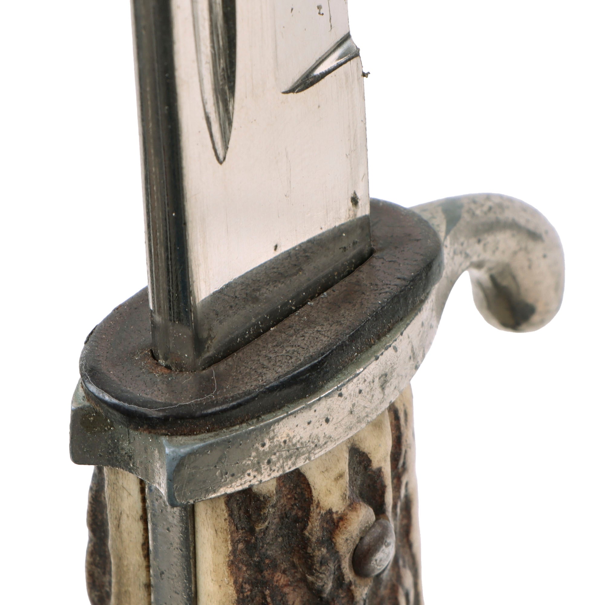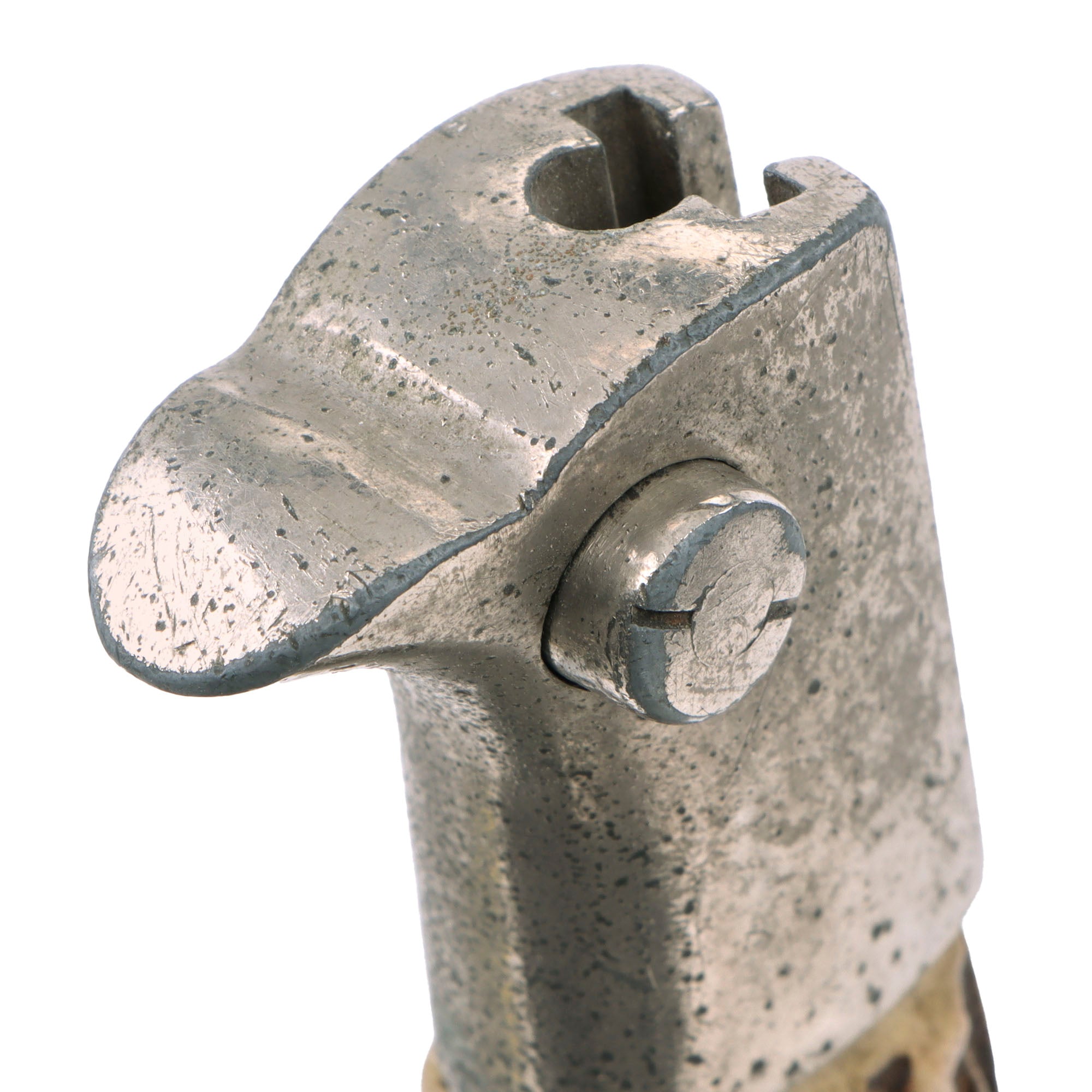 The bayonet has a nice zinc alloy hilt, which still retains the plating at about 75%, showing some wear and denting, as well as overall oxidation and pin prick flakes. The pommel does has a fully functional locking stud and mortise slot, though the felt insert is missing. The hilt also does not have the usual embossed "birds head" decorations on the pommel, nor any on the cross guard. The grip scales are made of beautiful stag horn with an aluminum alloy police insignia firmly attached on one side. These are held with plated steel rivets, which show light oxidation but no wiggle. It is marked with unit number 116 on the cross guard, but we did not see any numbers on the scabbard.