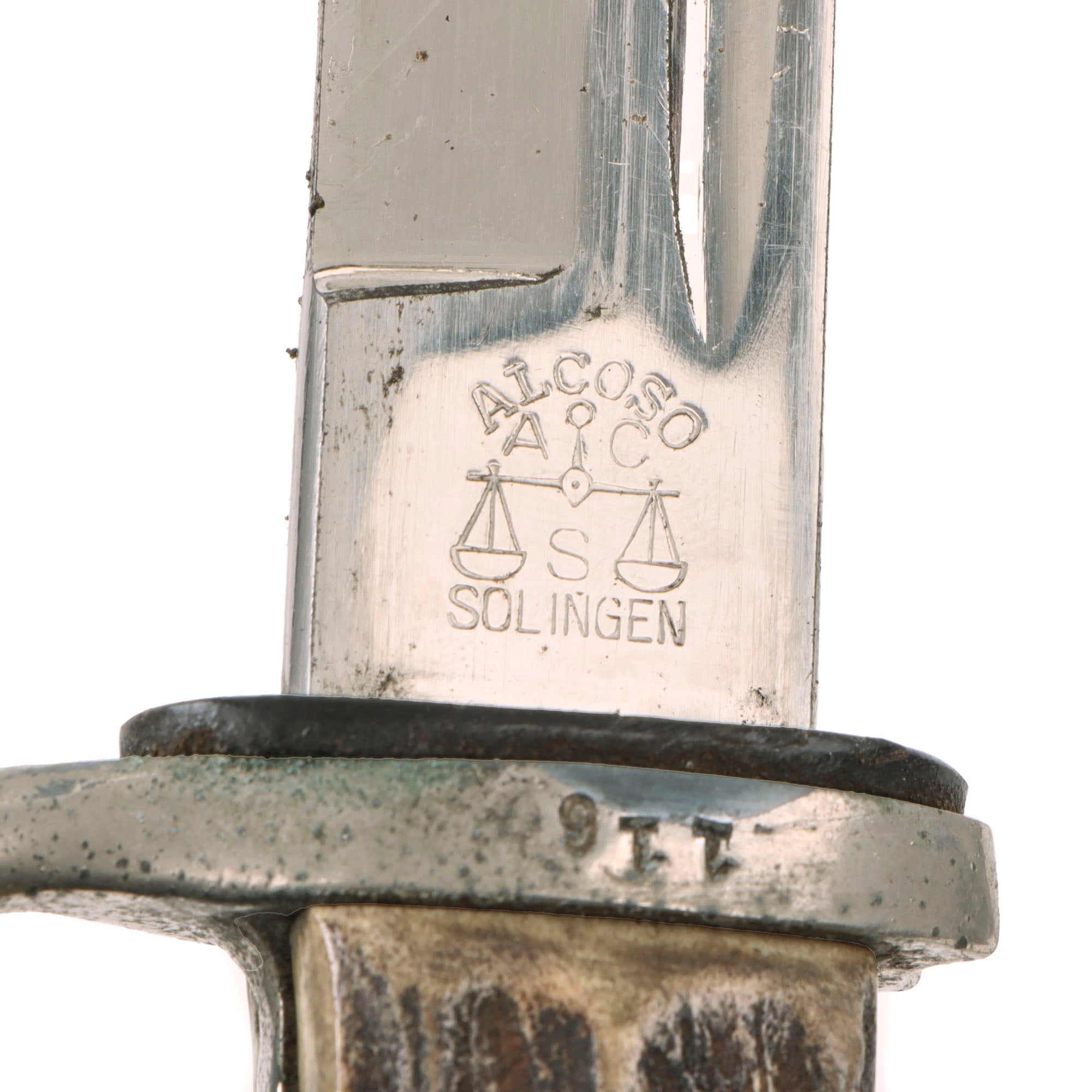 The reverse ricasso is stamped with the trademark Alcoso used in 1939-1940. It depicts the scales with the firm's initials, ACS interspersed. Above is the firm's name in an arc, ALCOSO, and below the town of business, SOLINGEN, the legendary "City of Blades" in Western Germany. This type of trademark was used on dress bayonets and swords during the Weimar republic and up through the beginning of the NSDAP era, up until around 1940, per J. Anthony Carter's work GERMAN KNIFE AND SWORD MAKERS.