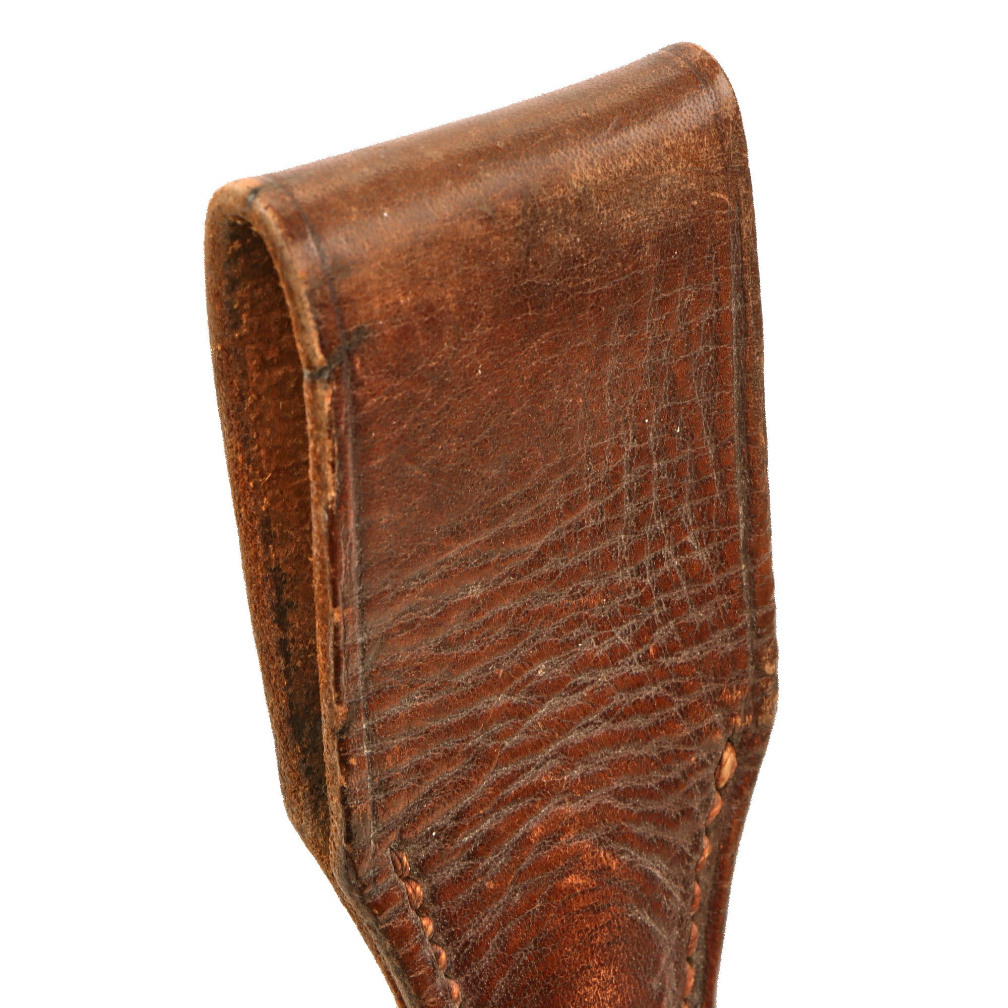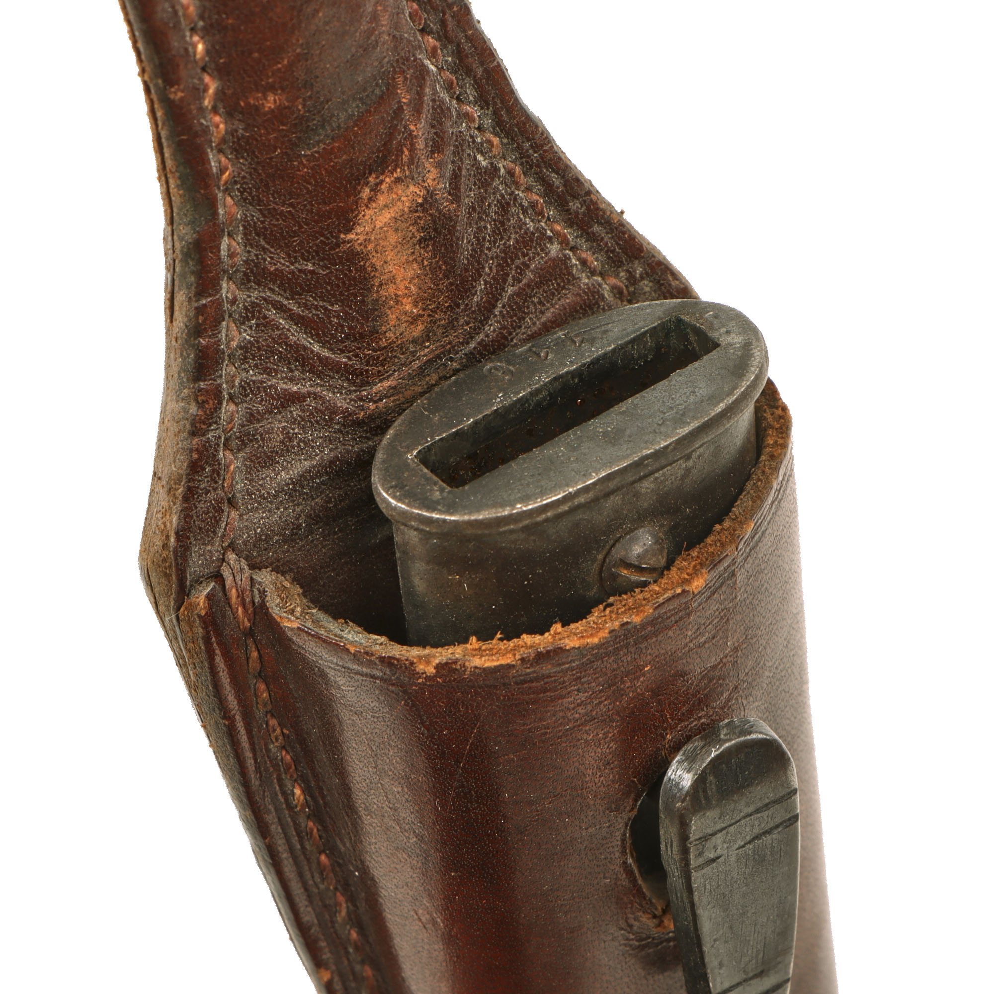 The scabbard is blued steel, much like a military issue bayonet, and the finish is very well retained, showing some wear through on the edges and back from service. There are no dents or major oxidation issues, and it fits the bayonet well. It is held in a lovely brown rural police dress frog, which still has sturdy stitching, showing some wear to the leather.