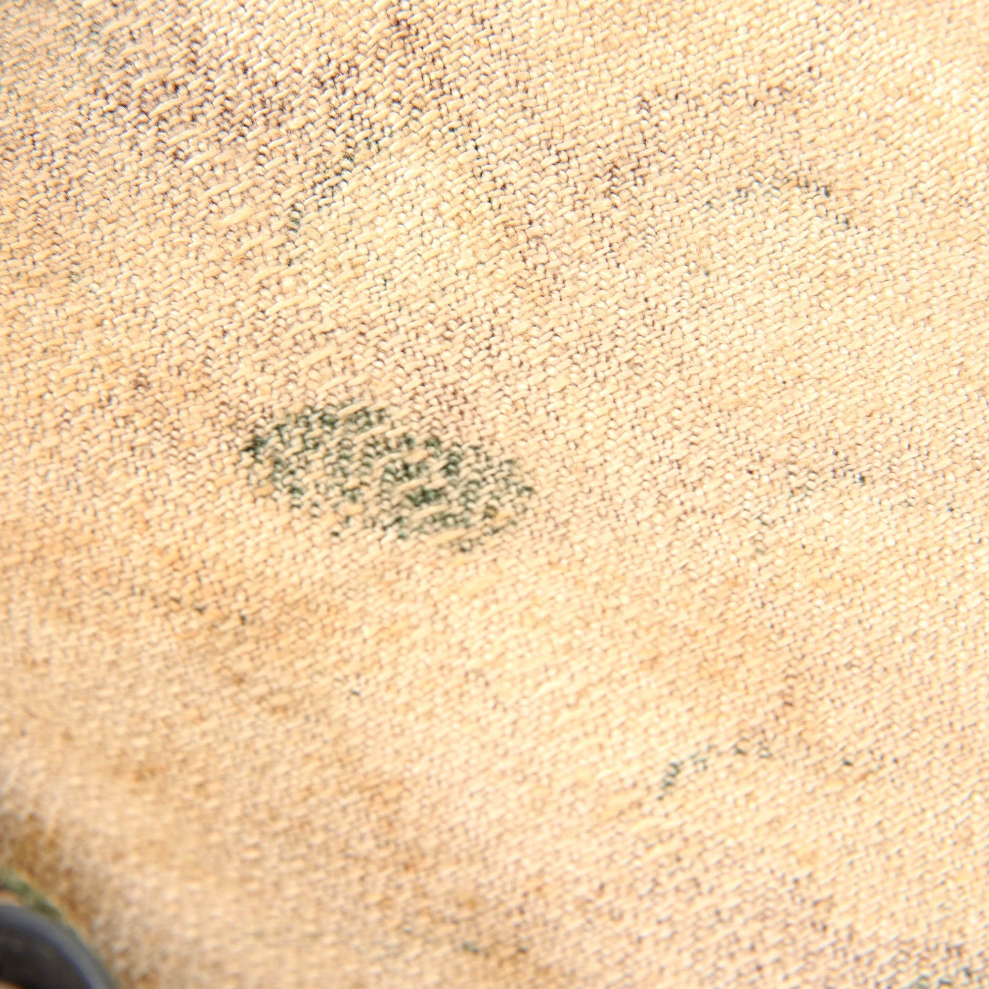 The interior of the tunic is mostly unlined, except for some tan fabric reinforcements around the bottom of the sleeves, which extend down to the belt support clip grommets. Both sides have the correct support straps for the clips, and there are even still aluminum clips on both sides! The inner right bottom of the tunic has the usual bandage pocket present, with a plastic button at the top.