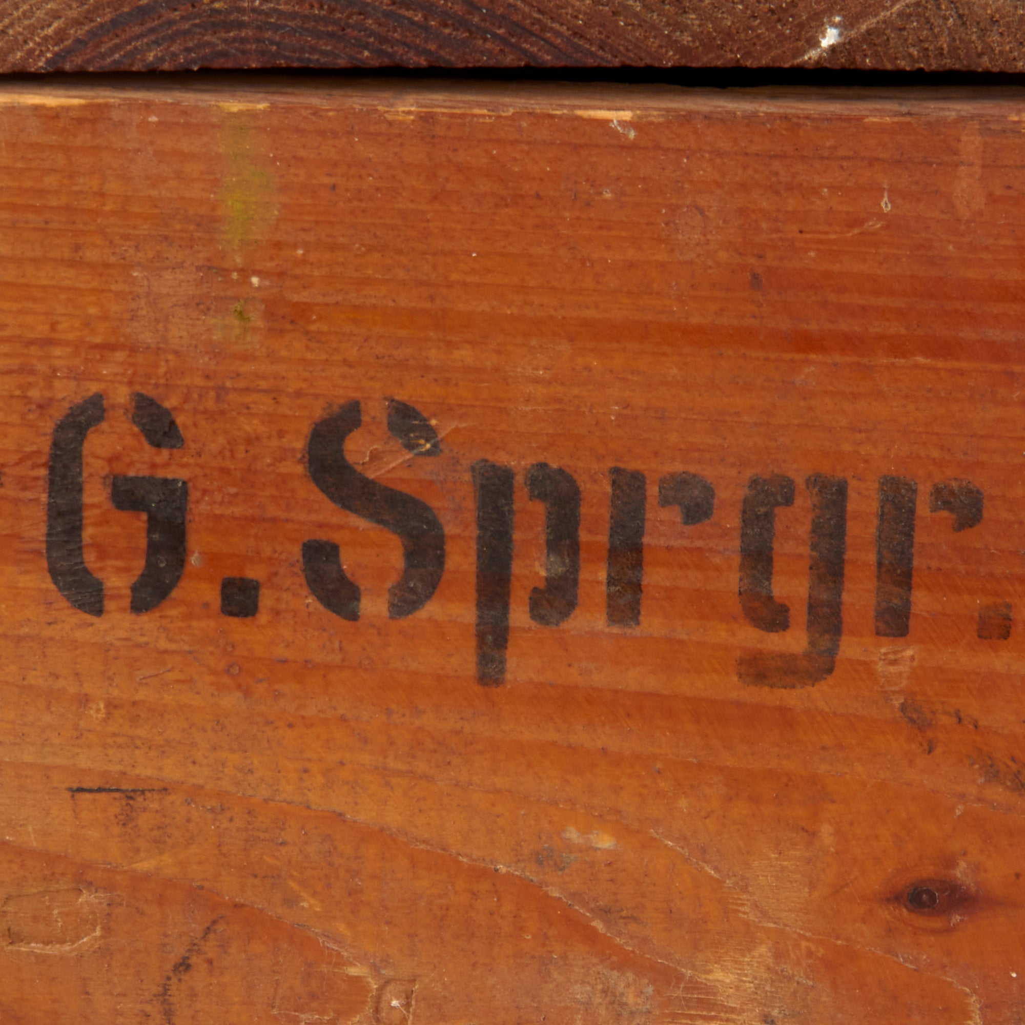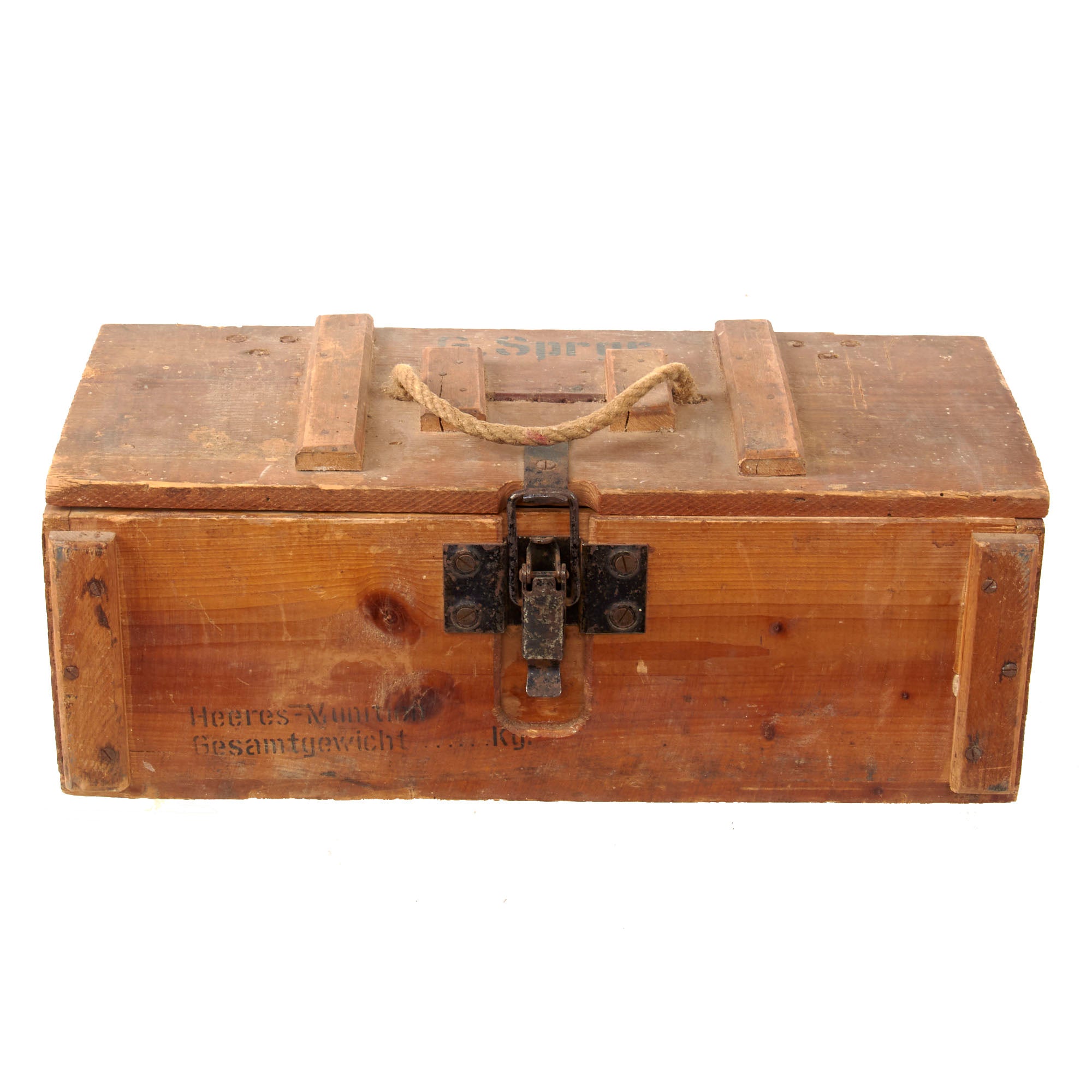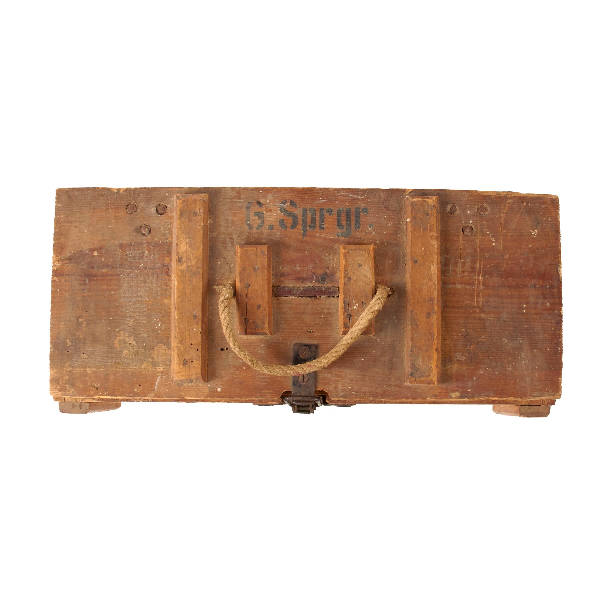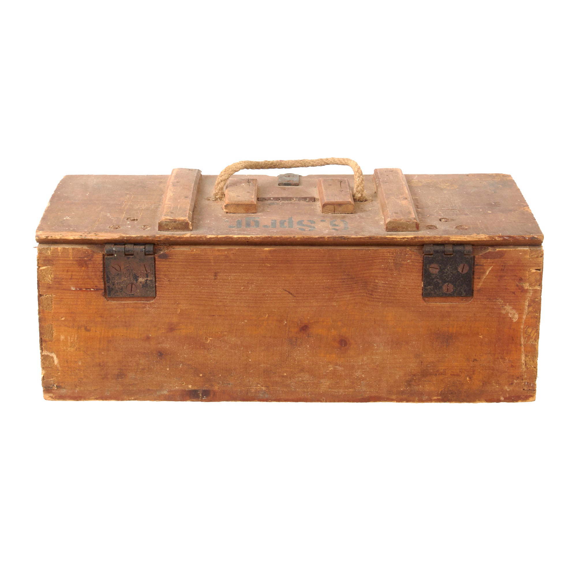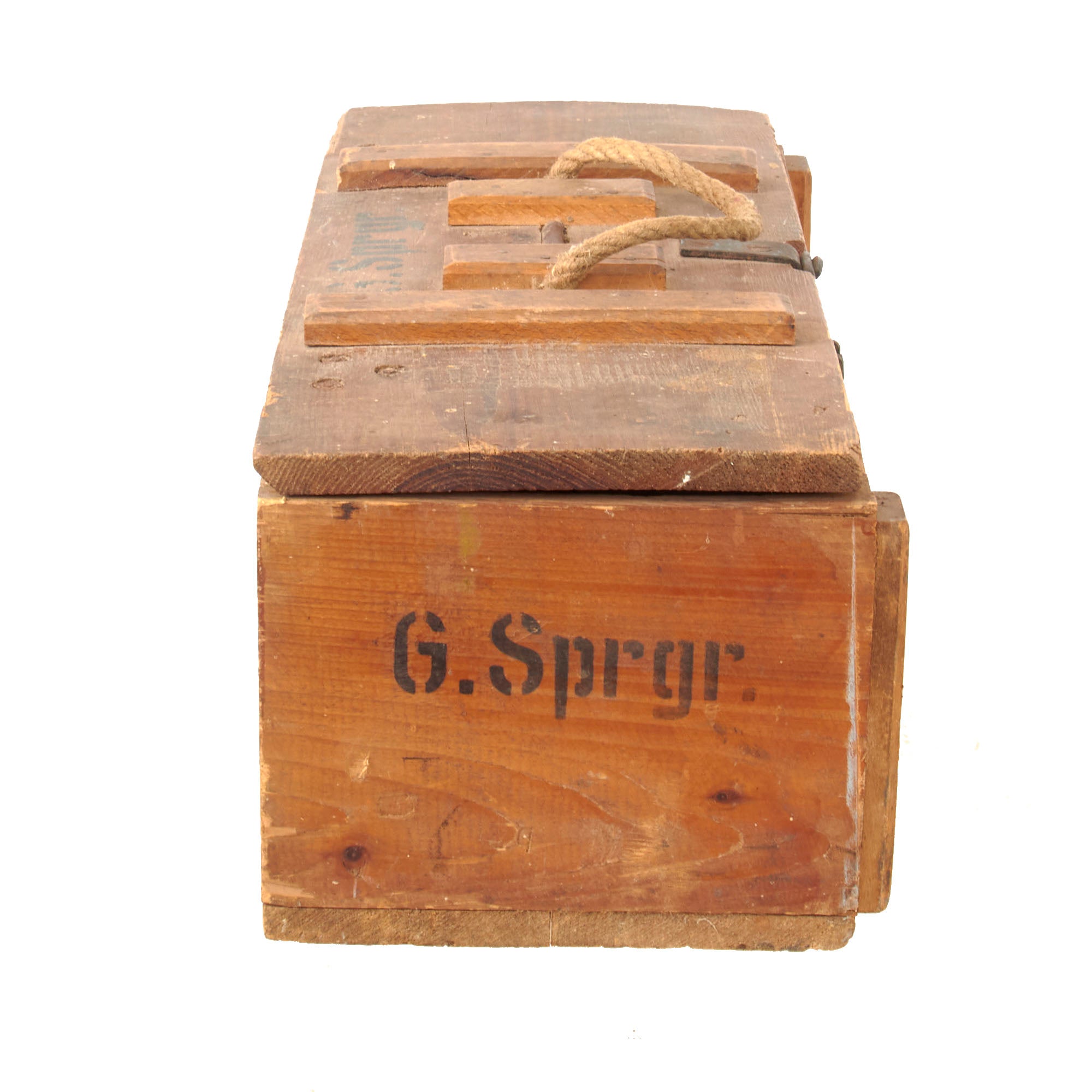 The top of the lid and one of the ends are stamped G. Sprgr. The rope handle shows heavy wear and fraying where it comes out of the top so it should be handled by its bottom.