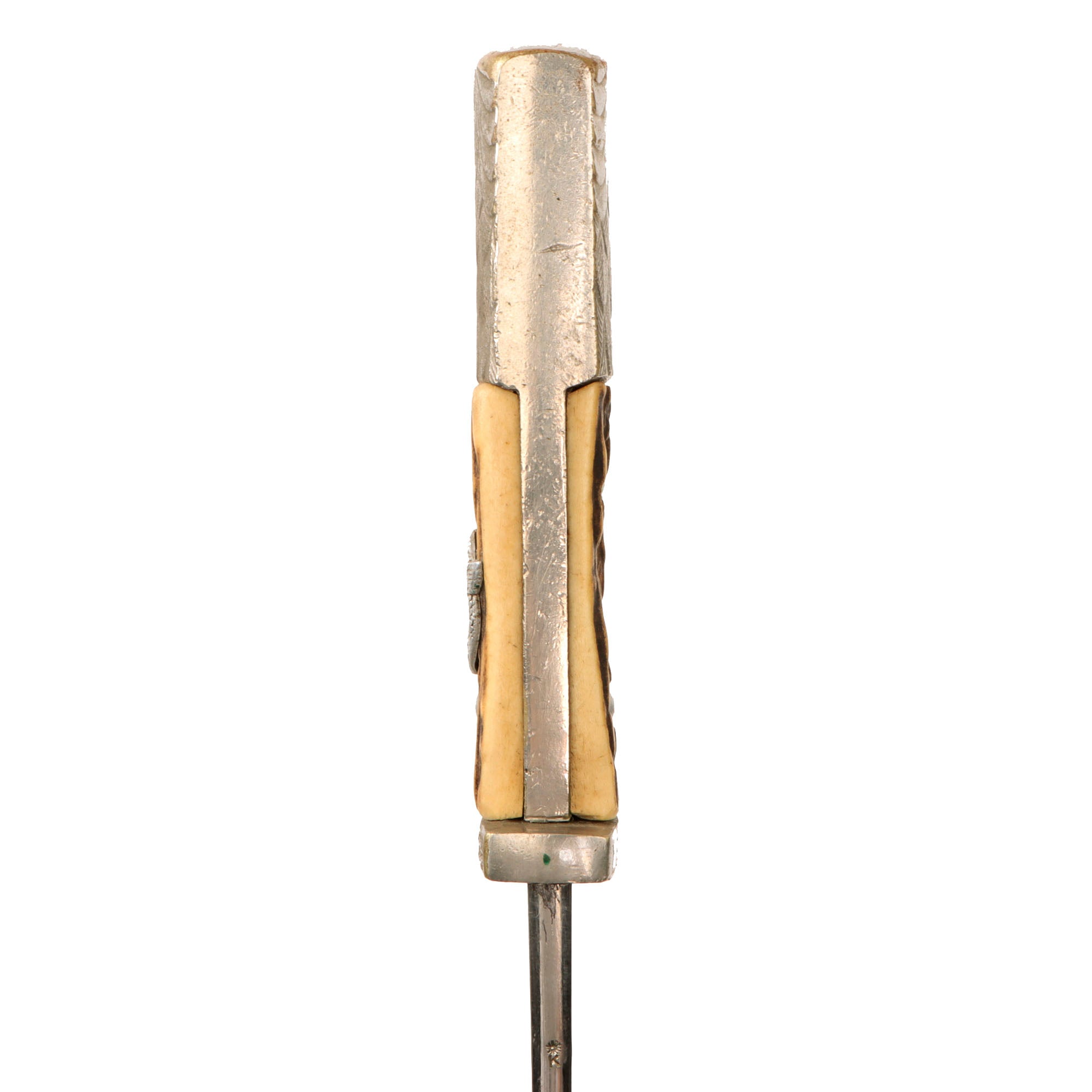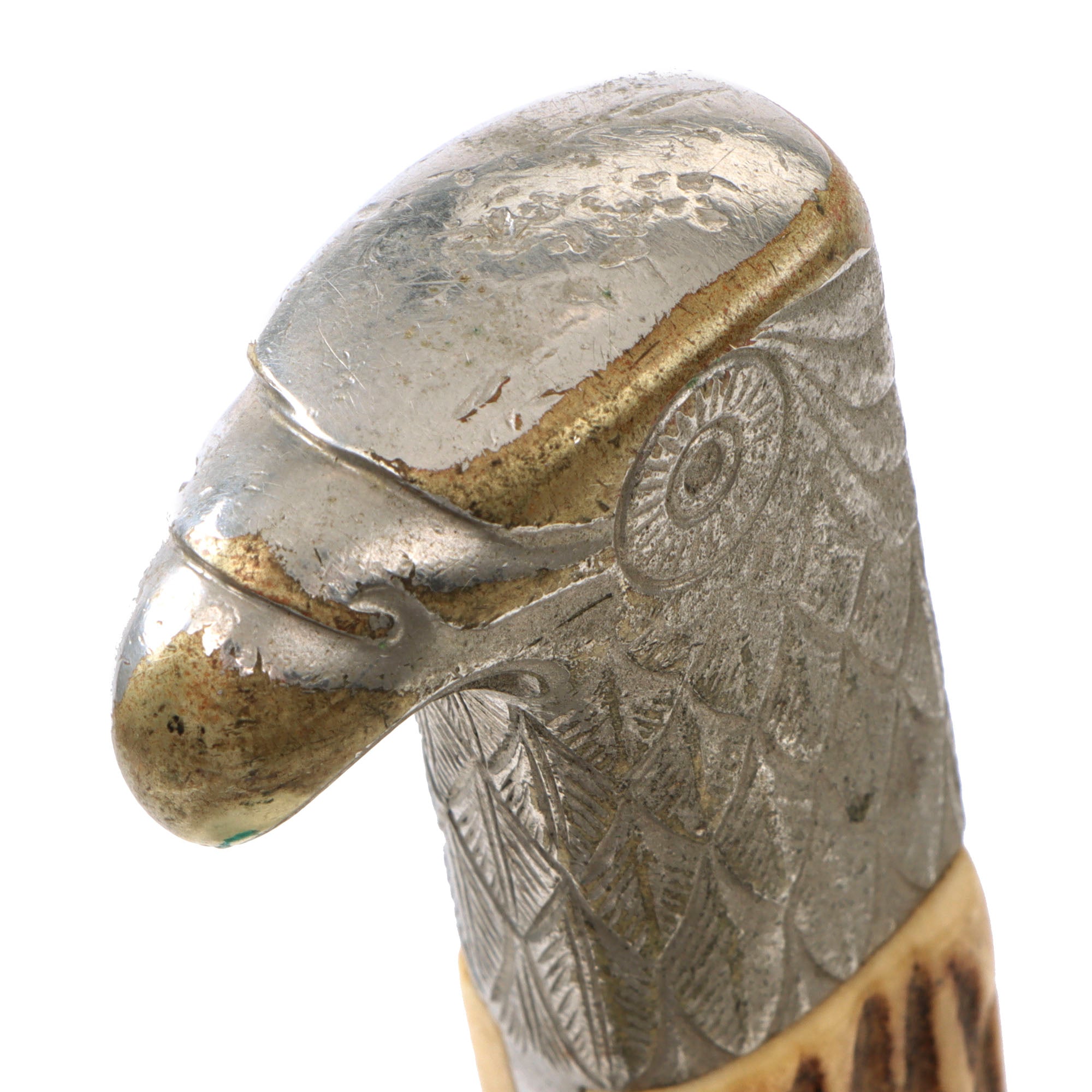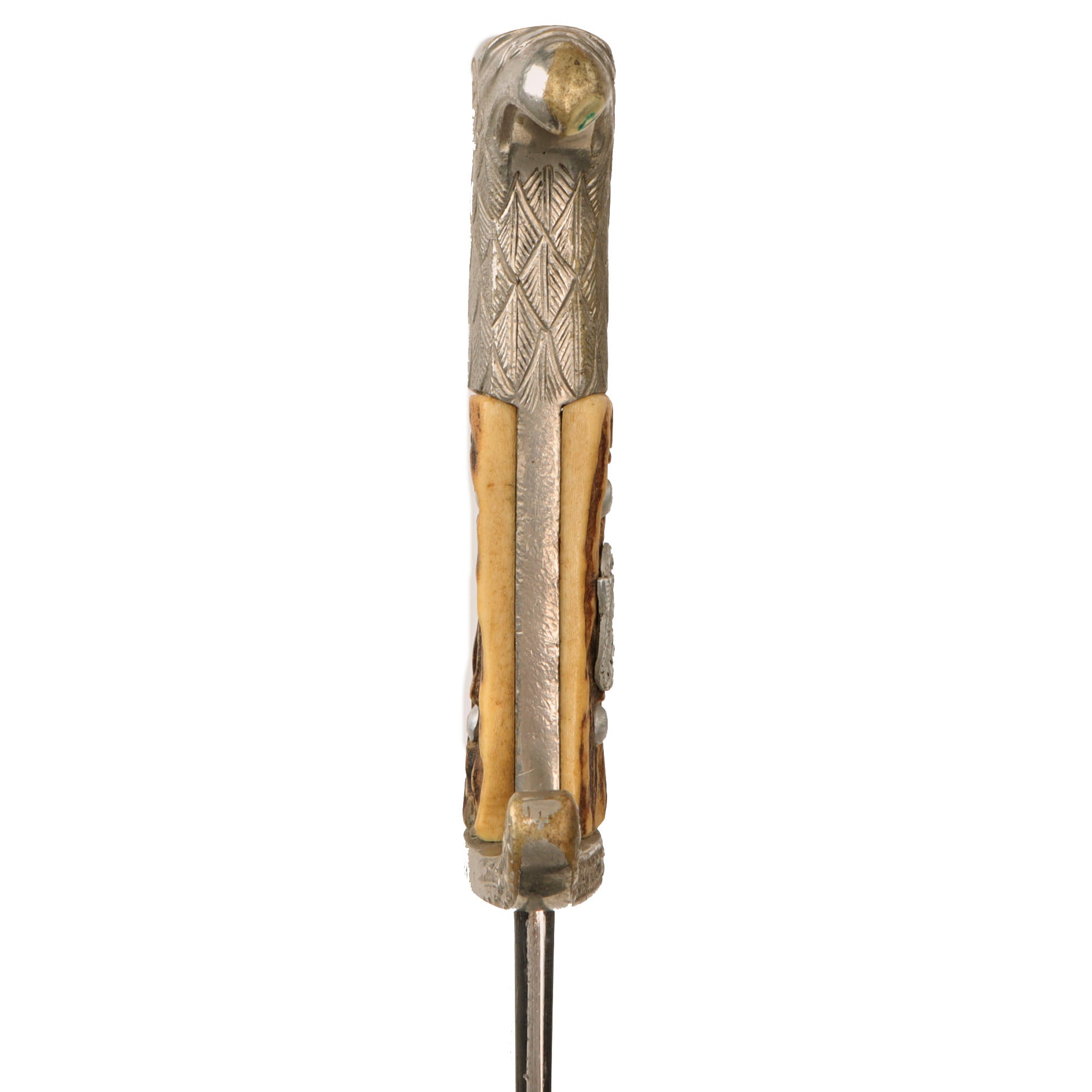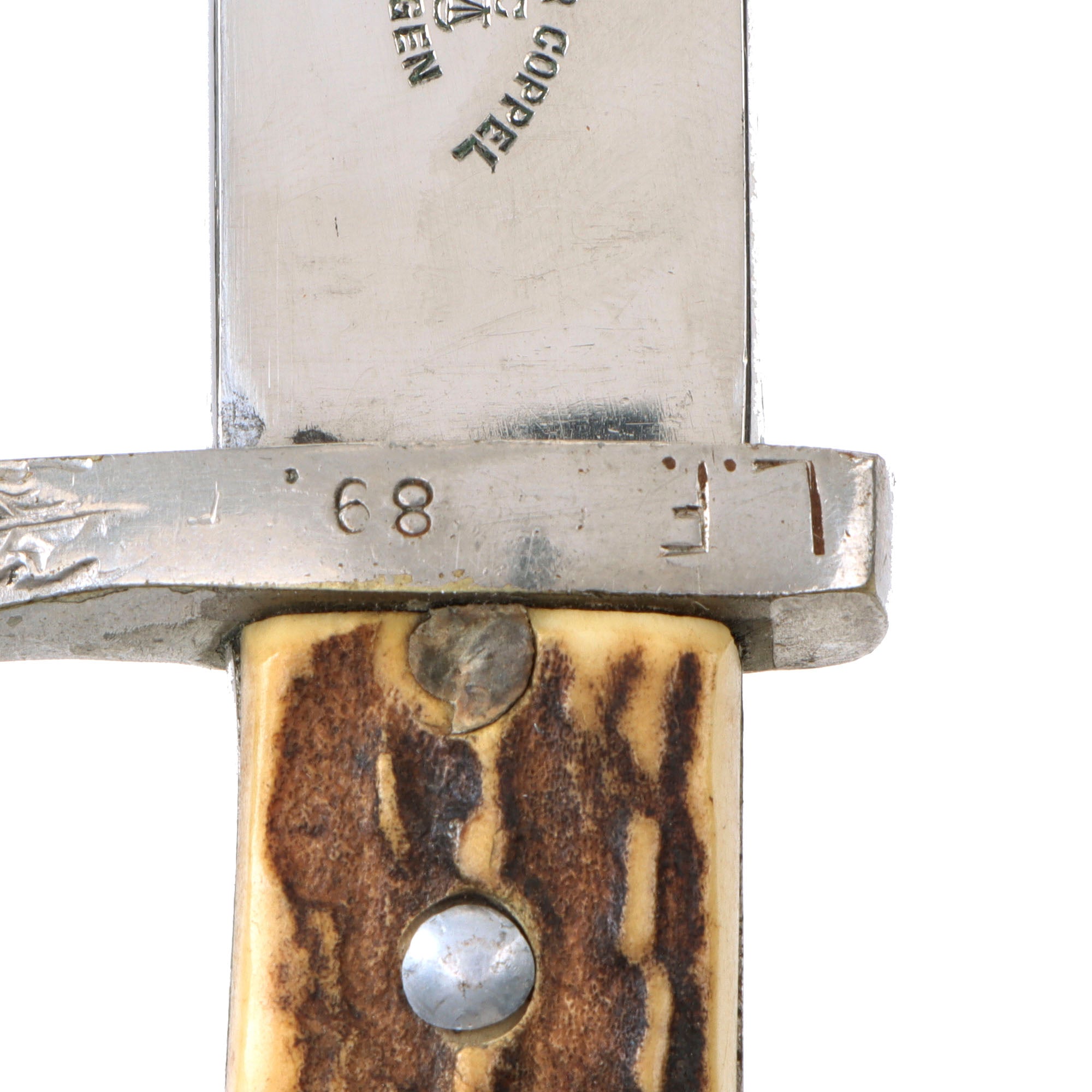 The handle of the bayonet is lovely nickel plated brass alloy, featuring a very nice decorated "Birds Head" pommel without a bayonet slot, and an upswept cross guard decorated with oak leaves. The grip scales are made of beautiful stag horn with an aluminum police insignia firmly attached on one side. These are held with solid aluminum rivets and show no wiggle at all. Both cross guard and eagle’s head are in very good condition, with most of the original nickel plating still intact, showing wear and light oxidation where the plating has worn away on the ends of the pommel and guard.