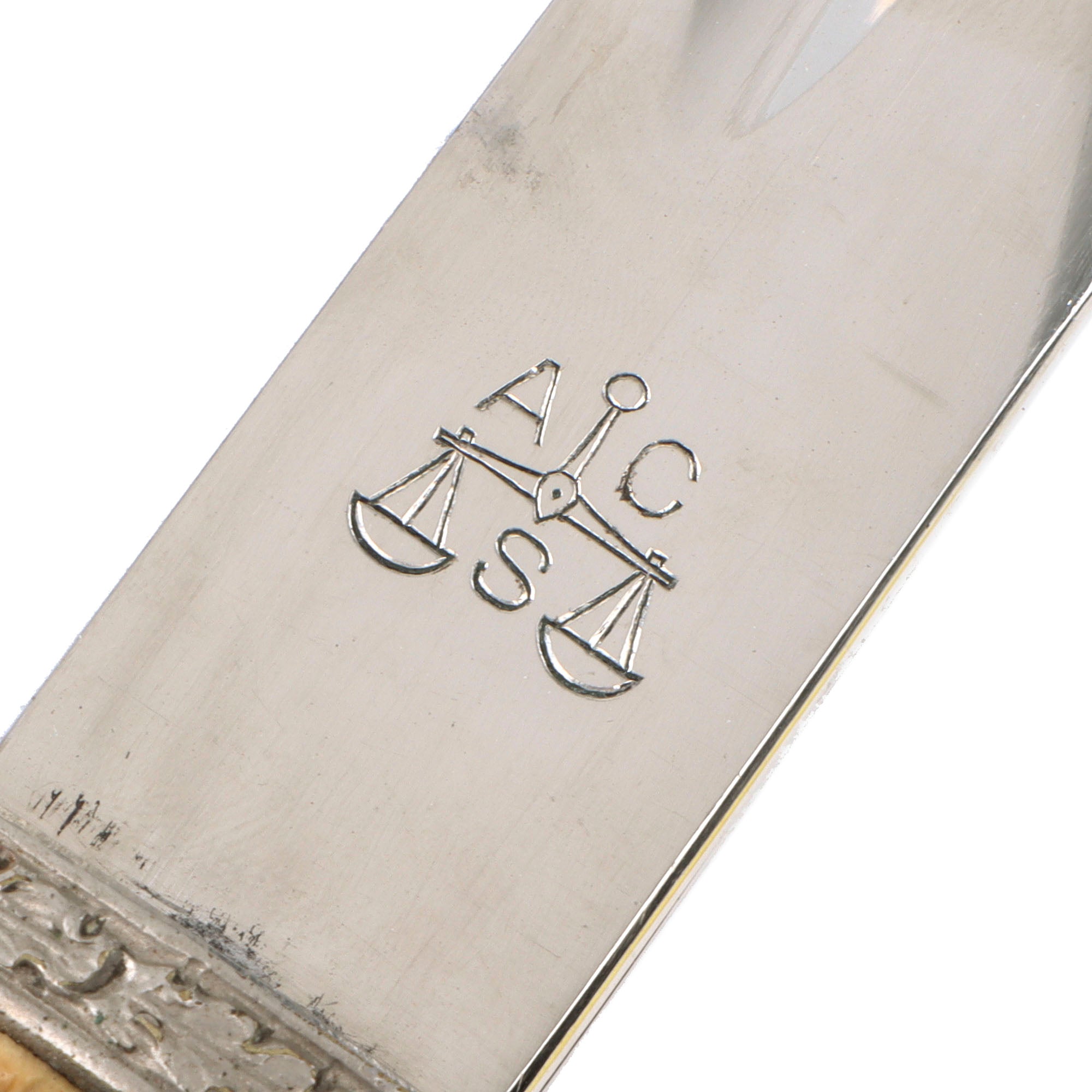 The blade ricasso is maker marked ALEXANDER COPPEL / SOLINGEN in arcs surrounding the firms trademark scales logo, with the firm's initials ACS interspersed. The same trademark scale logo, only larger, is present on the other side of the blade. This type of trademark was used on Police and other dress bayonets during the Weimar republic and up into the beginning of the NSDAP era, up until around 1940, per J. Anthony Carter's work GERMAN KNIFE AND SWORD MAKERS.