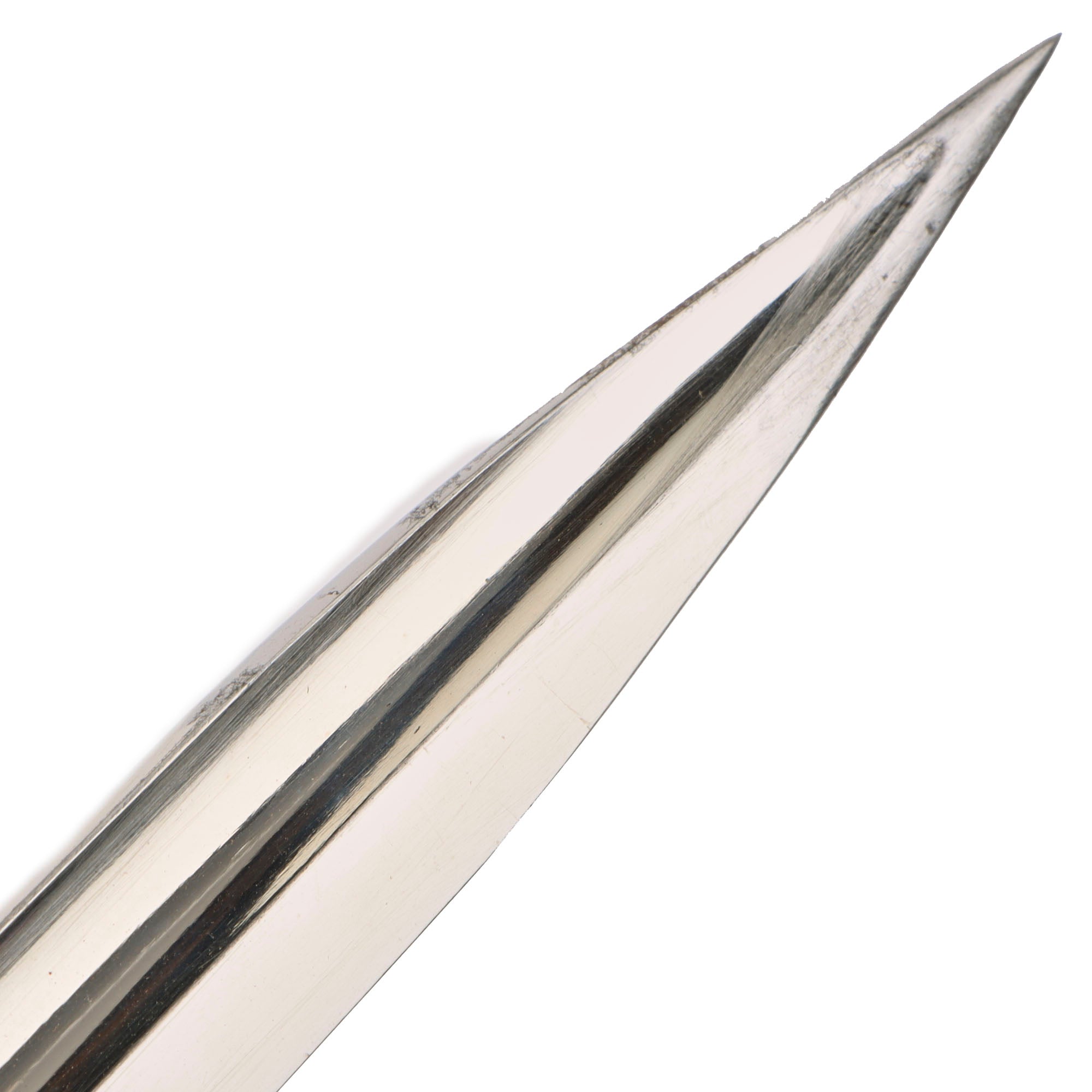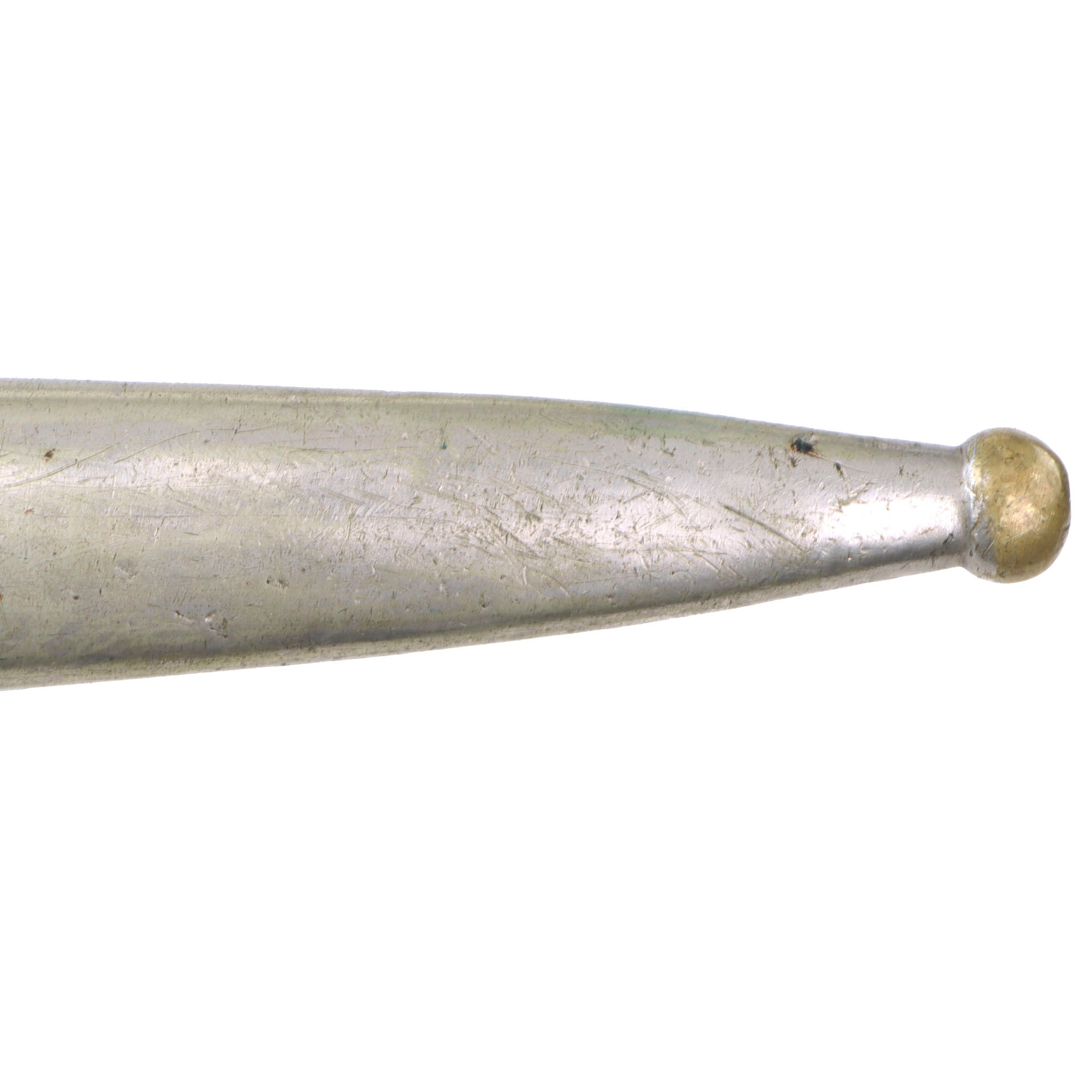The bayonet has a lovely approximately 33 cm (12.75 inches) long nickel plated steel blade, which was forged "cut-down" style, with the fuller running to the tip. We did notice that the tip of the blade is very pointy, more of a spear shape than the leaf shape usually seen. Blade is nice and bright, of excellent quality, and still has over 90% of the original nickel plating, with just a bit of wear through and oxidation speckling. There is definitely wear through from cleaning near the tip, and there is also a bit of oxidation on the edge near the middle of the blade.