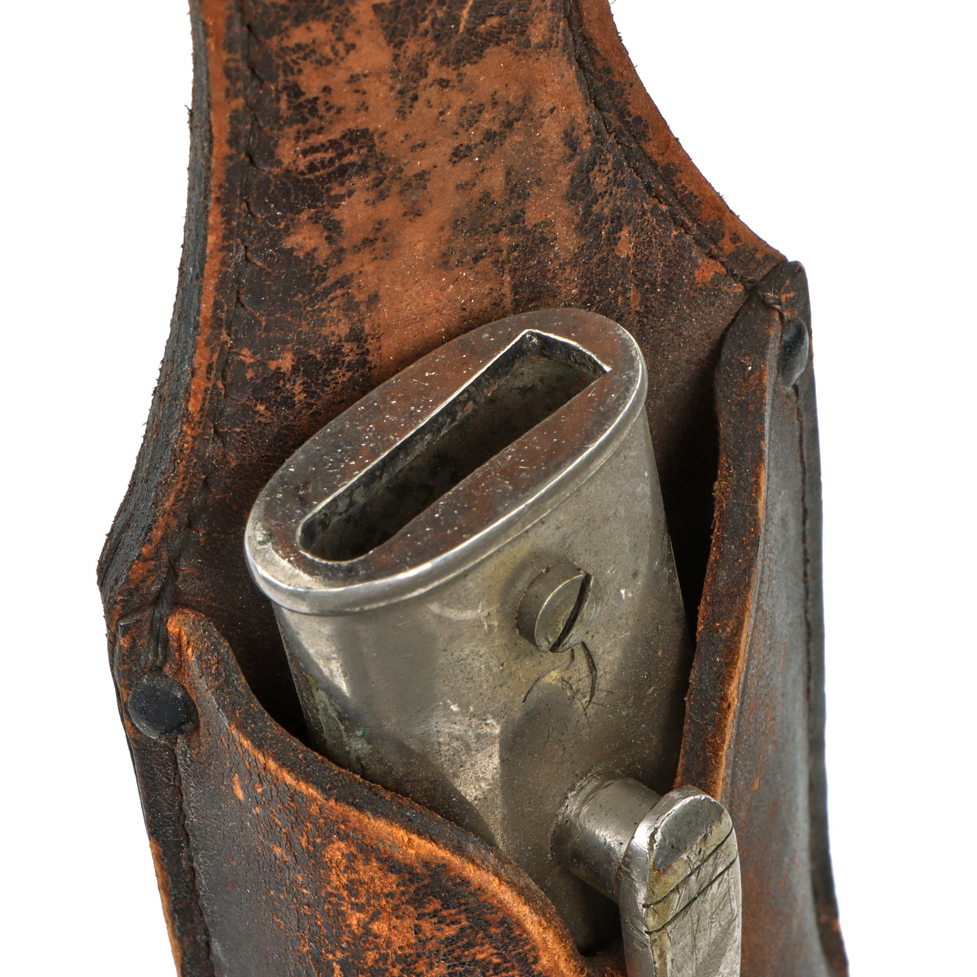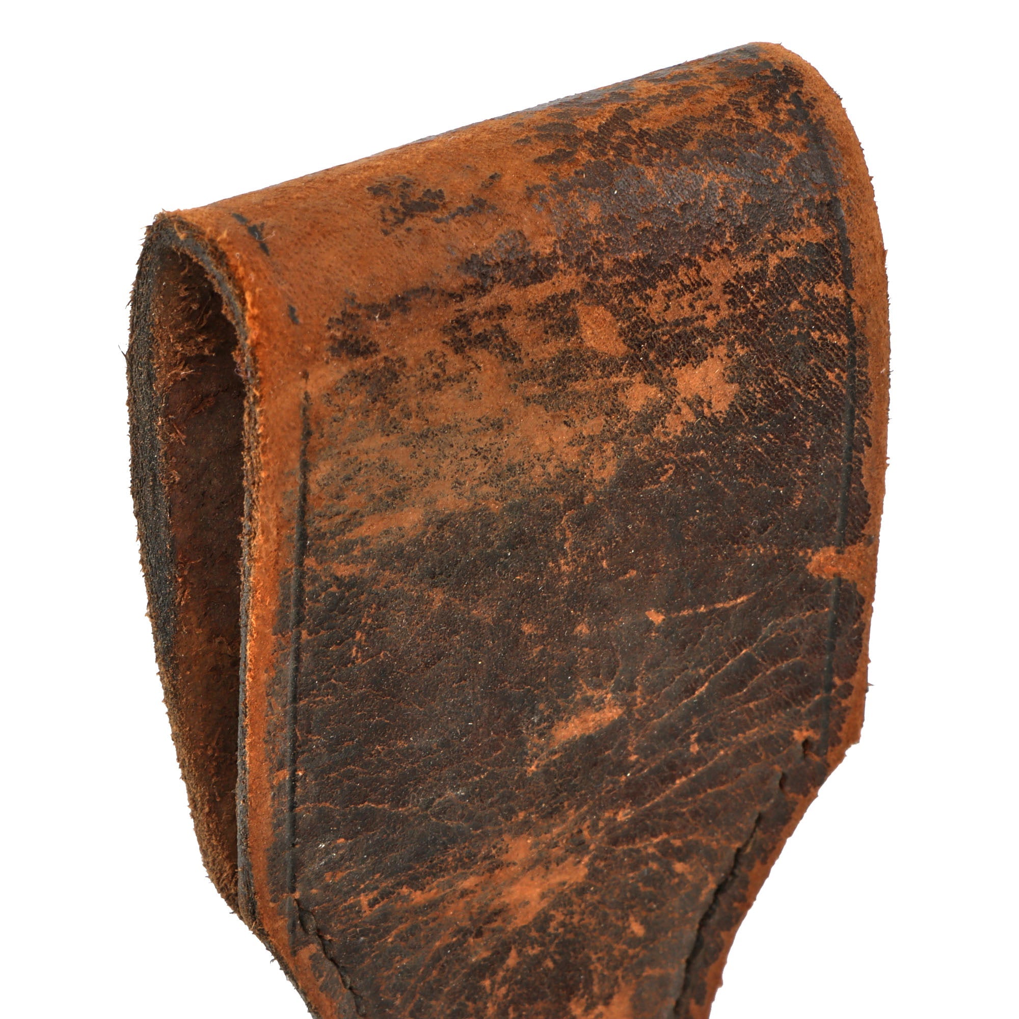 The scabbard is made of fine brown leather, fitted with heavily nickel plated brass alloy, and is in very good service used condition. The leather does show age and staining to the finish, but is still pliable, and the ripples in the leather are due to the spring steel throat inside the scabbard. The fittings show some plating loss and wear, but still present very nicely. The brown leather frog looks like it may be intended for a "butcher" style 98/05 bayonet, as it is quite wide. The leather is in good condition, showing wear, and the stitching looks to be fully intact.