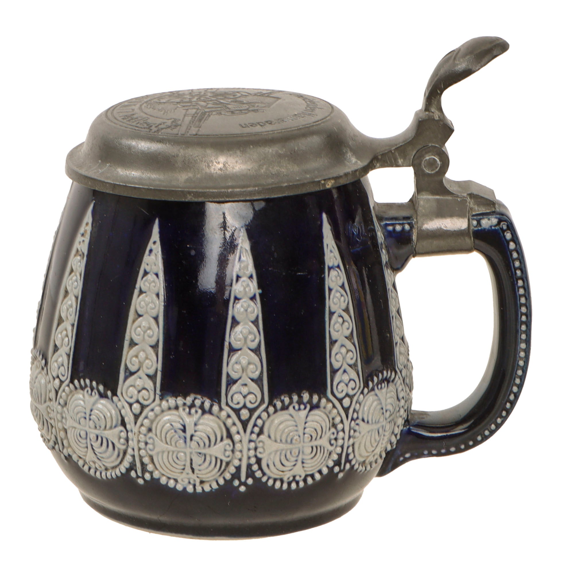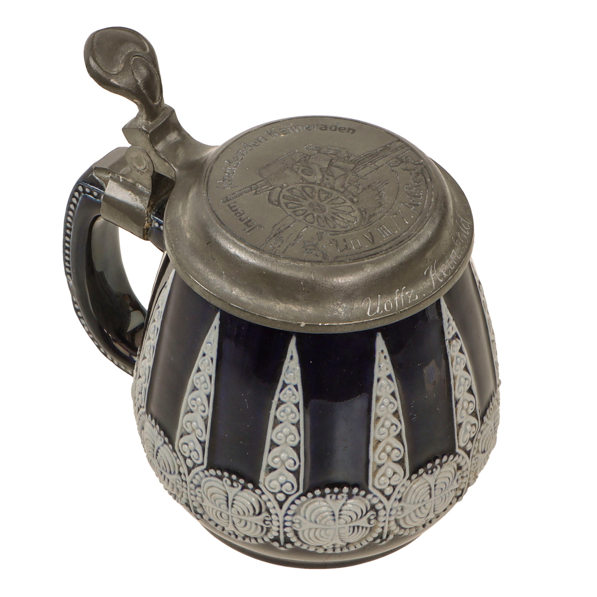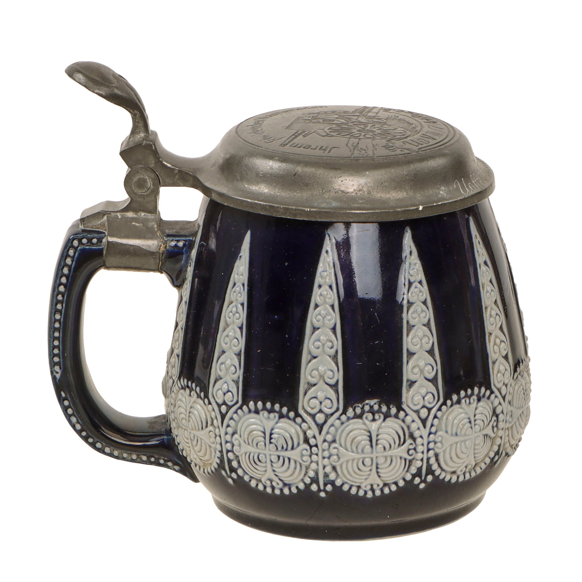 During the build up to WWII, Steins once again gained popularity, though they were generally much more utilitarian than the ornate steins made prior to WWI. They were shorter, with much less ornate glaze, and did not have the level of fit and finish seen earlier. However they were just as cherished by the owners who purchased them to commemorate their service.